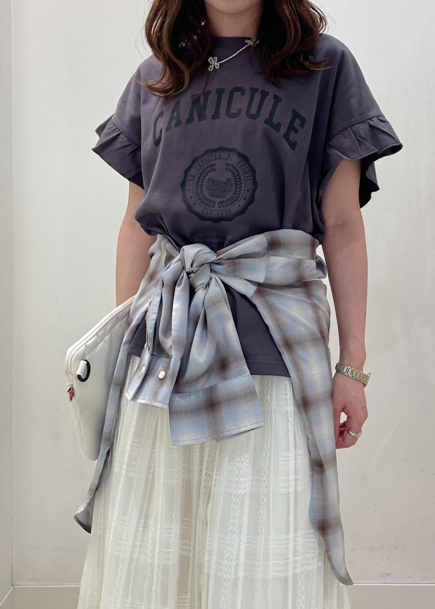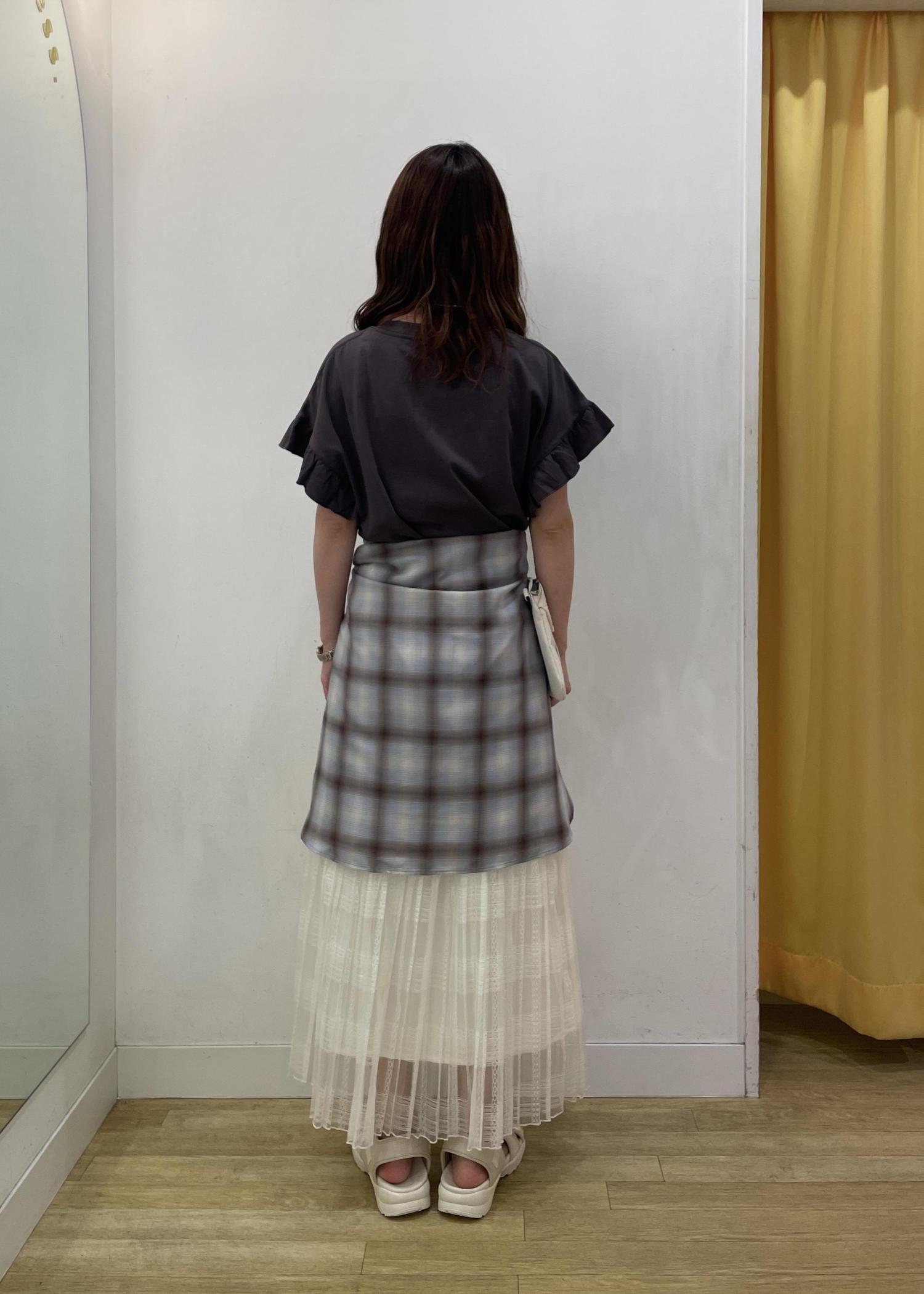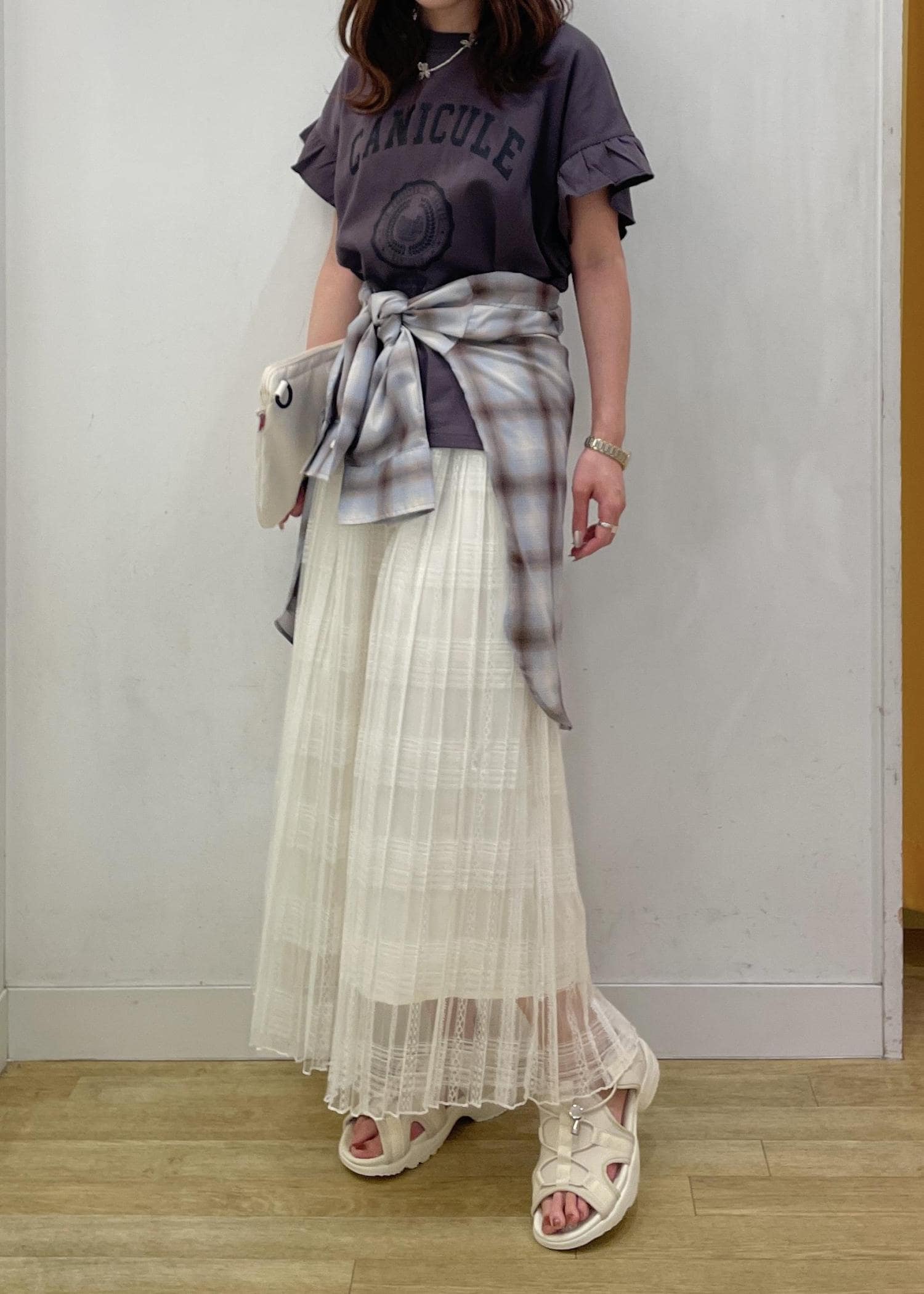 お袖のフリルが可愛いTシャツにシアースカートを合わせました♡