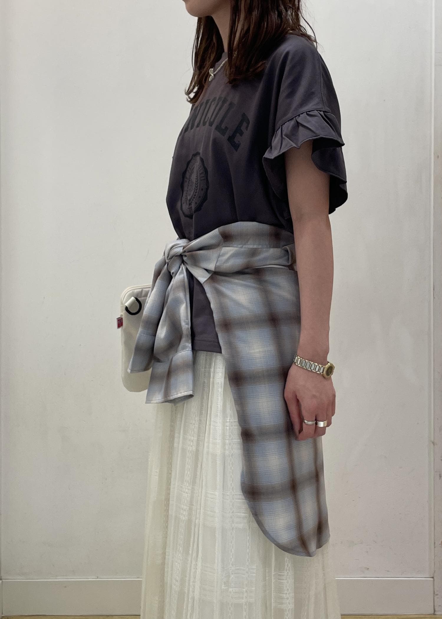 全体的に甘めだったのでTシャツを腰巻きしカジュアル感をプラスしトレンド感のあるコーデに☺︎