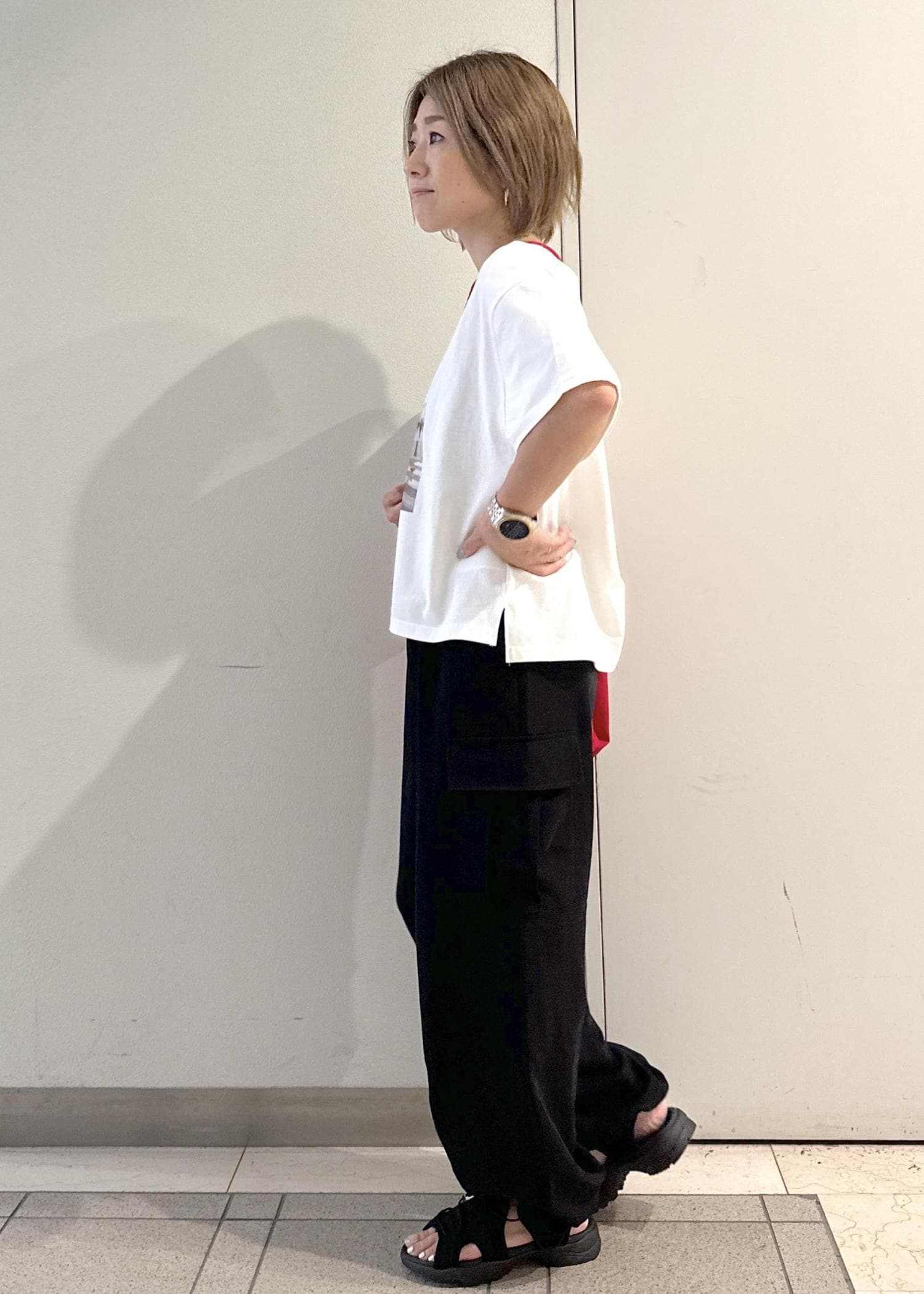 裾はお好みで絞れるので、コーディネートに合わせて変えると印象も変わります。 -