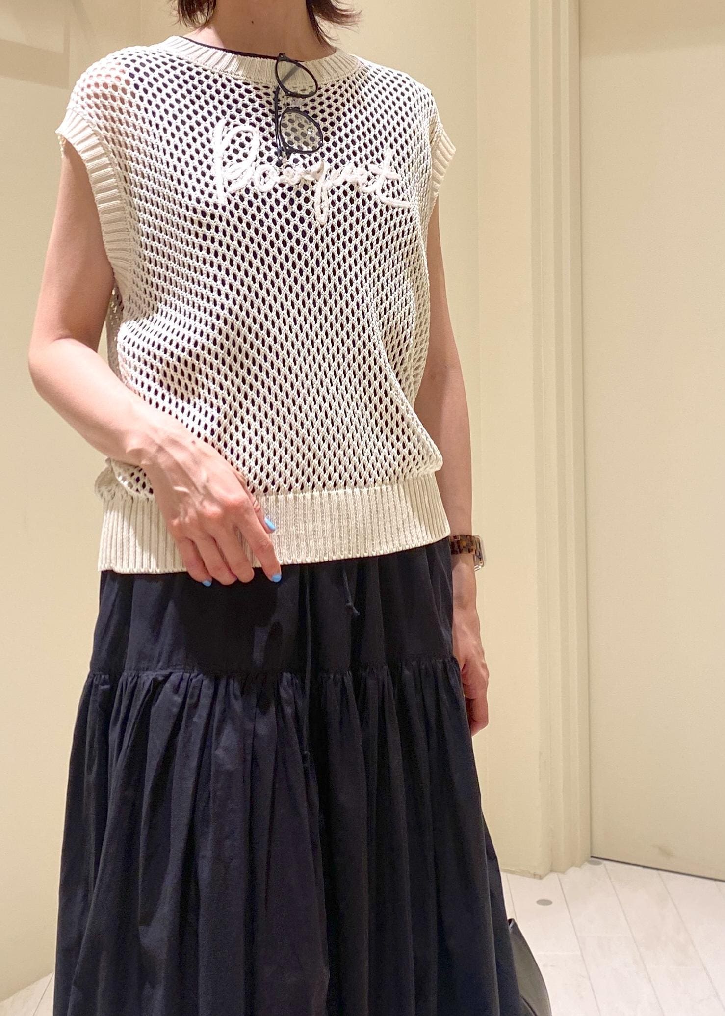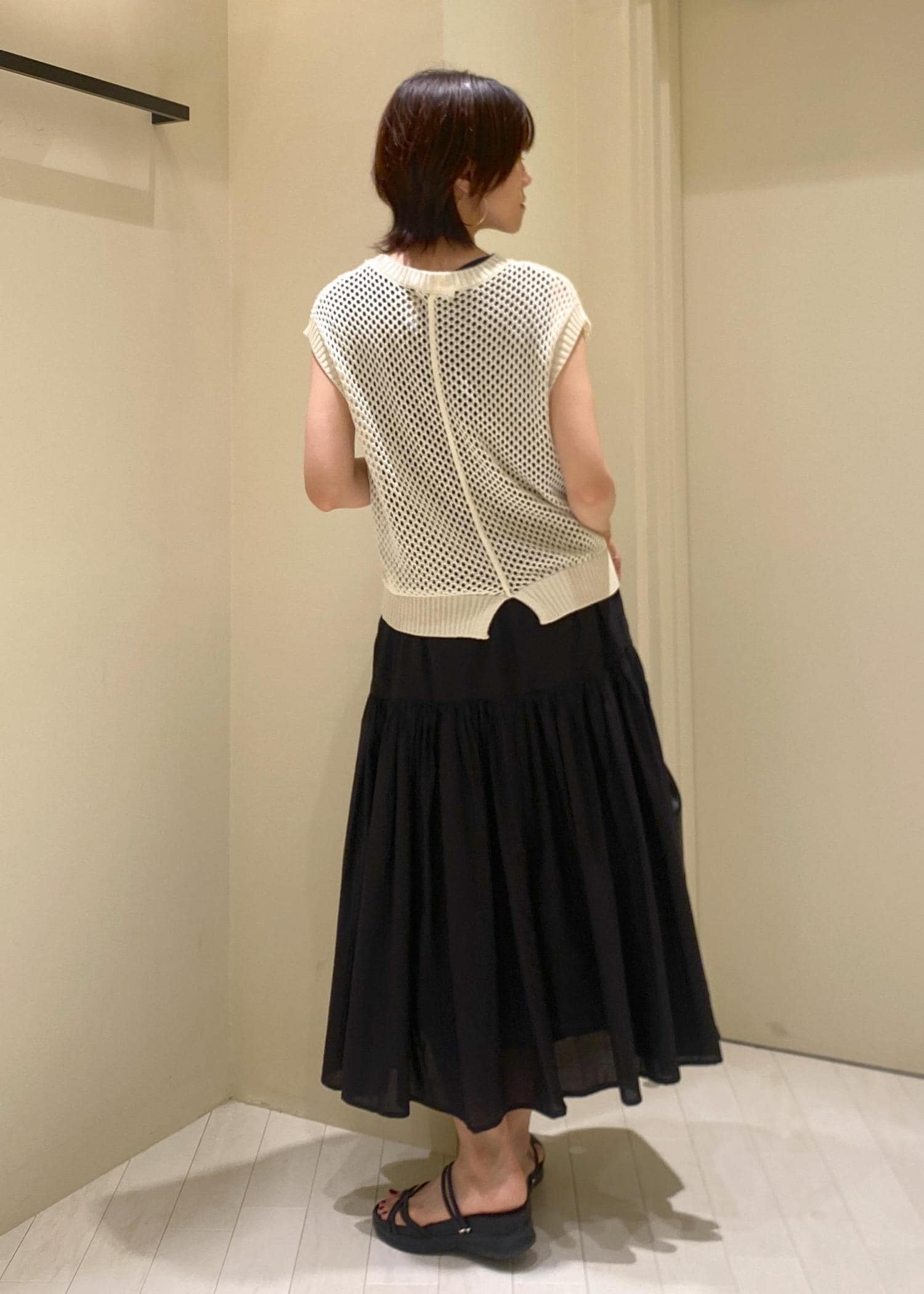 レイヤードスタイルが映える透かし編みが、スタイリングの主役になります。