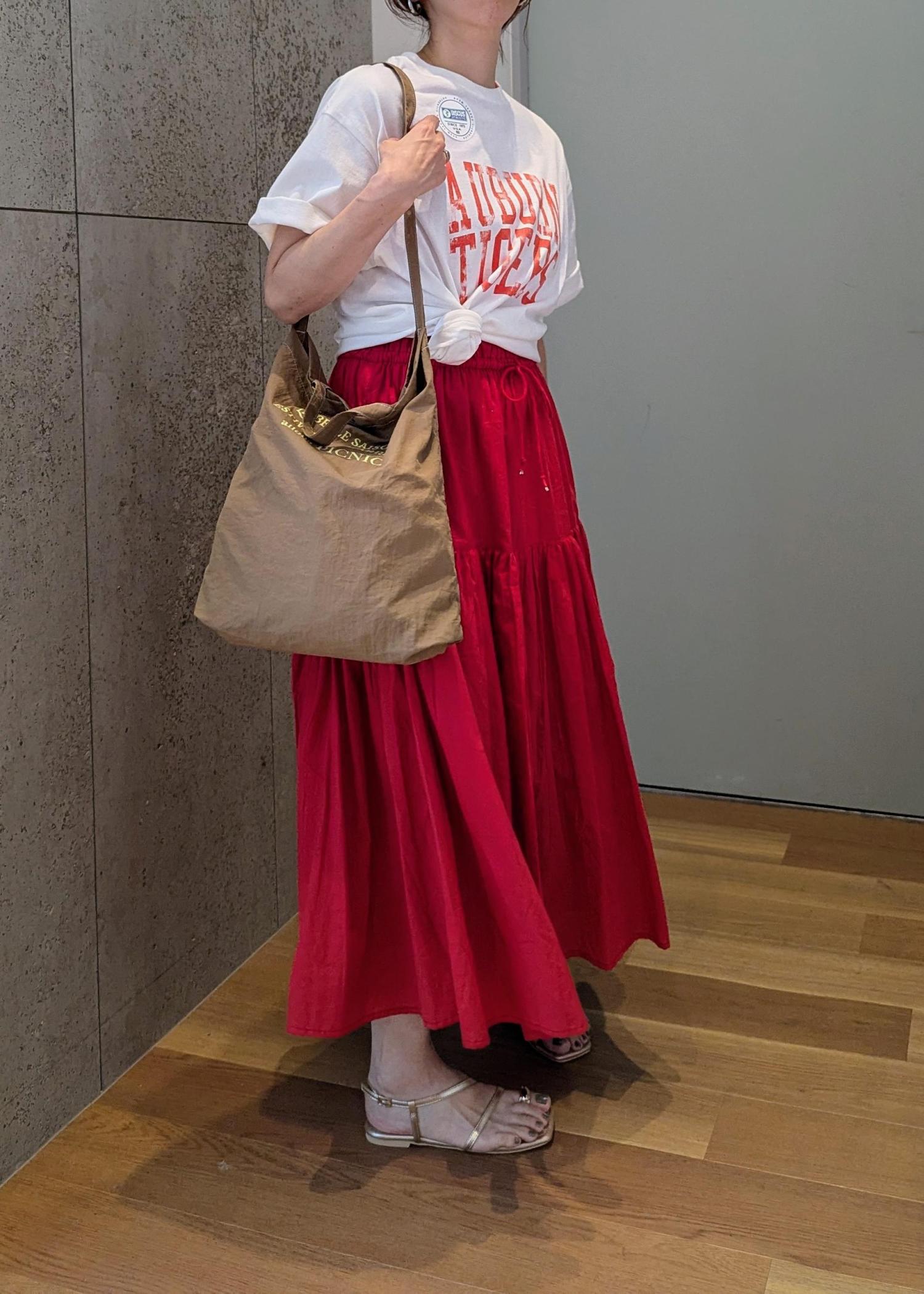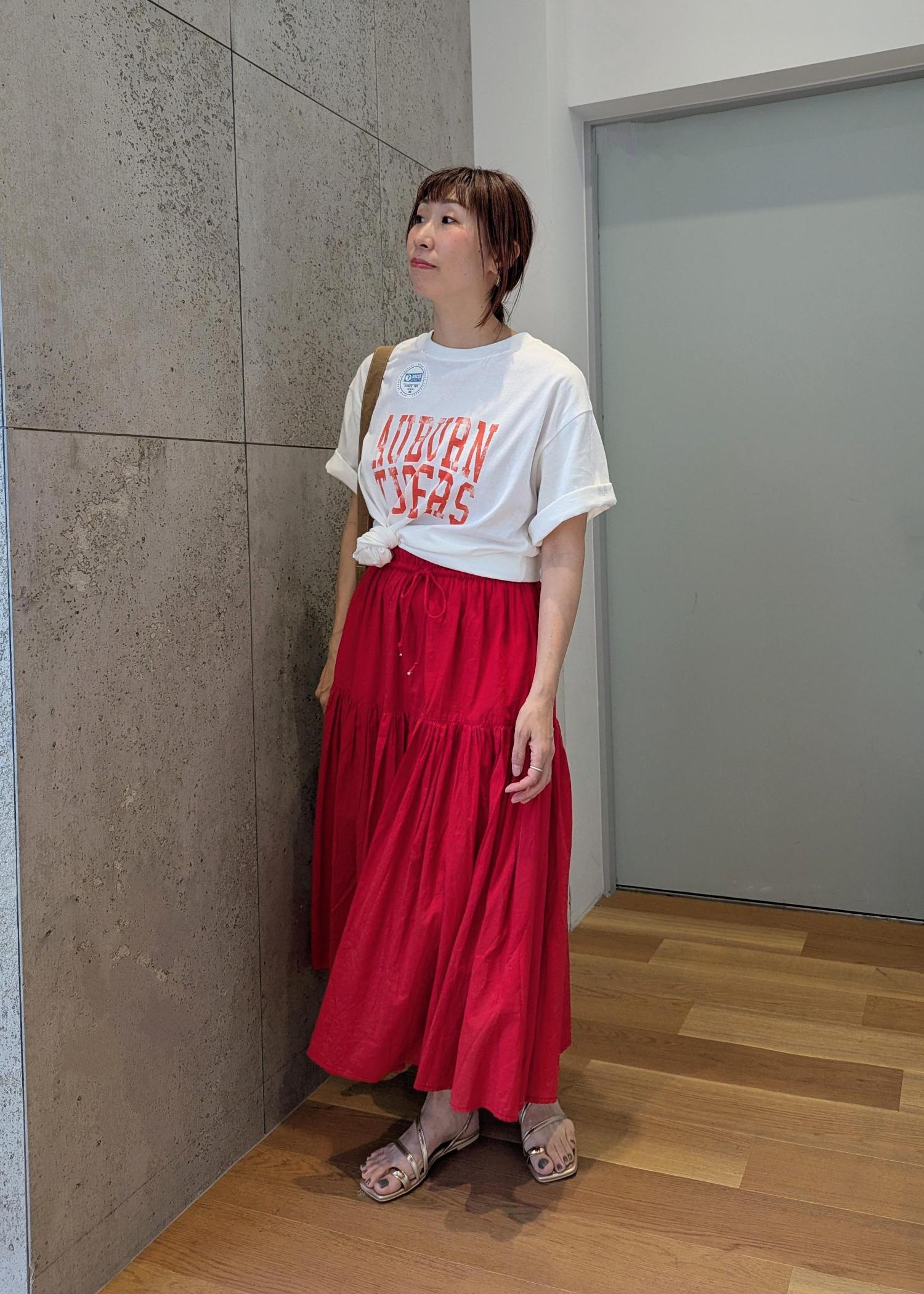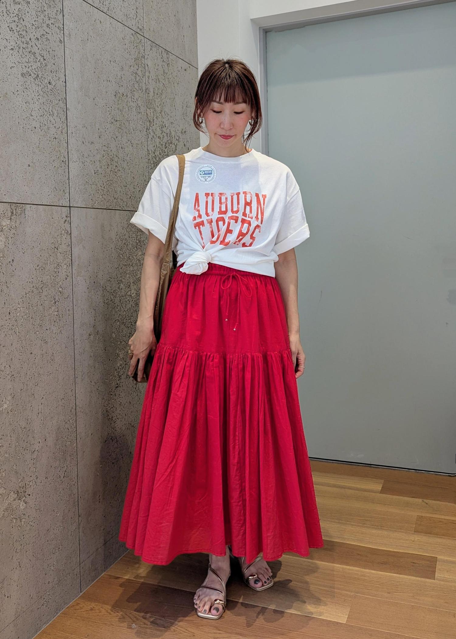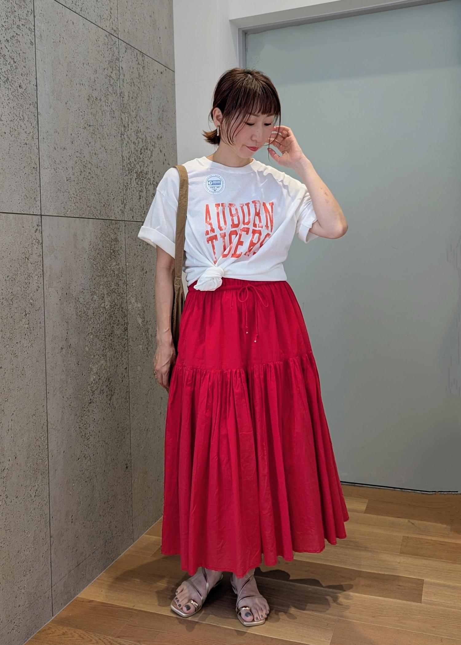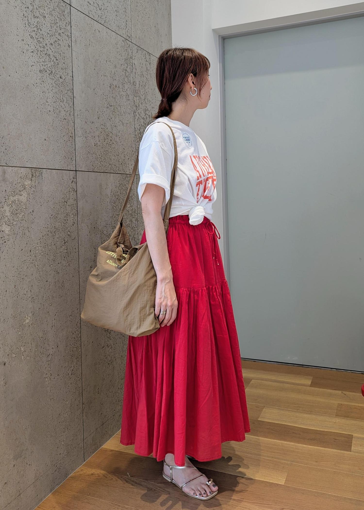 カジュアルなTシャツをレイヤードしたリラックスコーデです。カラーが効いててかわいいので水辺のレジャーや推し活にもオススメです。小物を少しキレイめにするとタウンユースにも◎