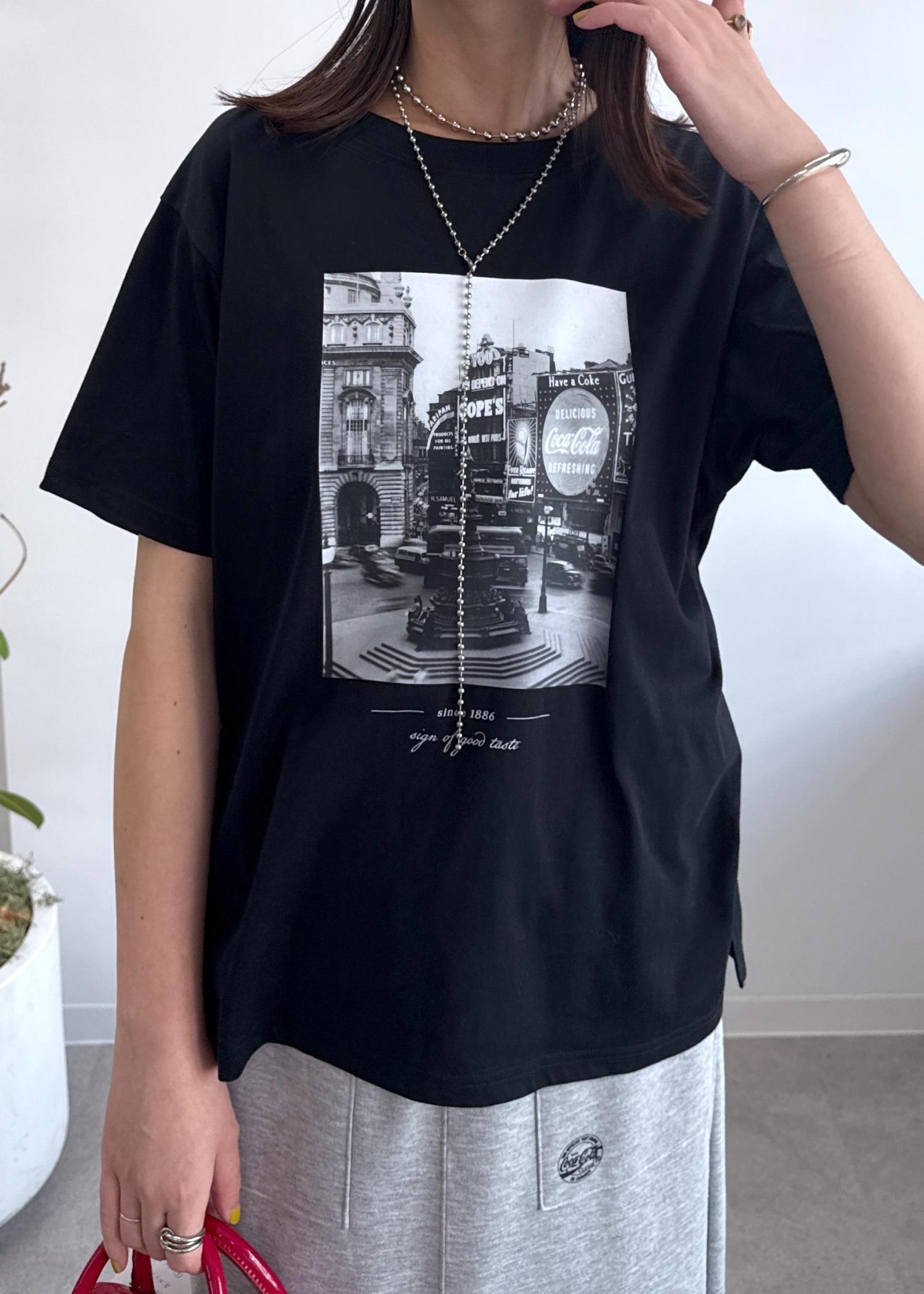 ゆとりのあるサイズ感で腰が隠れる着丈です。街並みを臨むフォトプリントがモードな雰囲気にしてくれます。生地感は薄過ぎず通年着られる厚みです。