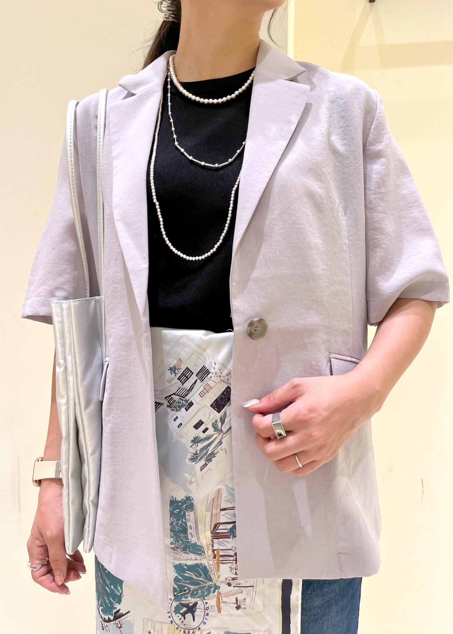 オンオフ兼用出来る半袖ジャケットできれいめにまとめたデニムコーデ。