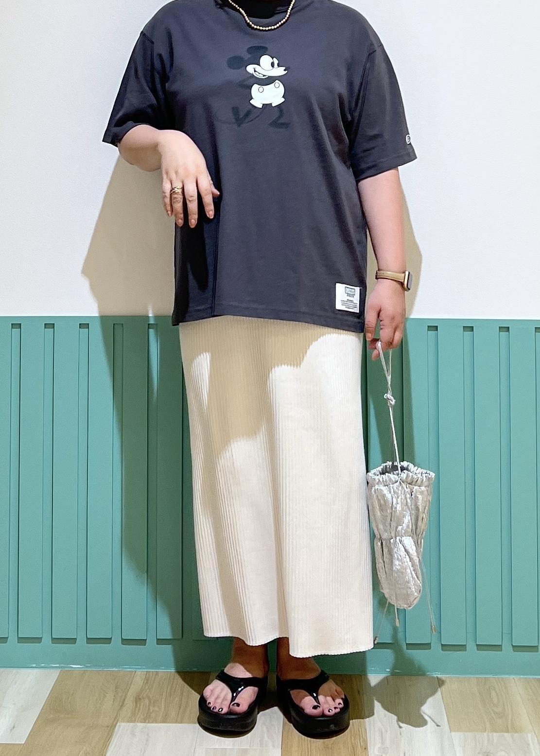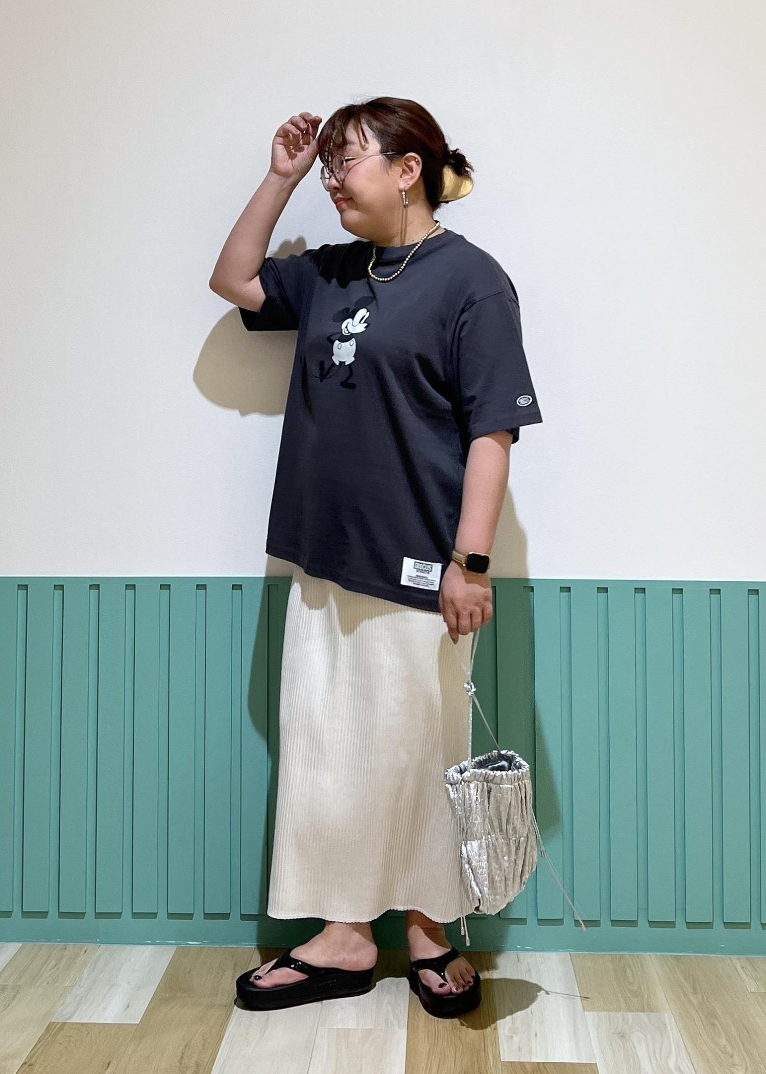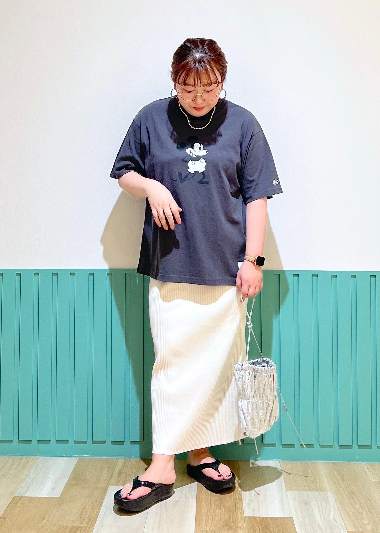 ゆったりとしたTシャツにタイトスカートを合わせた