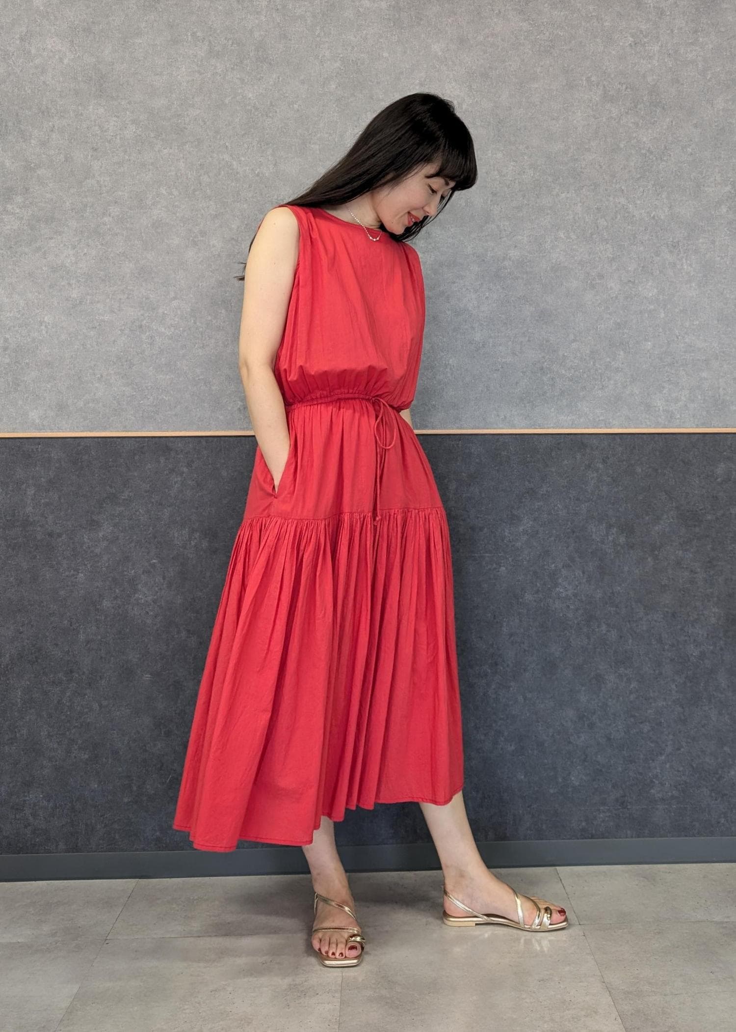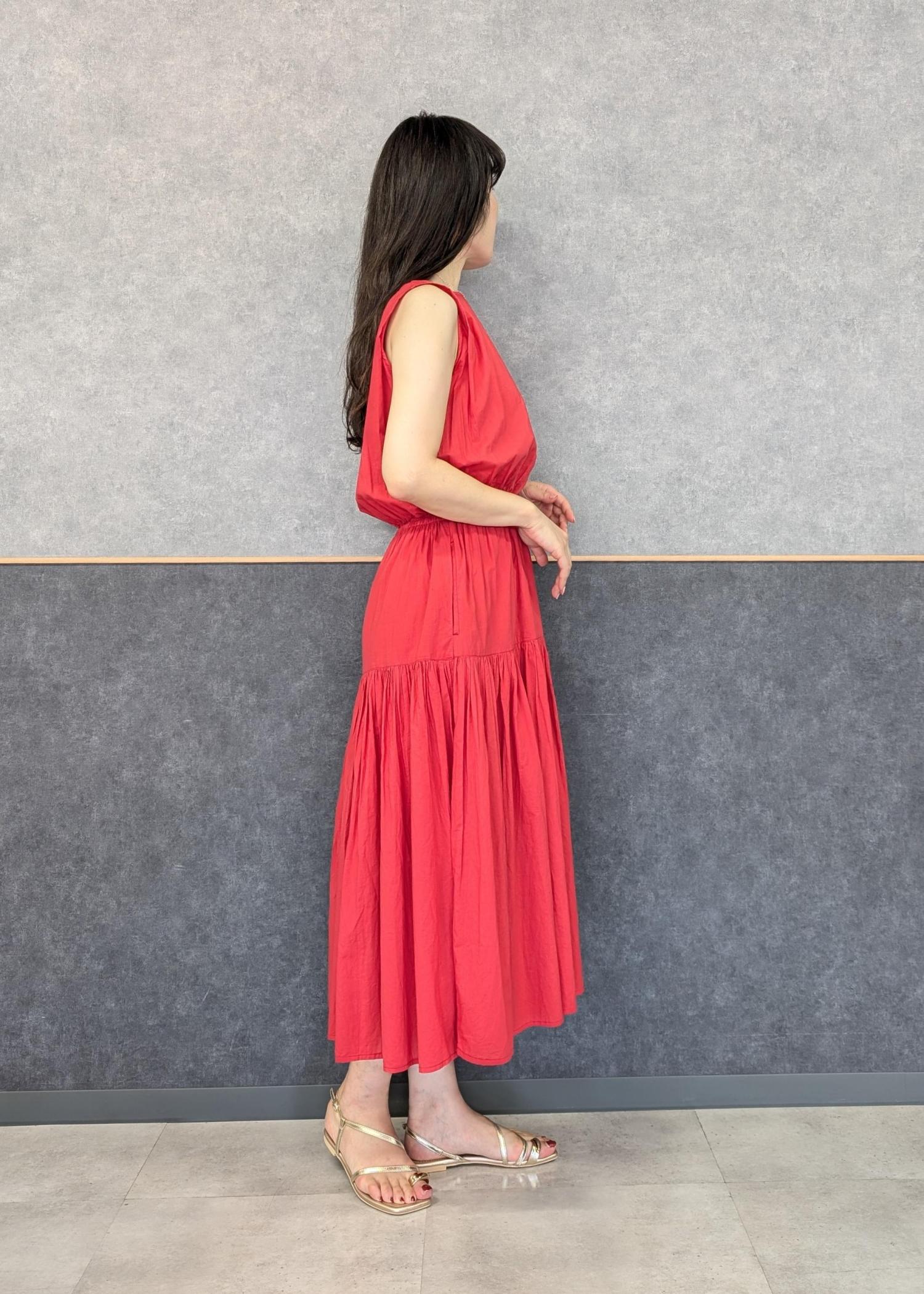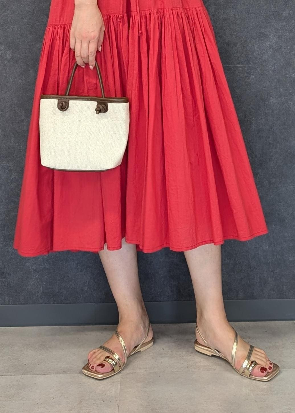赤が鮮やかなので小物は生成り✕ゴールドでワンピースとの色のコントラストが強くなりすぎないようにしました(^.^)