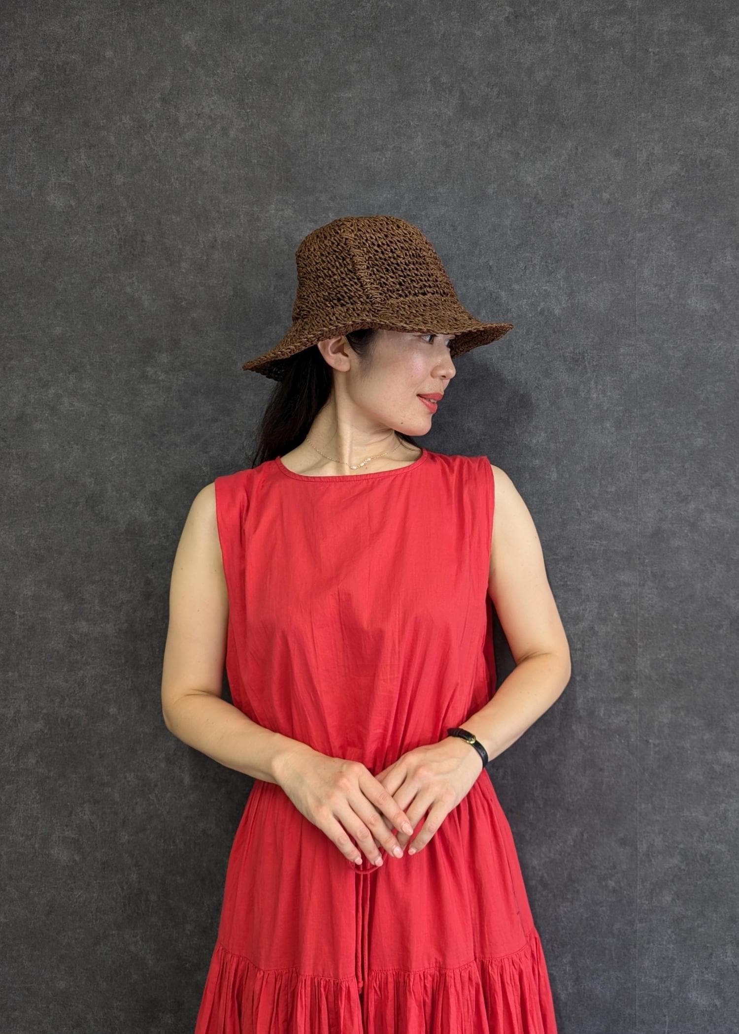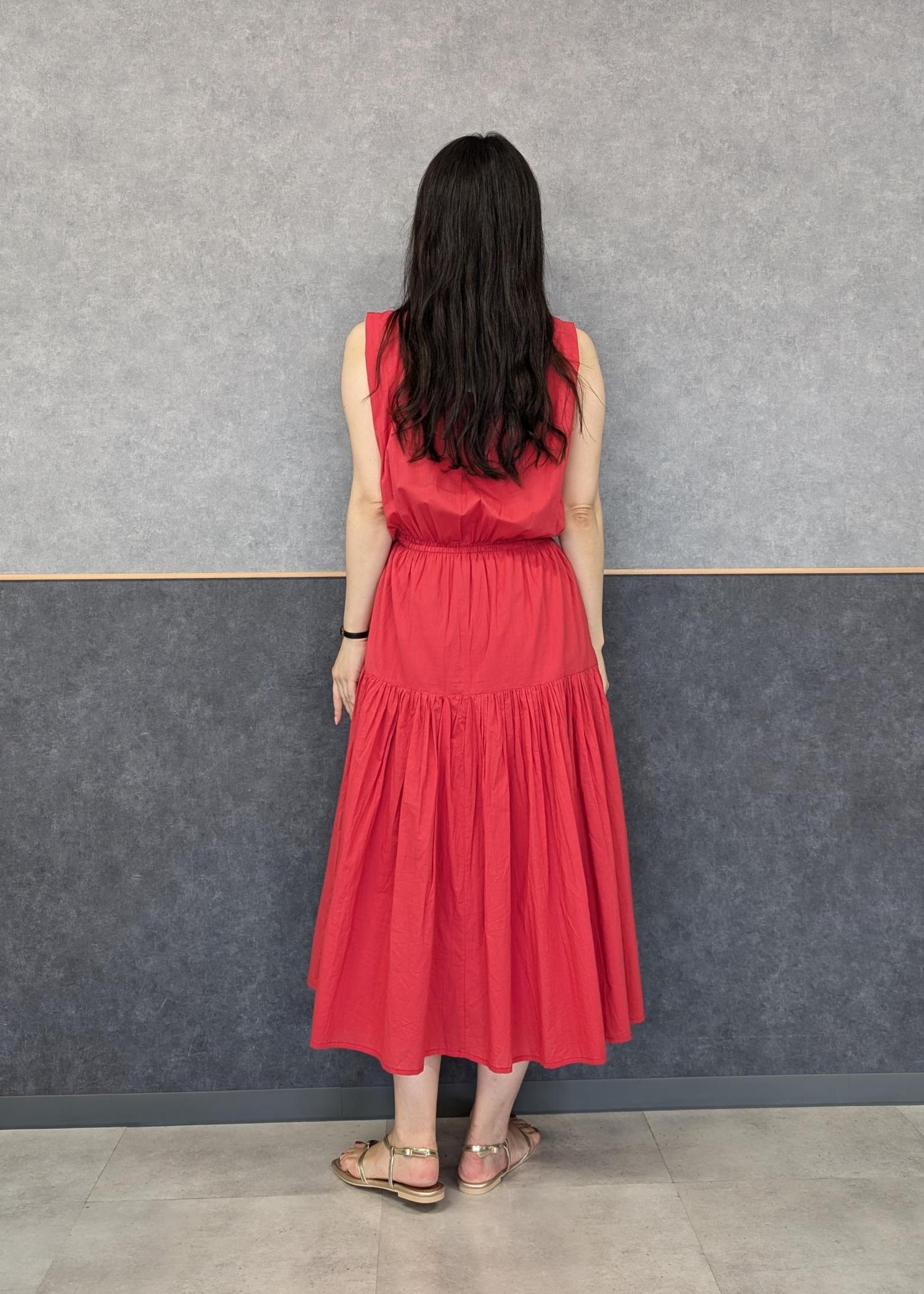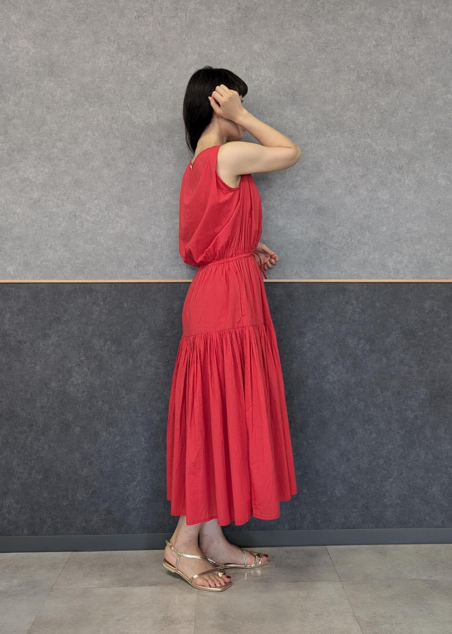 赤が鮮やかなので小物は生成り✕ゴールドでワンピースとの色のコントラストが強くなりすぎないようにしました(^.^)