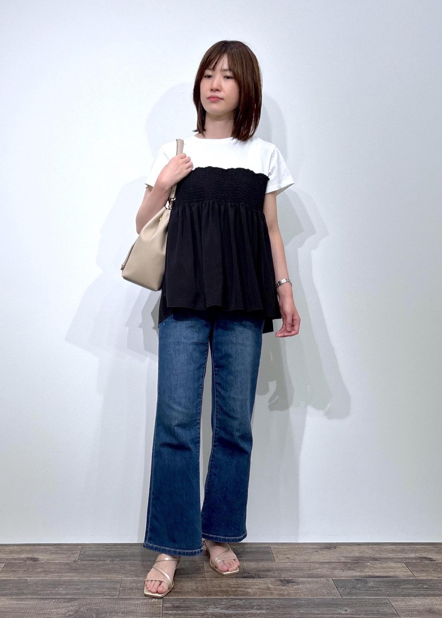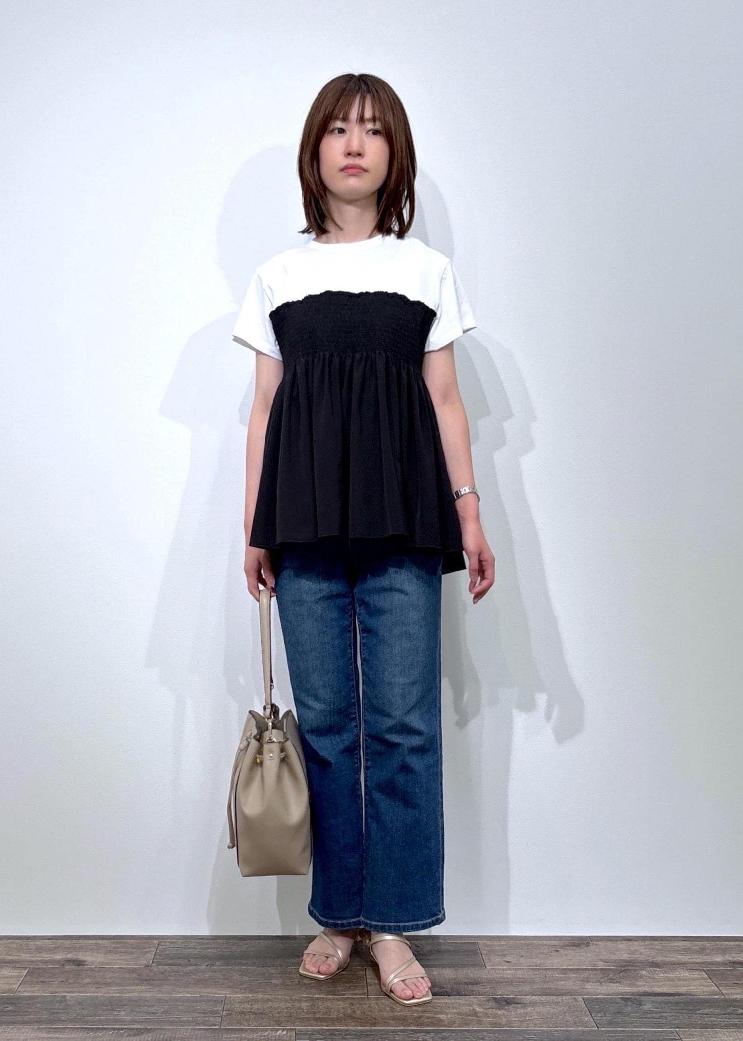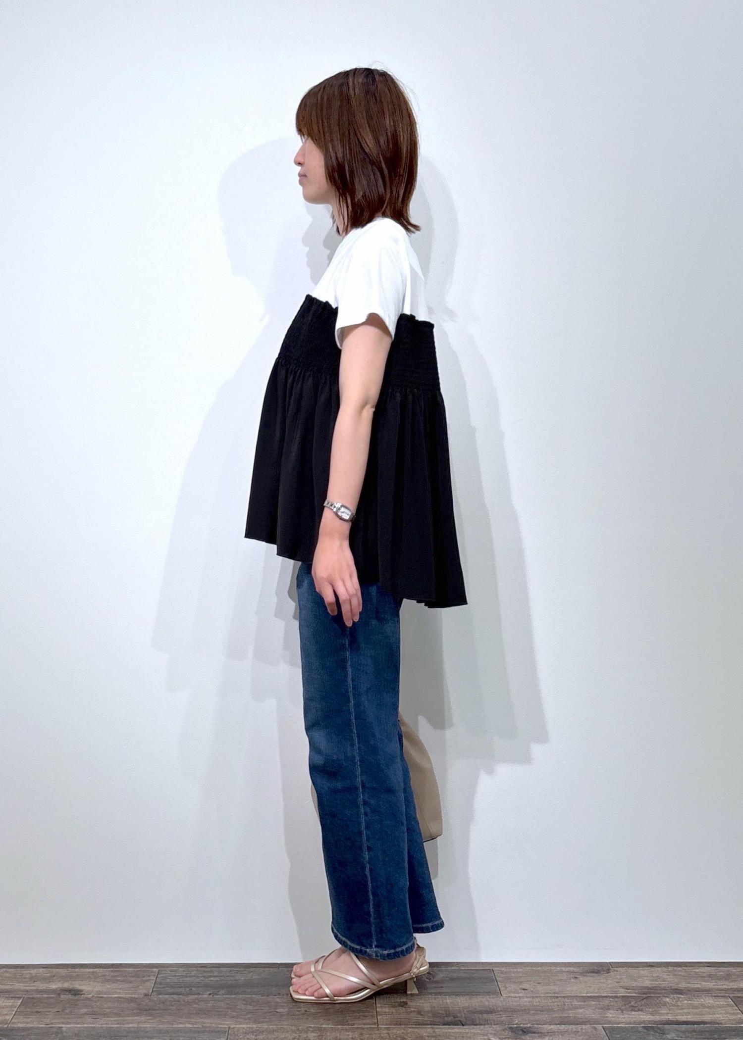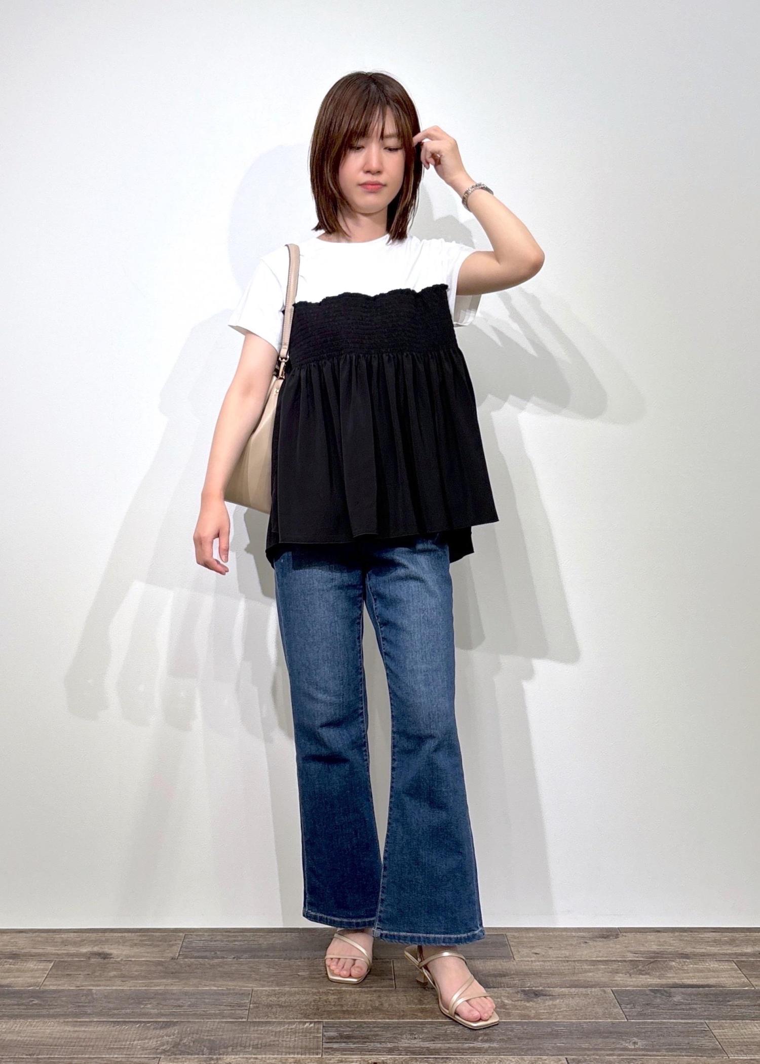 ビスチェ風で簡単にお洒落見えするトップス。サラッとした素材感でボリューミーになりすぎない印象でした。