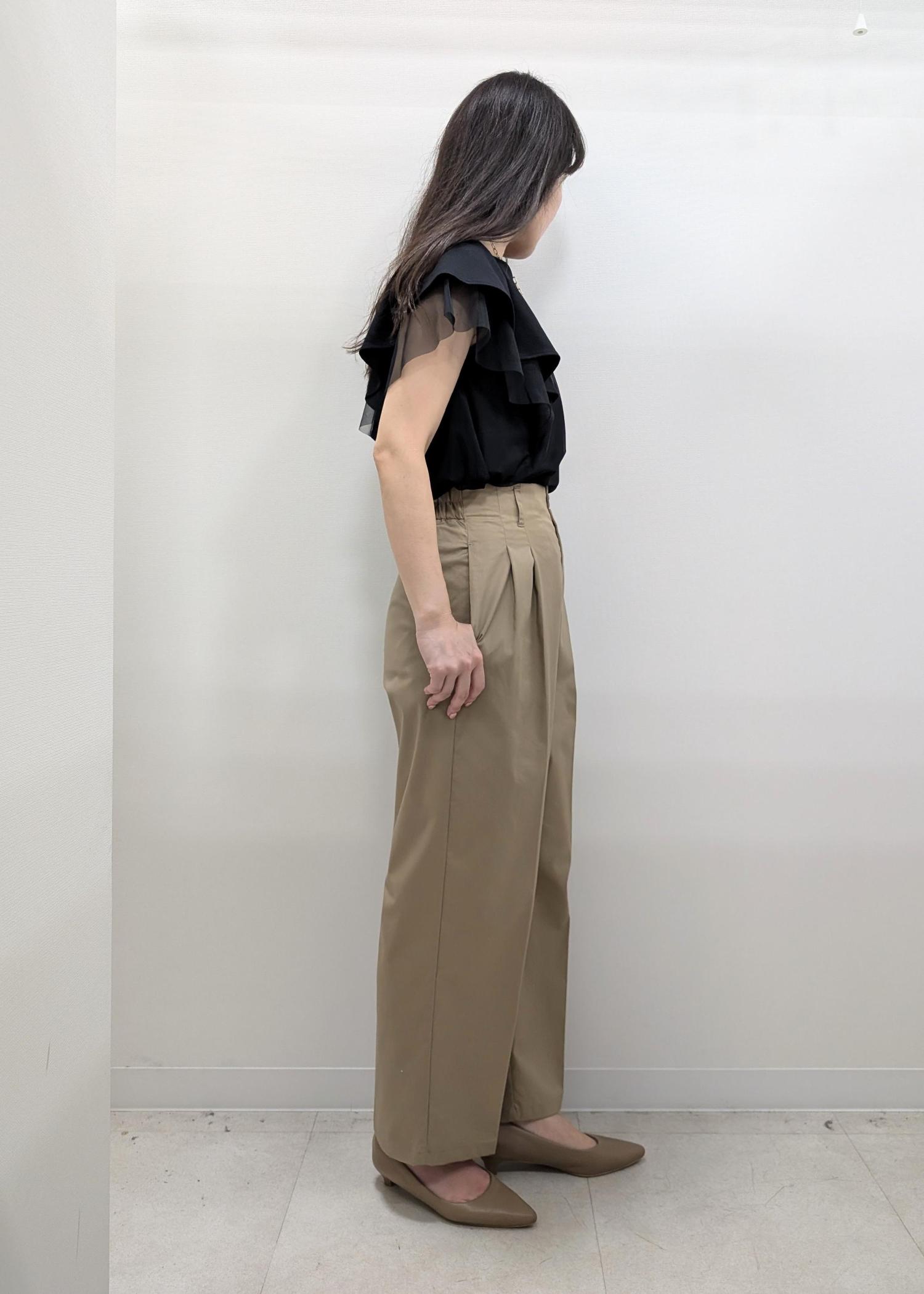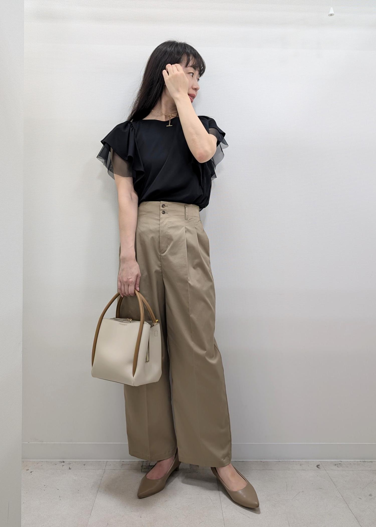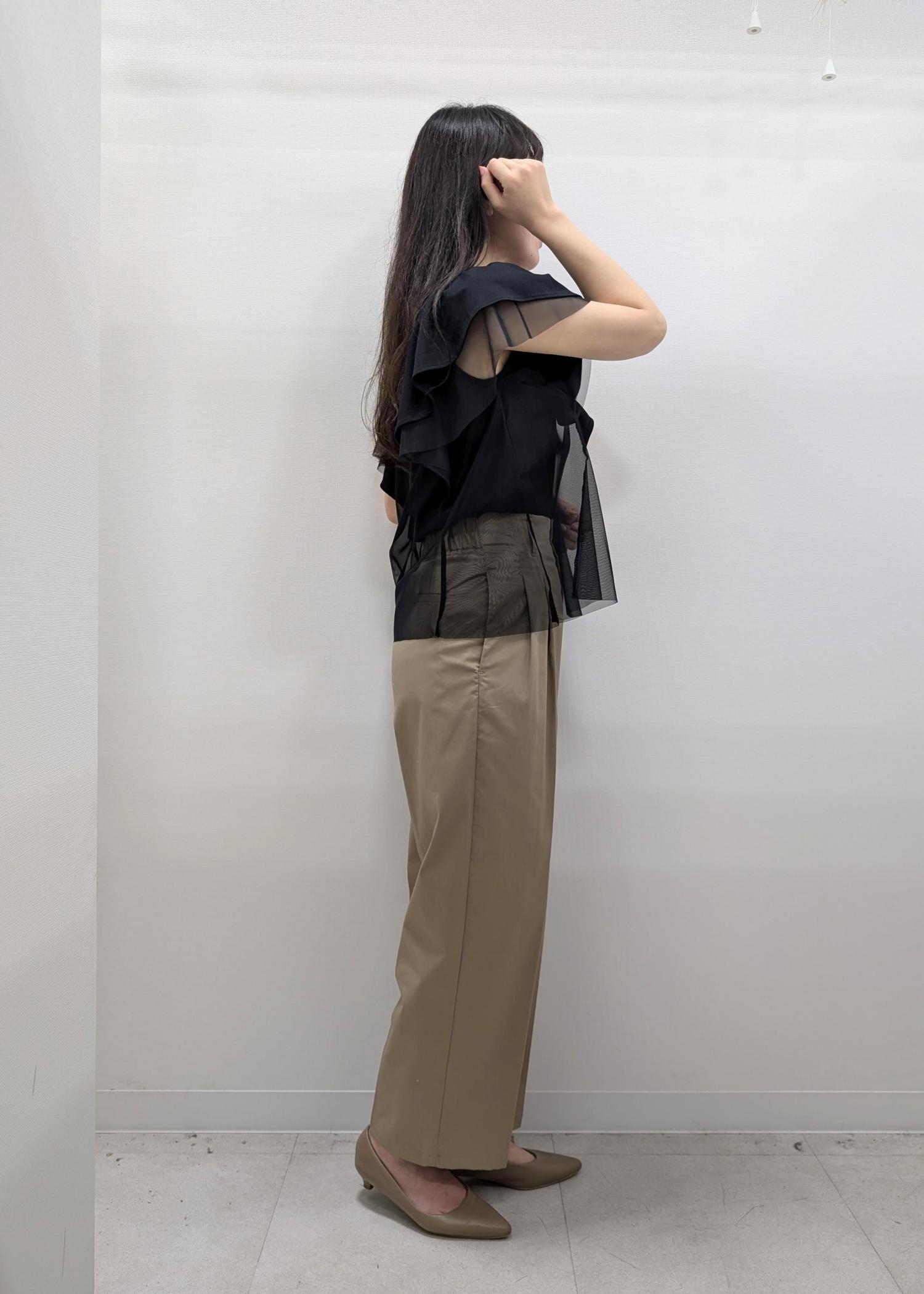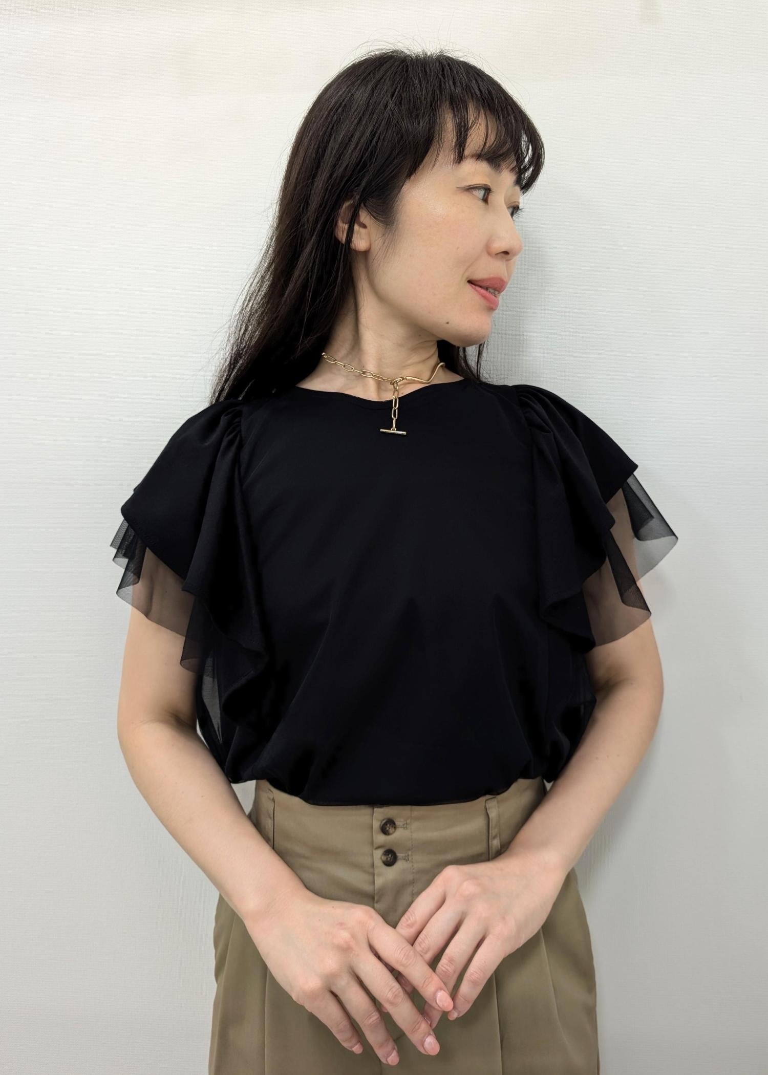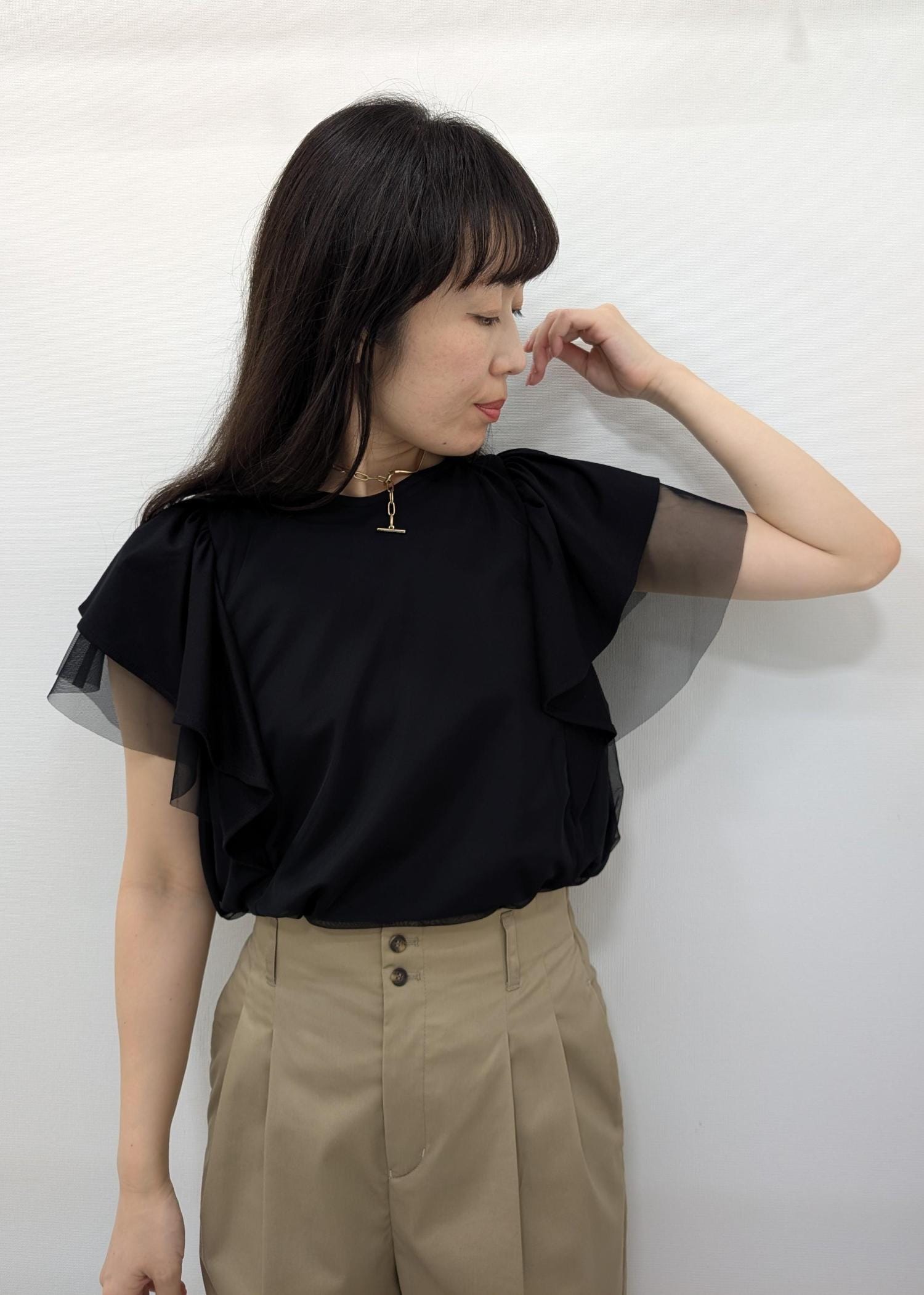 私は肩幅広めなので、肩にフリルのあるデザインは広く見えないか心配でしたが、袖の一番上がチュールではなくカットソー素材で落ち感があるので、肩幅を強調せずに着られました! -