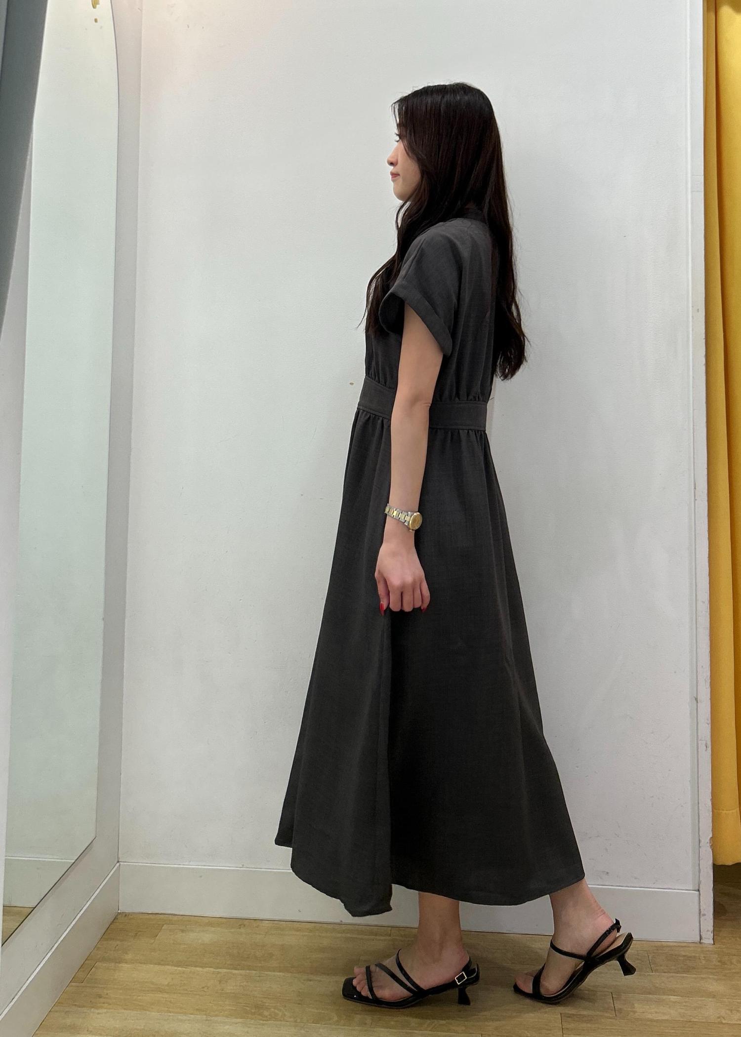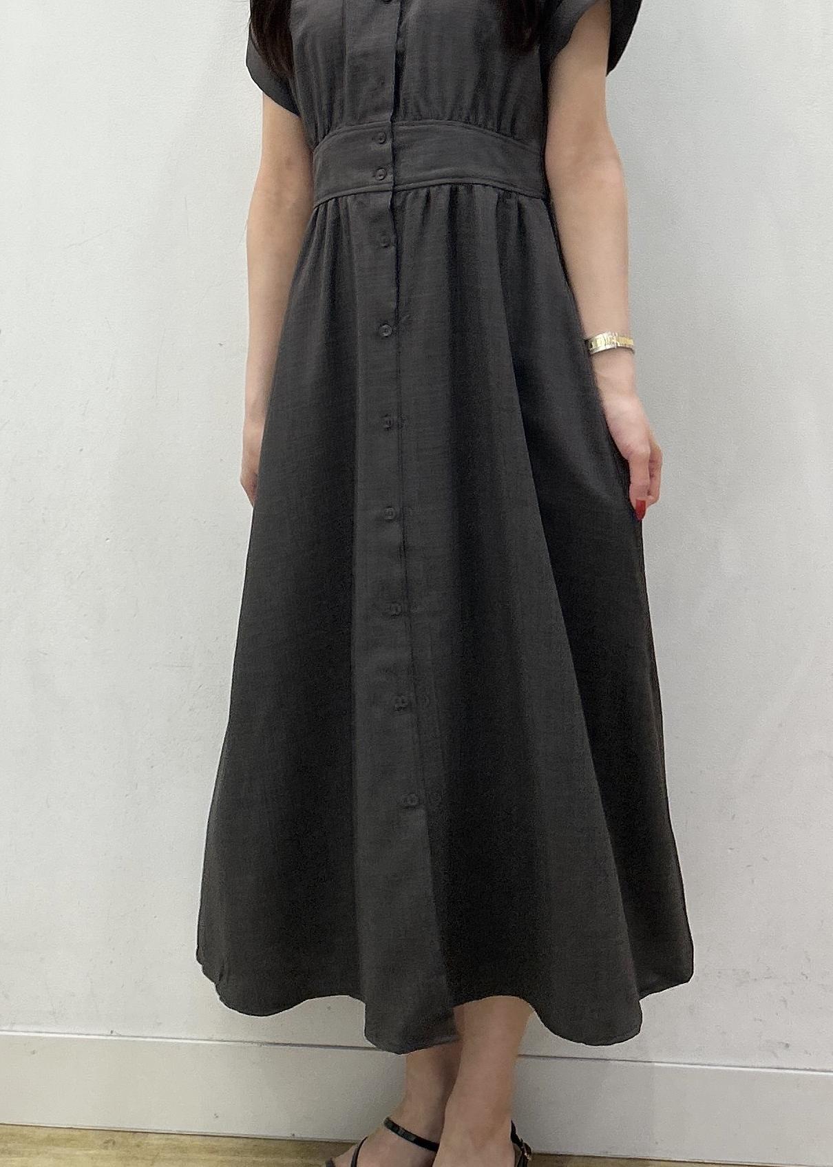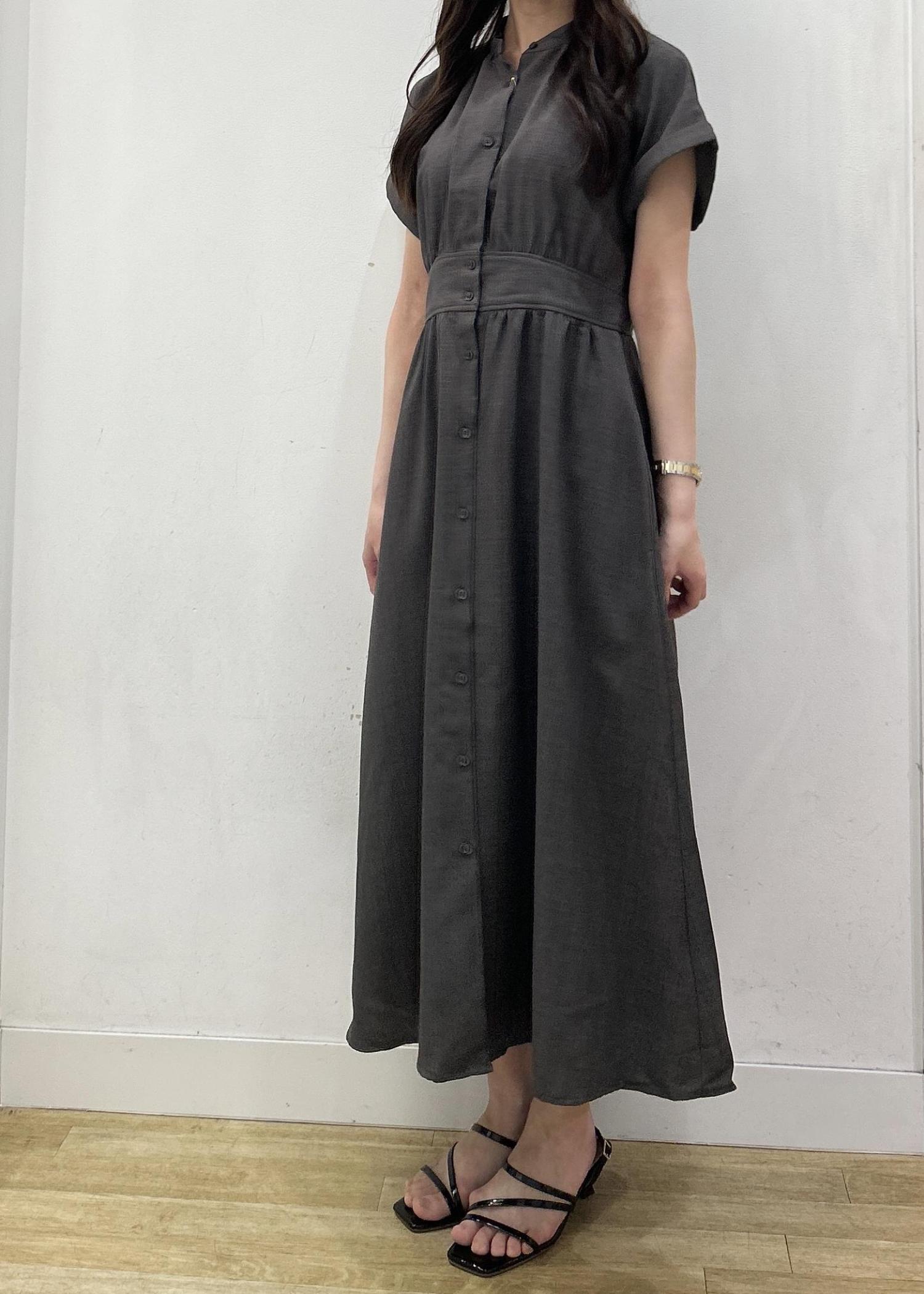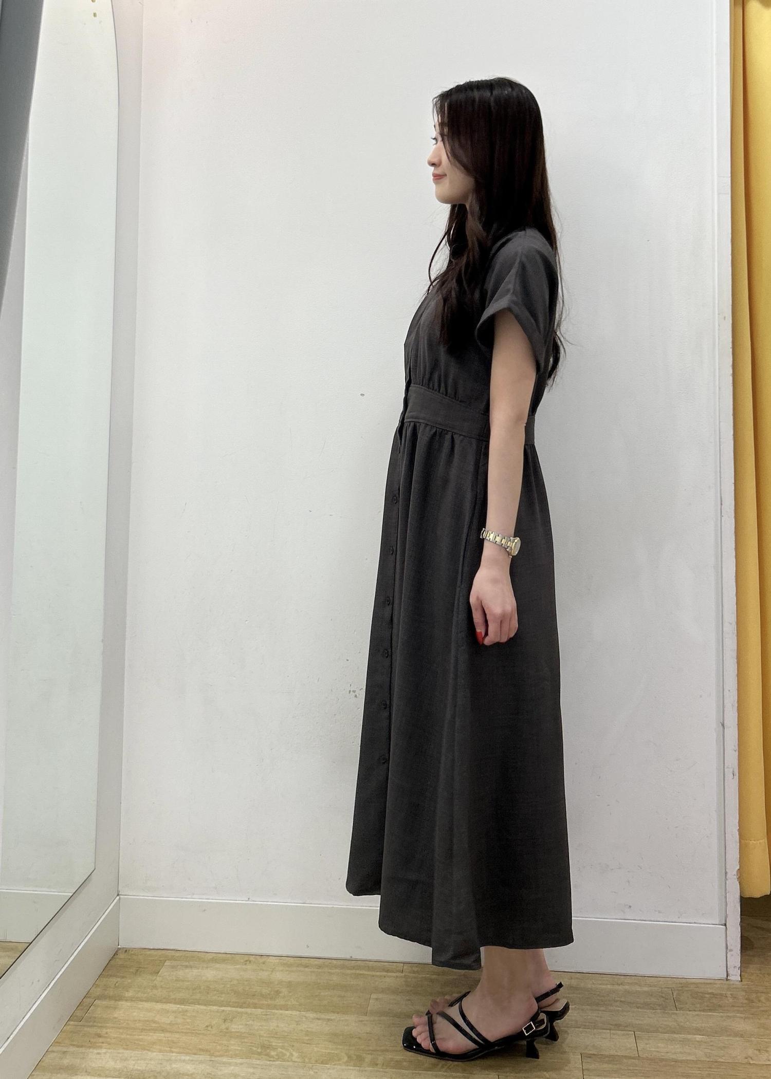 二の腕が隠れる袖感で着丈は長めで足首が見えます。
