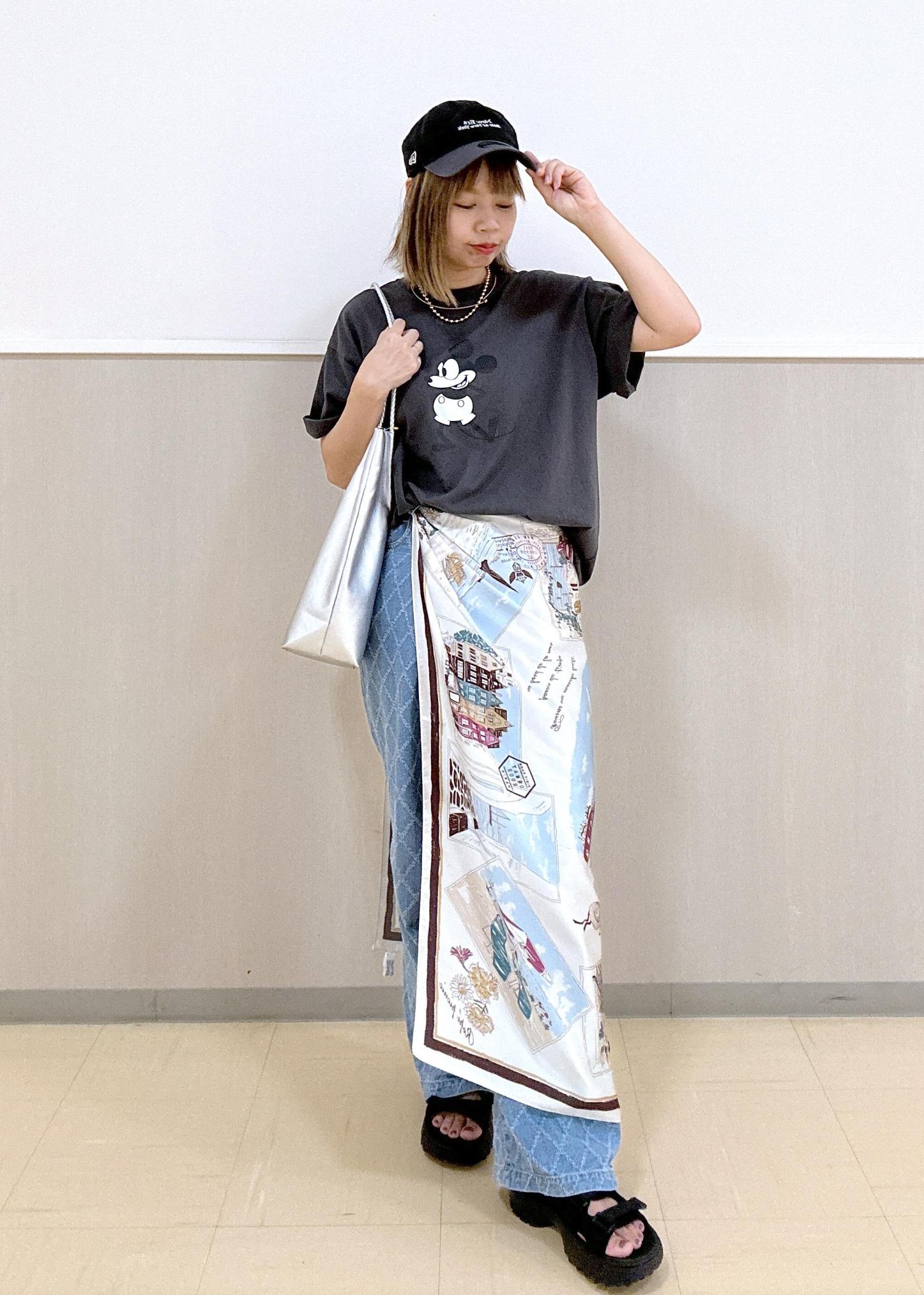 スカーフがある事で普段のシンプルなTシャツ×デニムスタイルが一気に華やかに!
