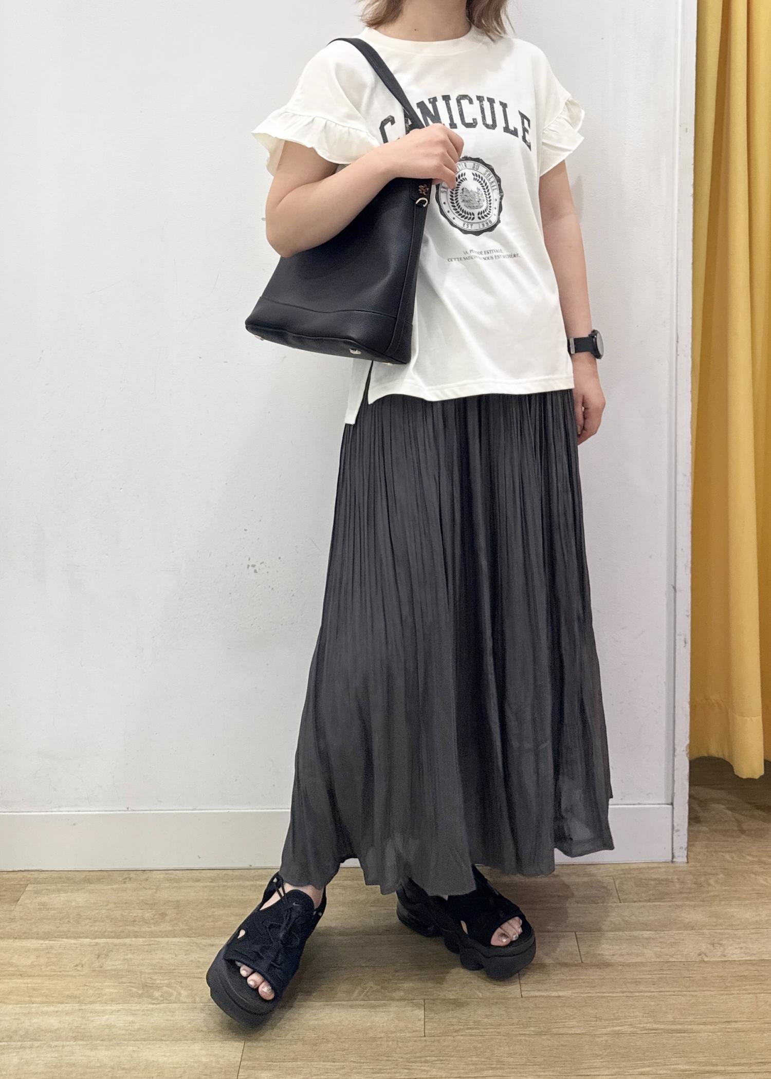 Tシャツに、ウエストオールゴムのプリーツスカートを合わせて楽チンコーディネートに!