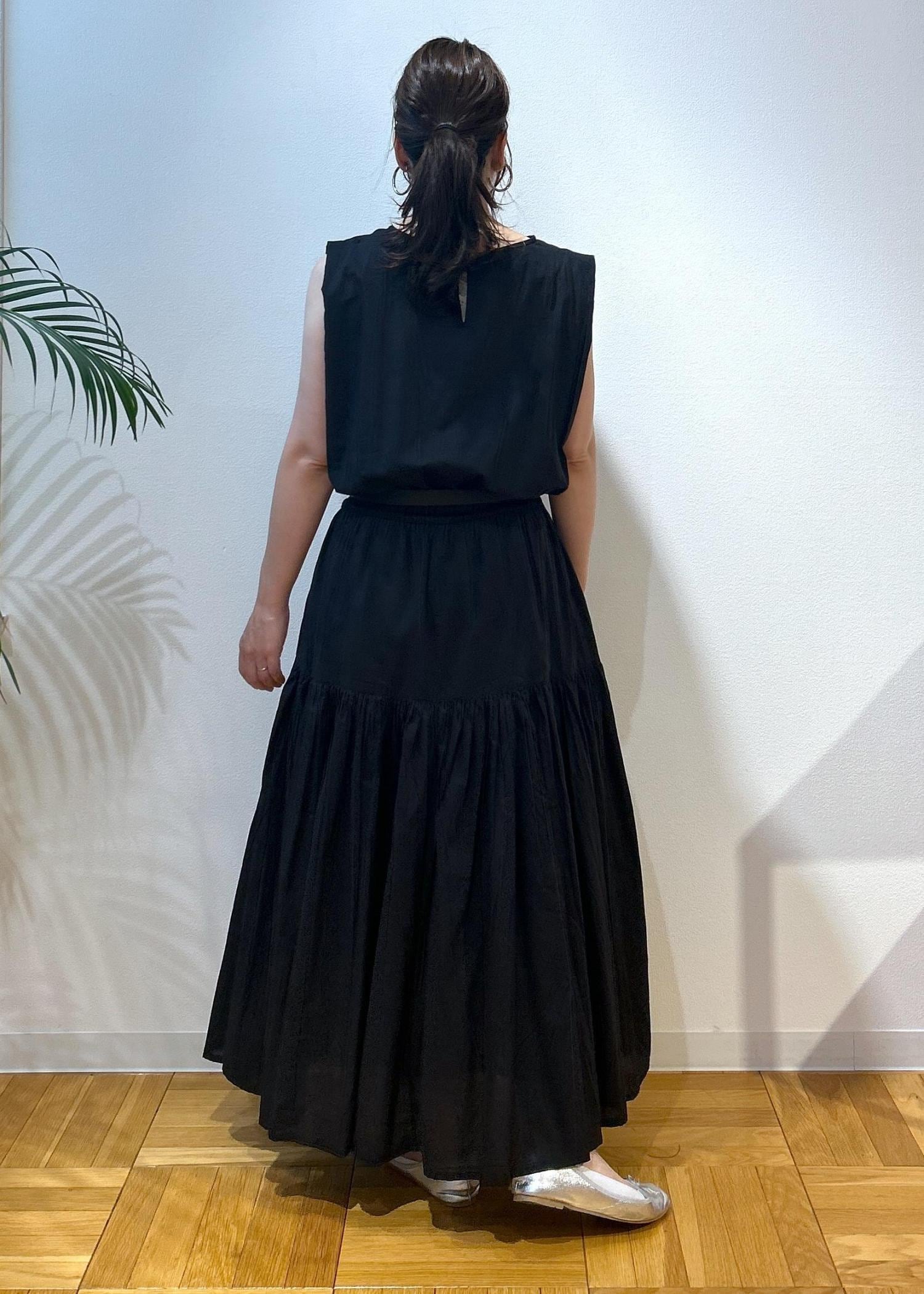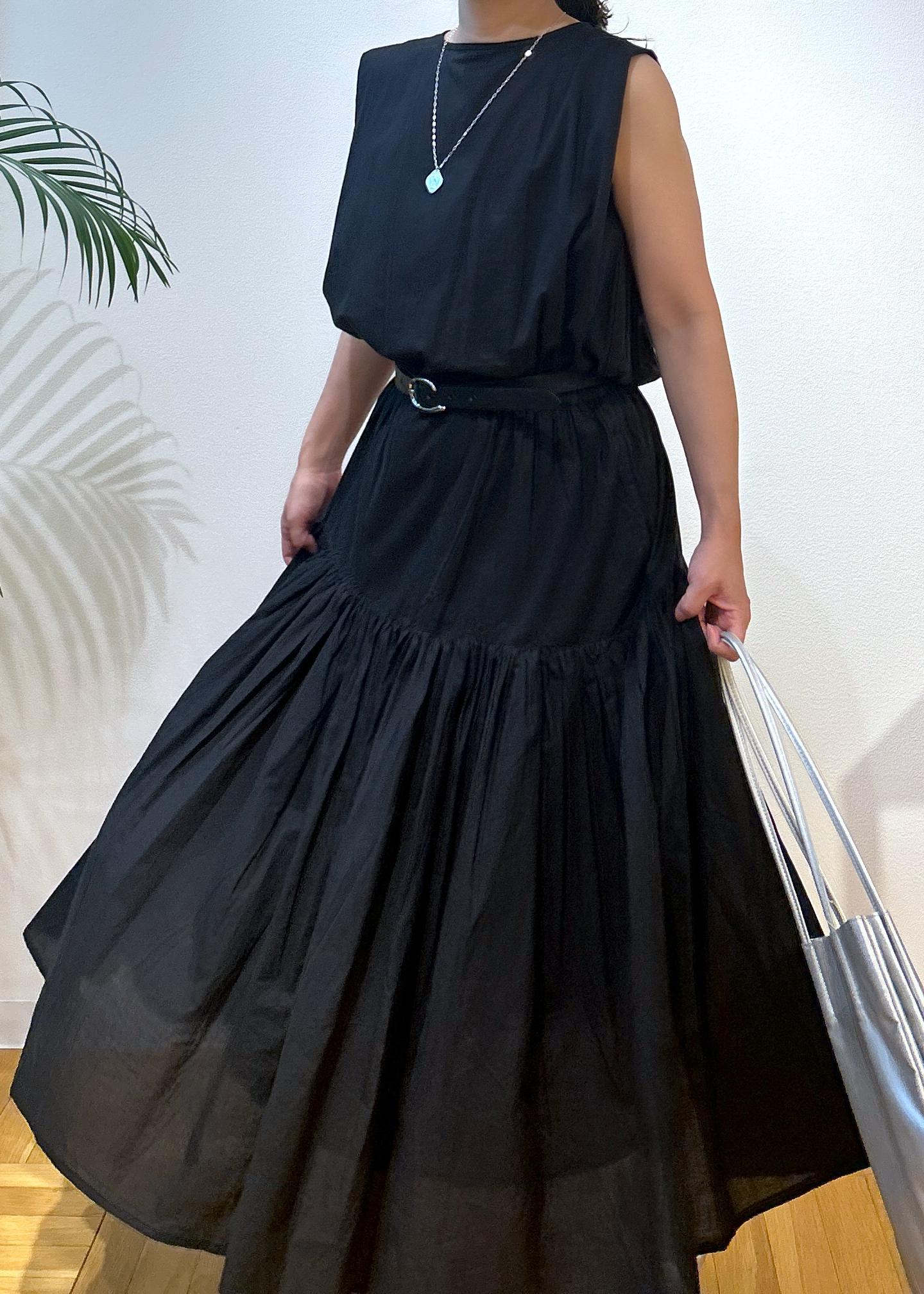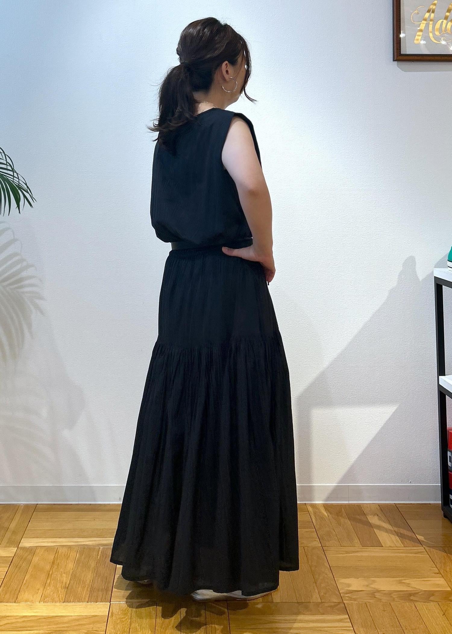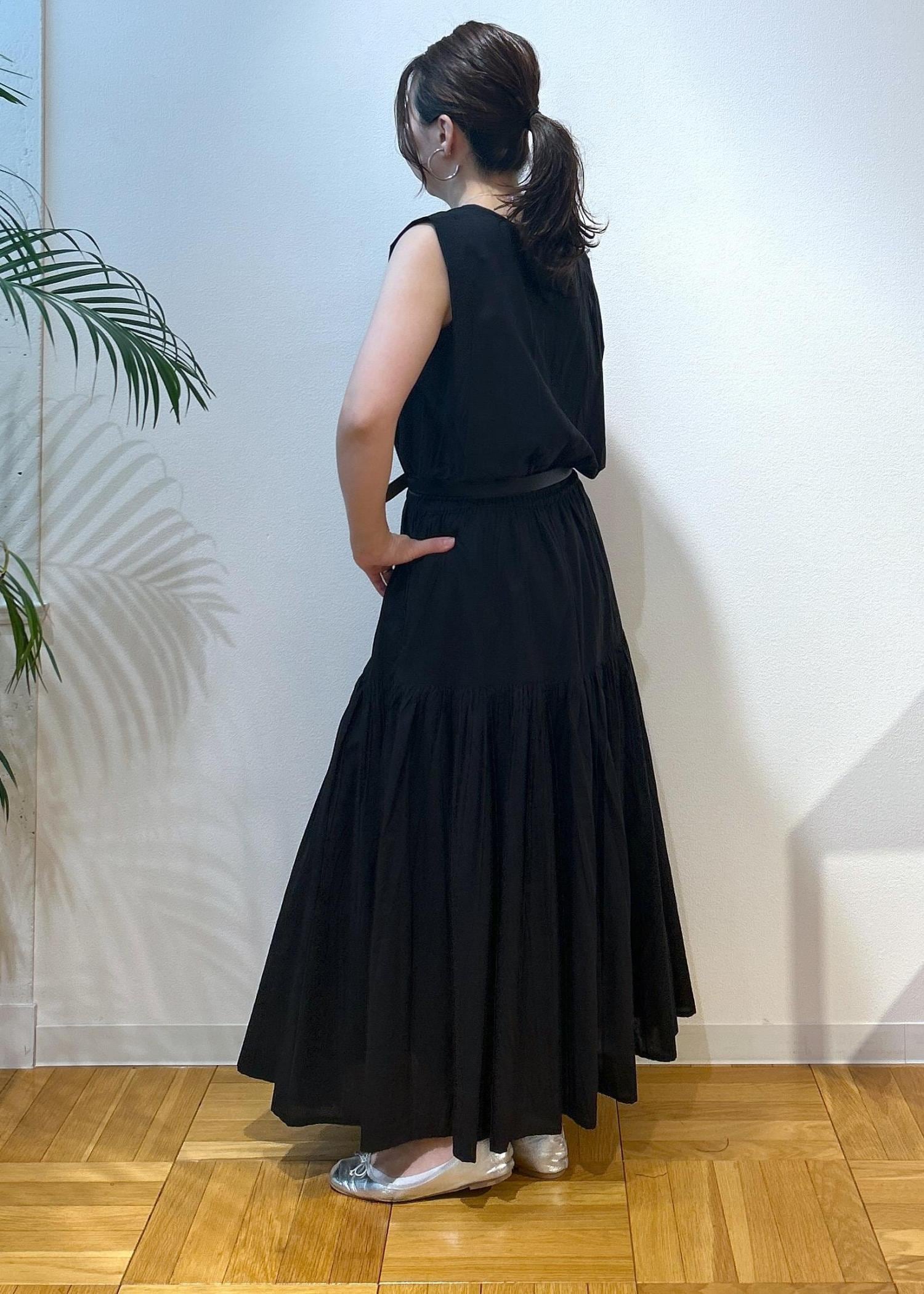綿素材なのでさらっとしてて肌に優しさを感じます。ウエストに紐がついているので調節可能です。上半身のシルエットが肩のところにタックが入っていることでゆったりとした感じでした。丈はくるぶしくらいの丁度いい長さでした。