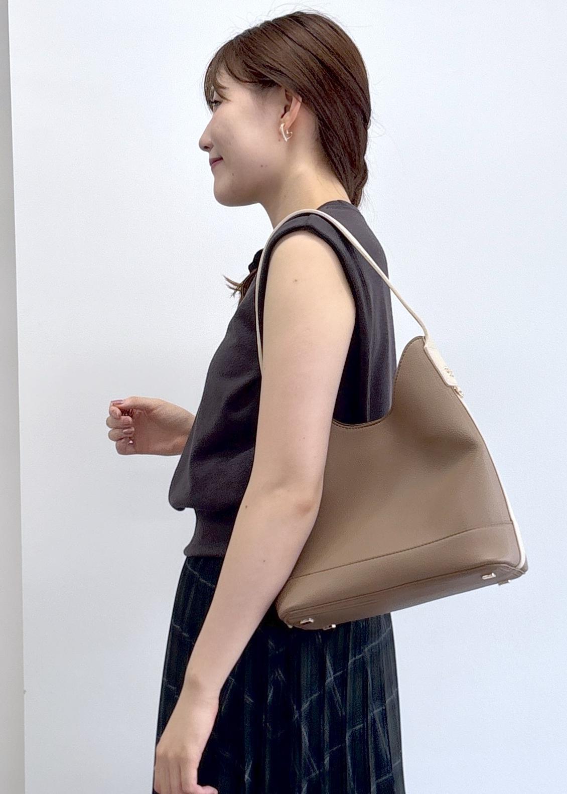 オンオフ兼用しやすいデザインで重宝します。肩掛けしやすく体にフィットする滑らかな生地感です。Dカン付きで、キーホルダーをつけてアレンジできます。