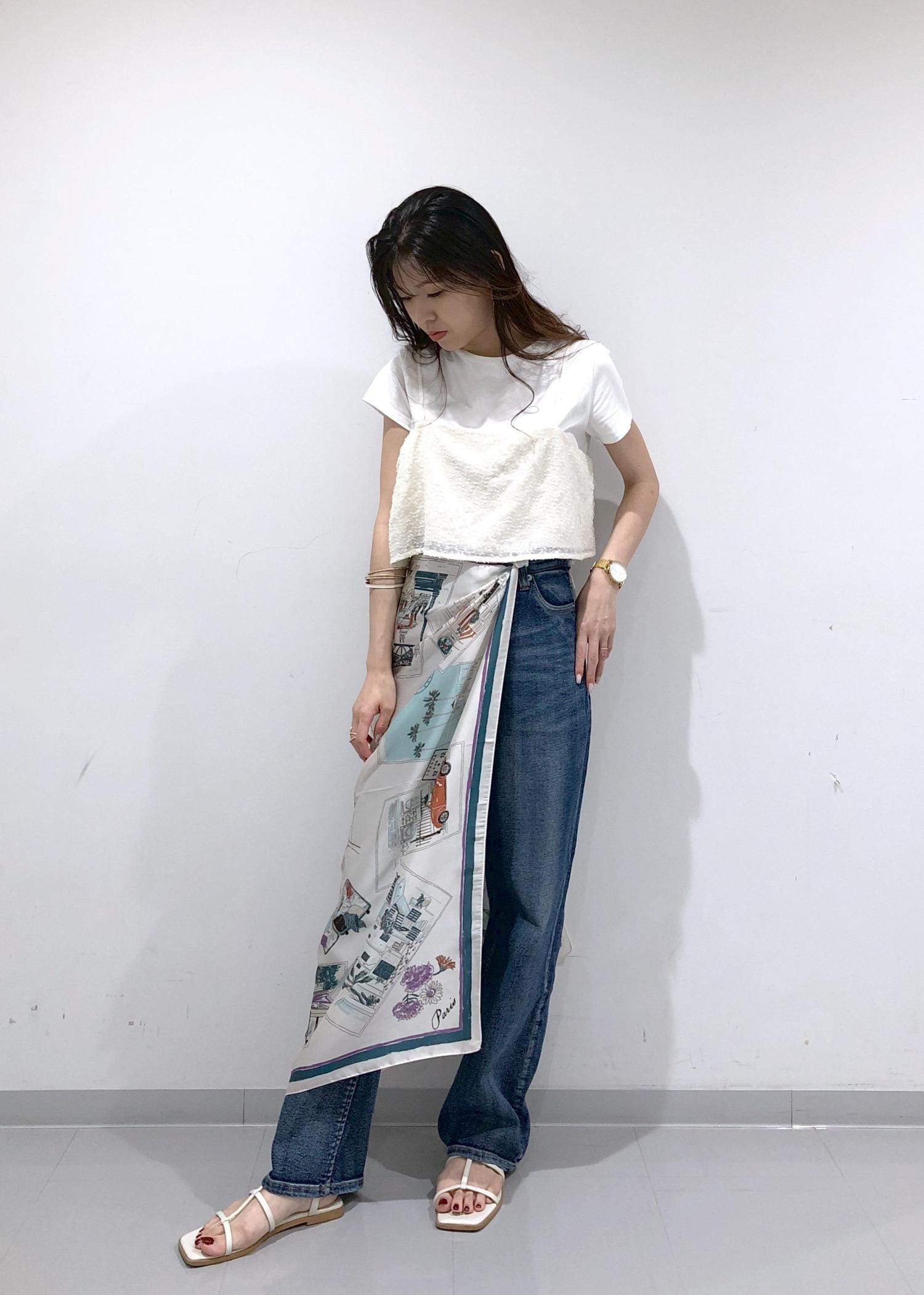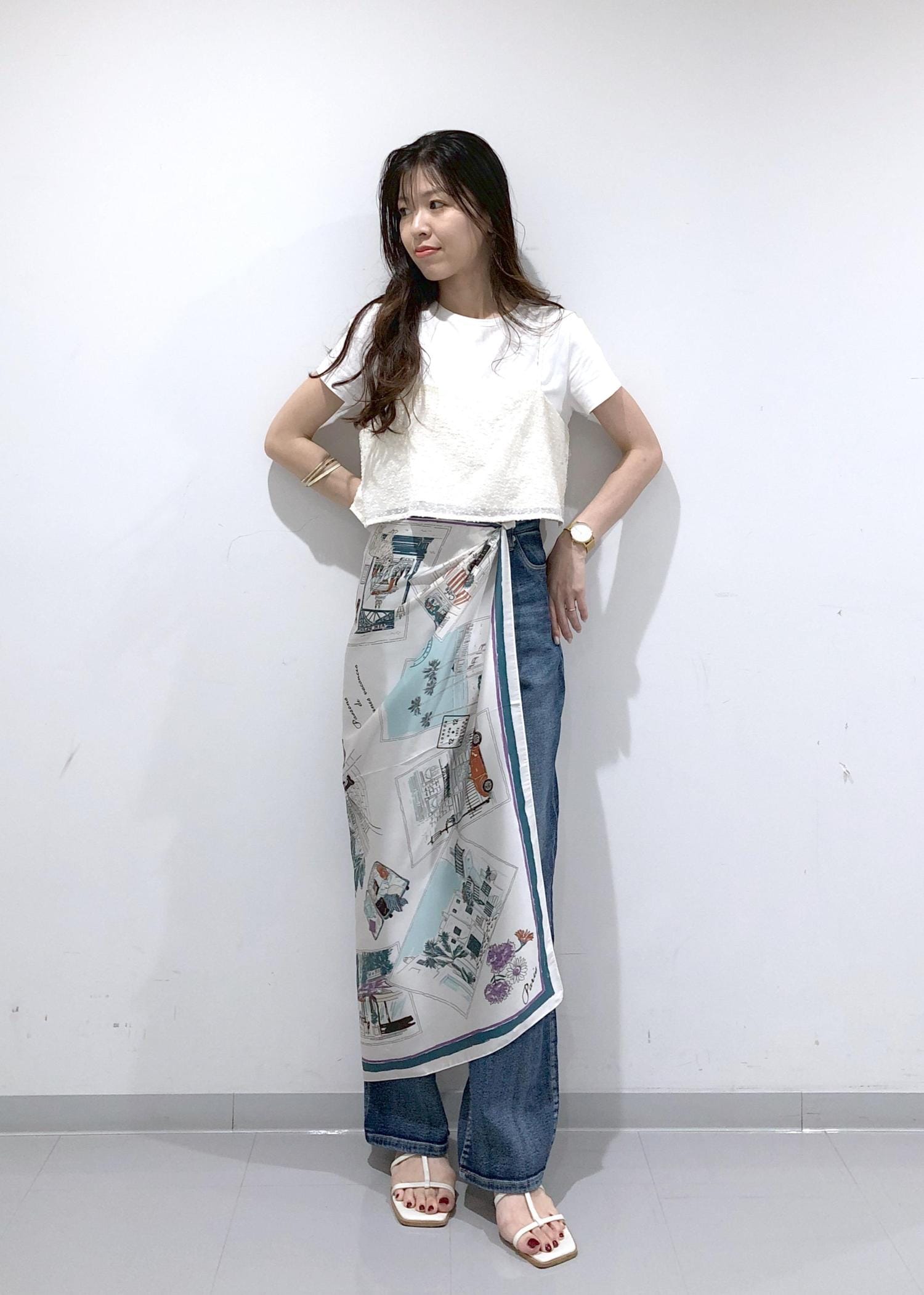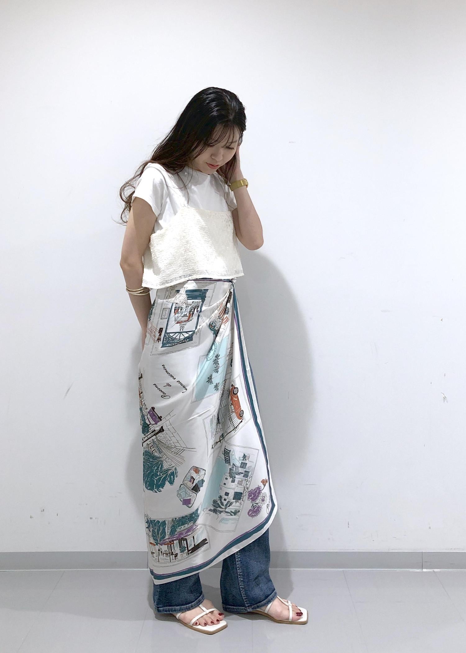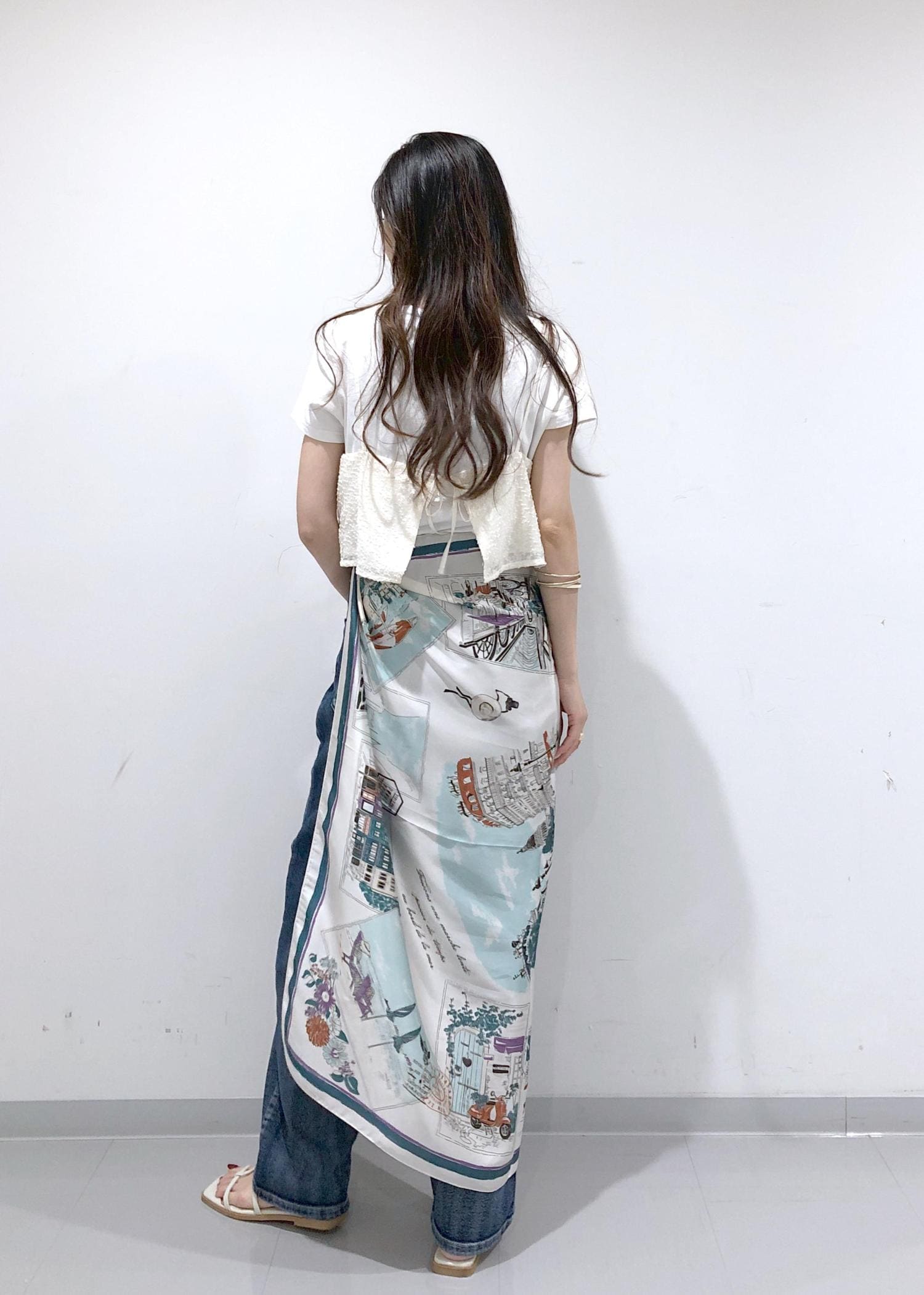 シンプルになりがちな夏のコーディネートに、スカーフ1枚足すだけでとっても華やかで旬な着こなしの完成!!