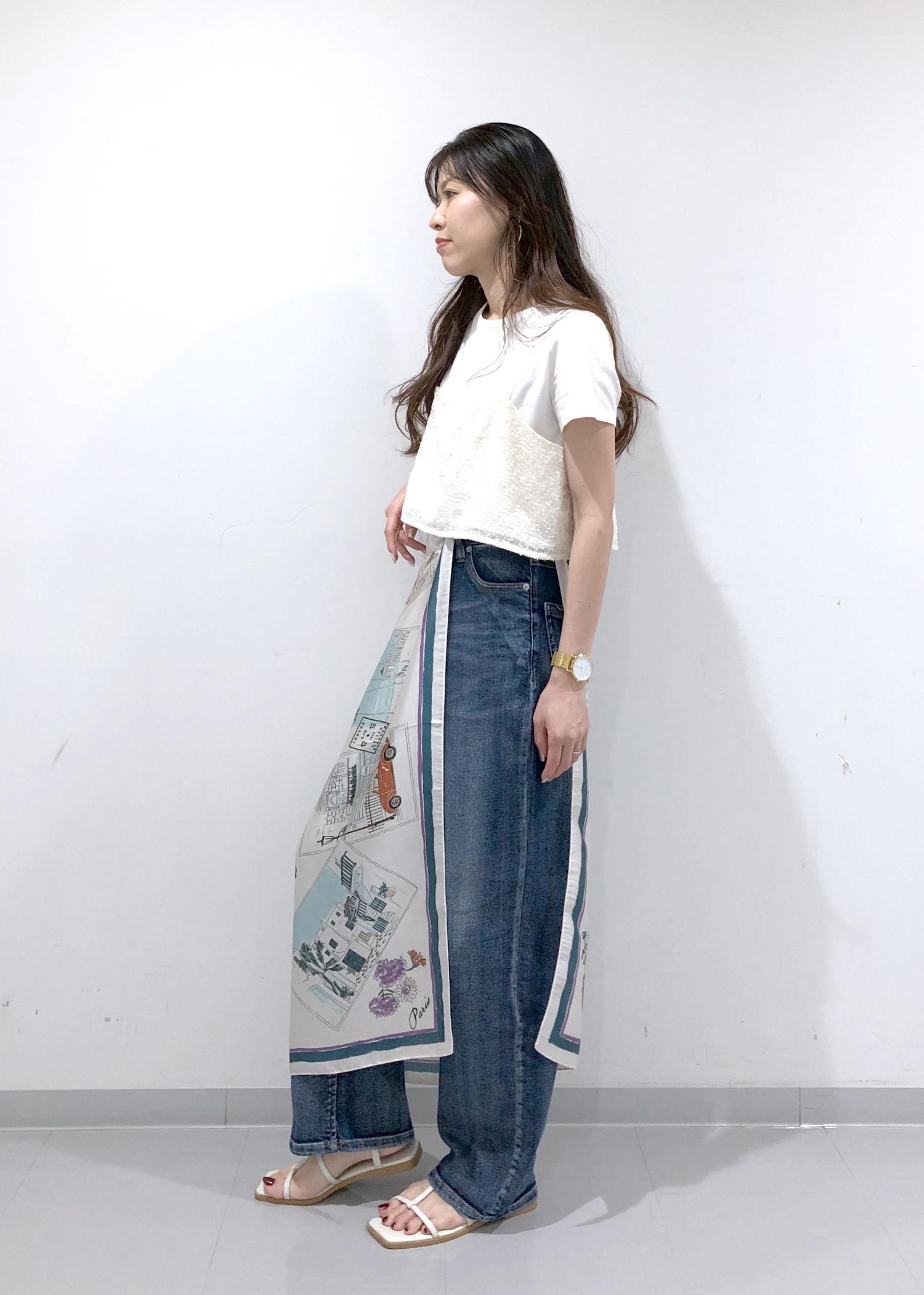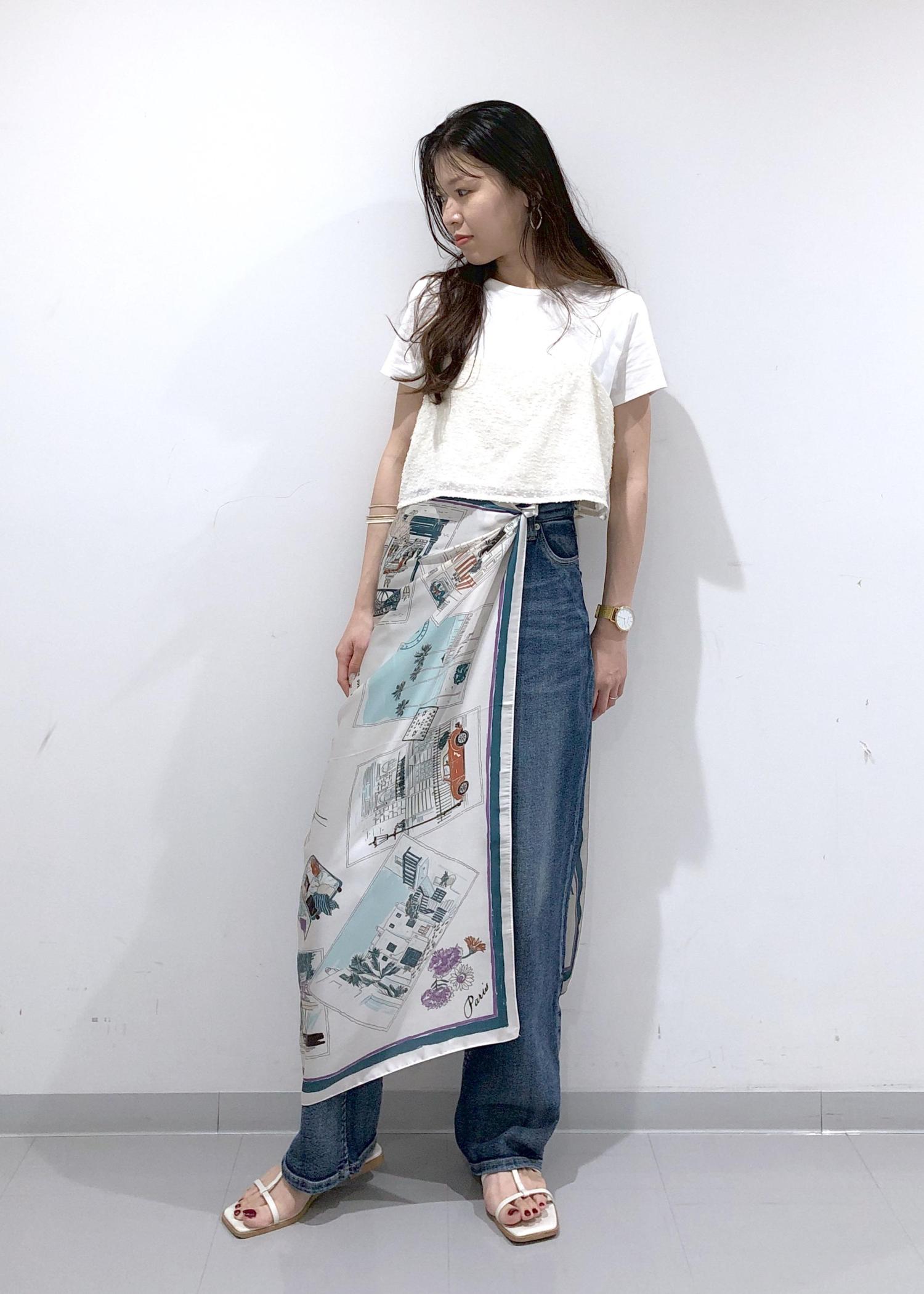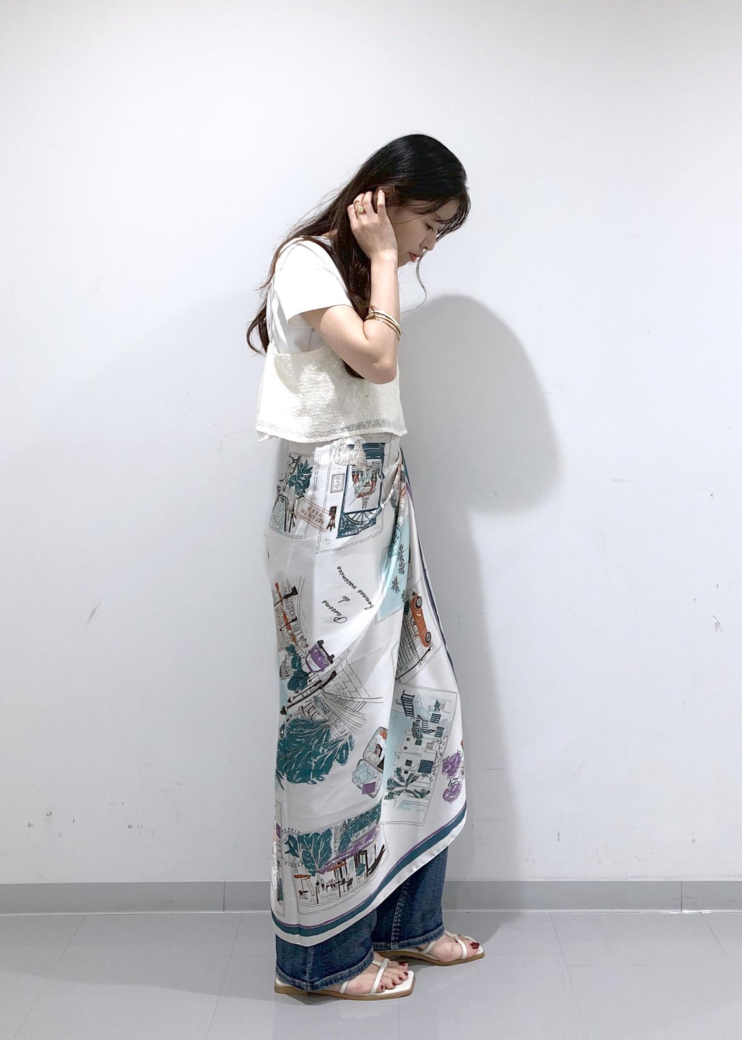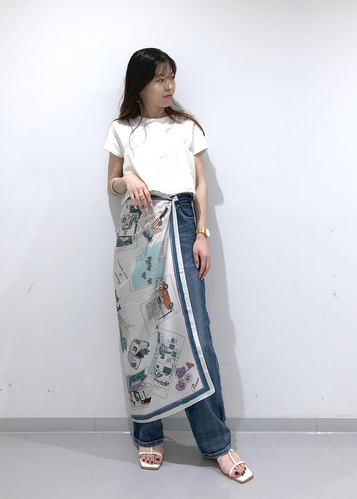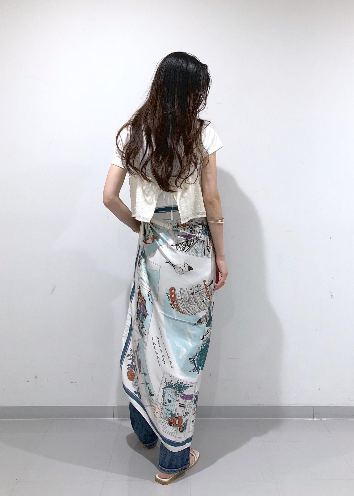 シンプルになりがちな夏のコーディネートに、スカーフ1枚足すだけでとっても華やかで旬な着こなしの完成!!