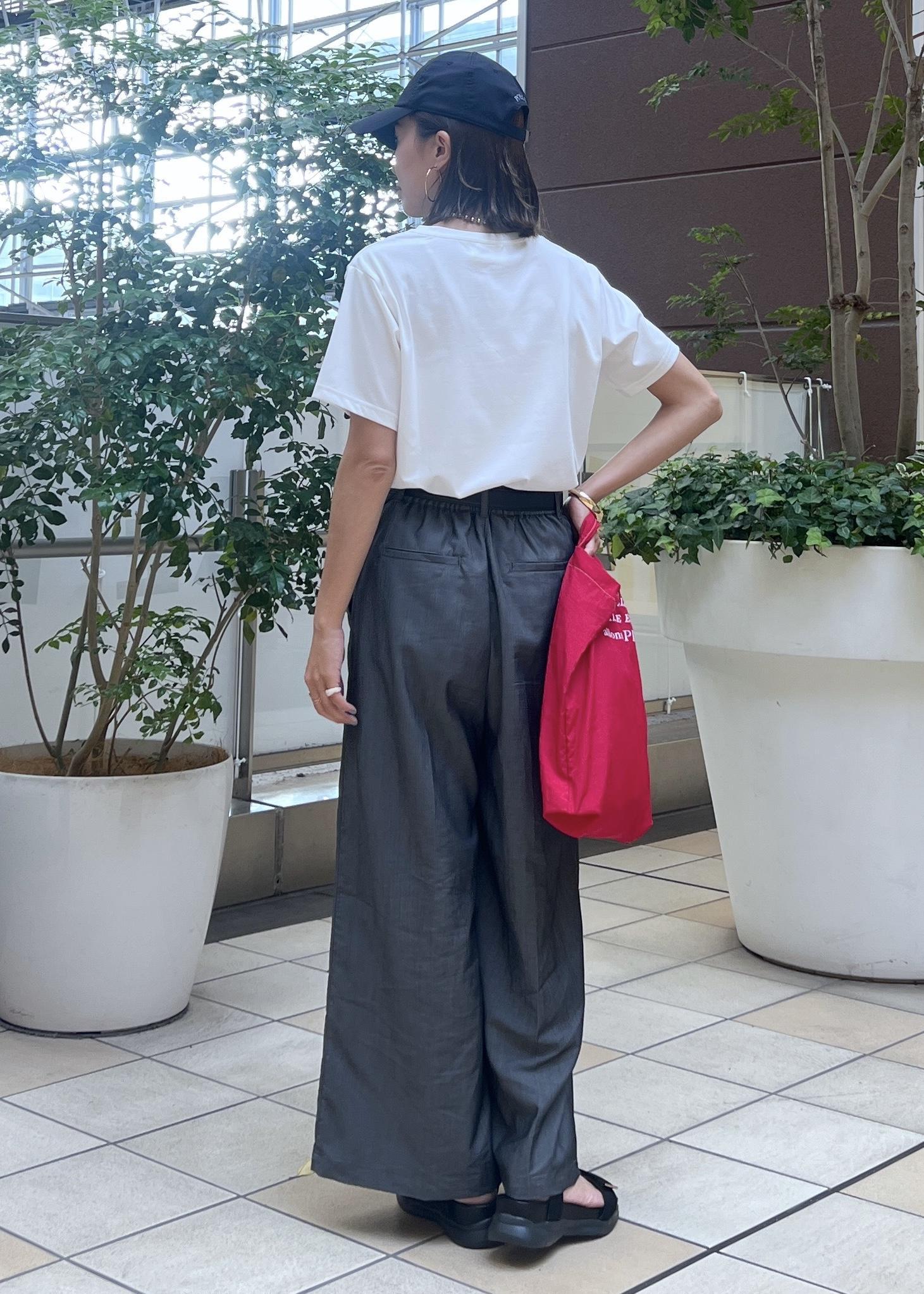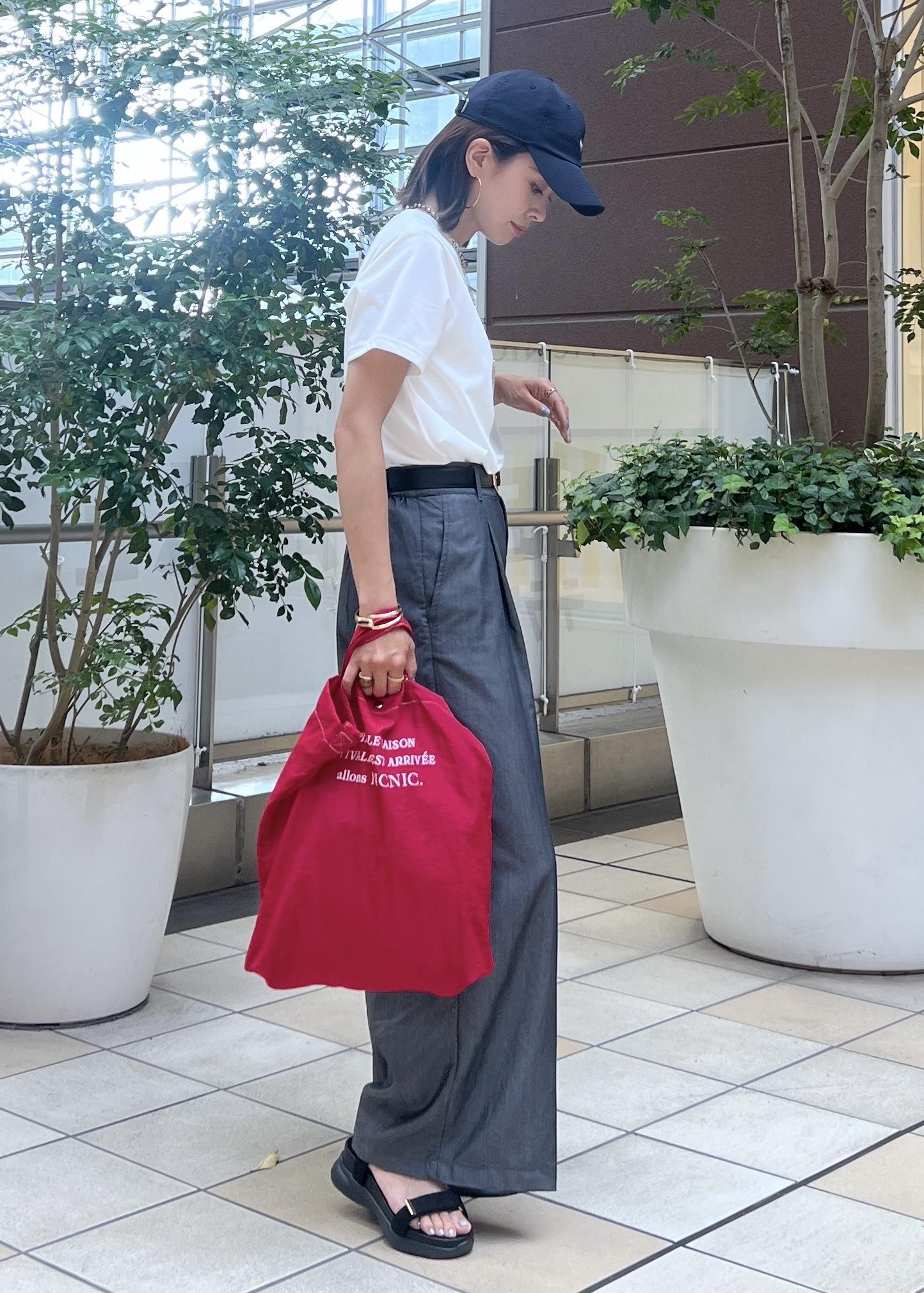 赤のトートバッグを差し色にして、夏らしさのあるコーデの完成です◎。