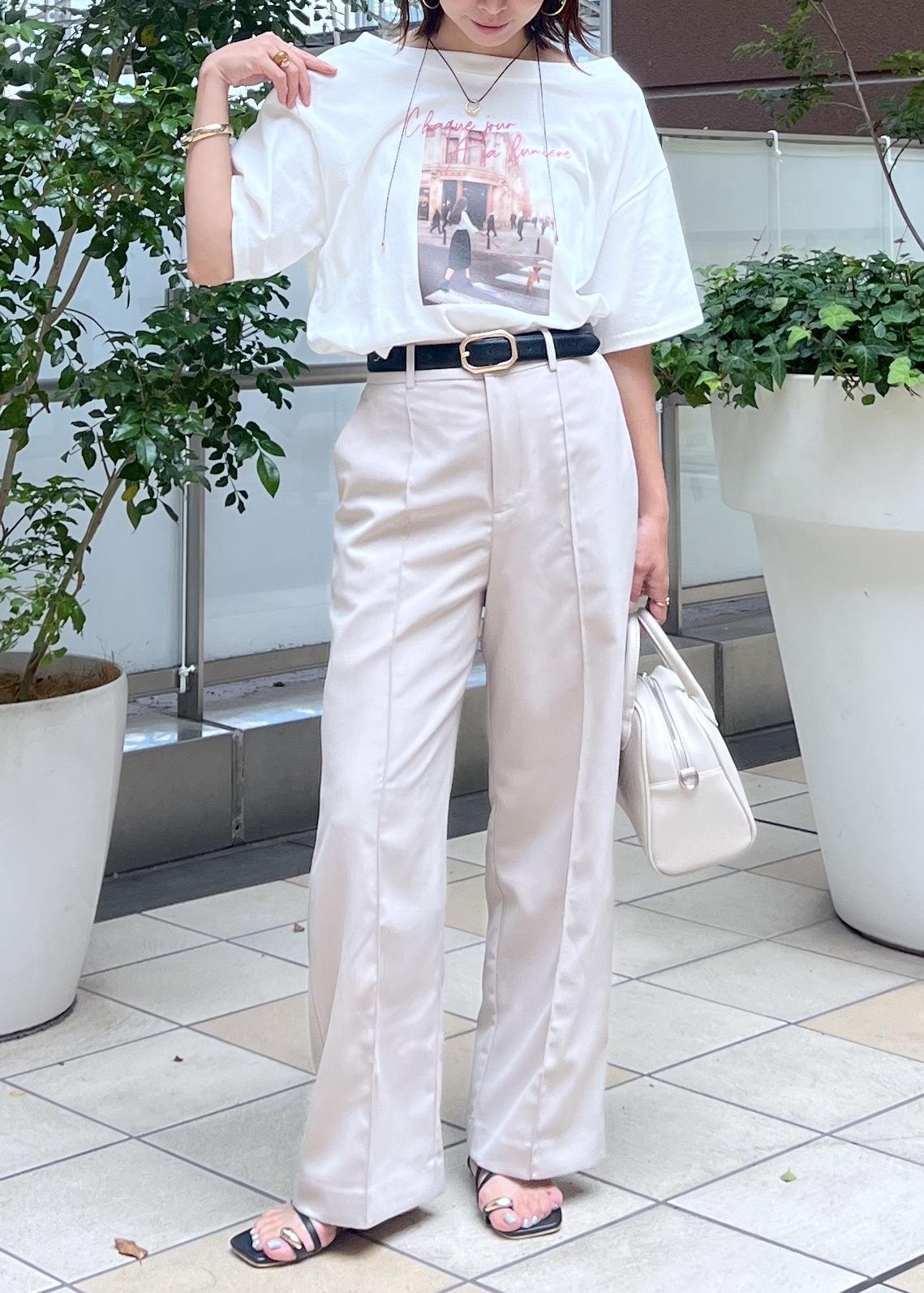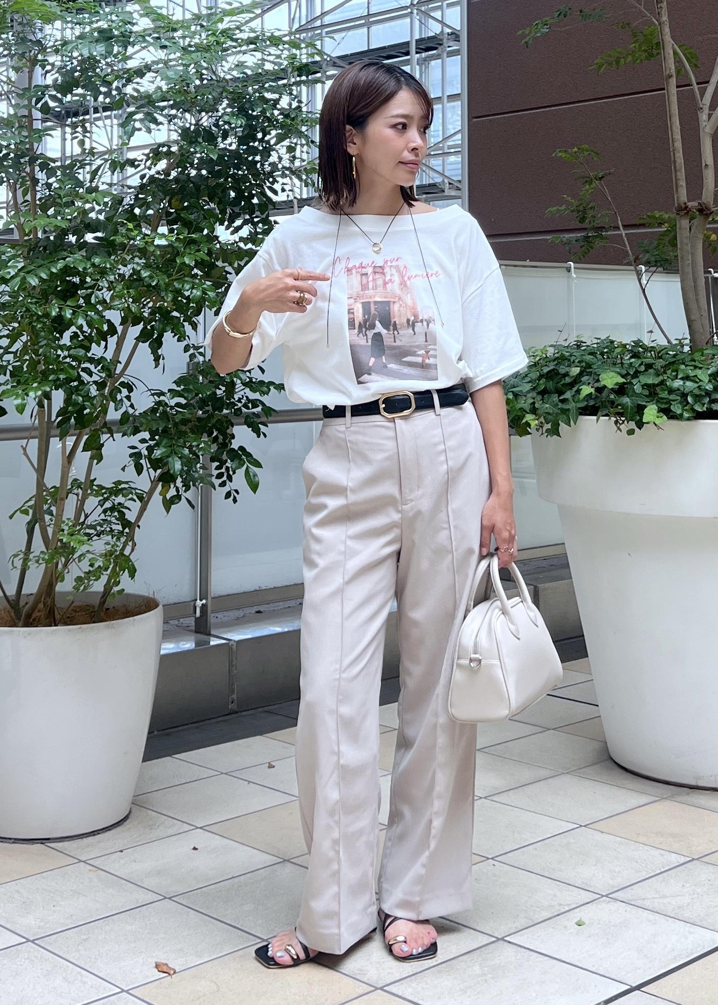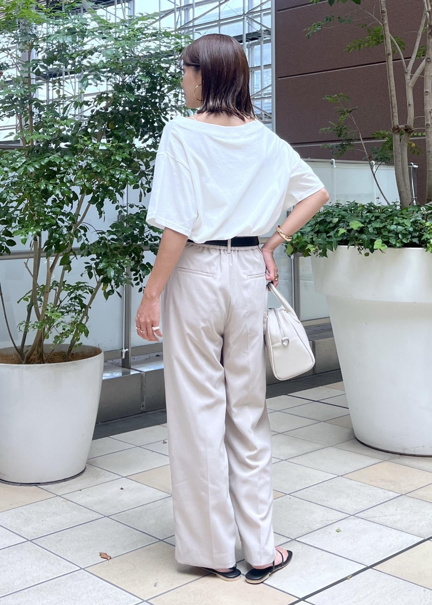 オフショルダーのスッキリ感のあるTシャツは、ワントーンでまとめて大人カジュアルな着こなしに。
