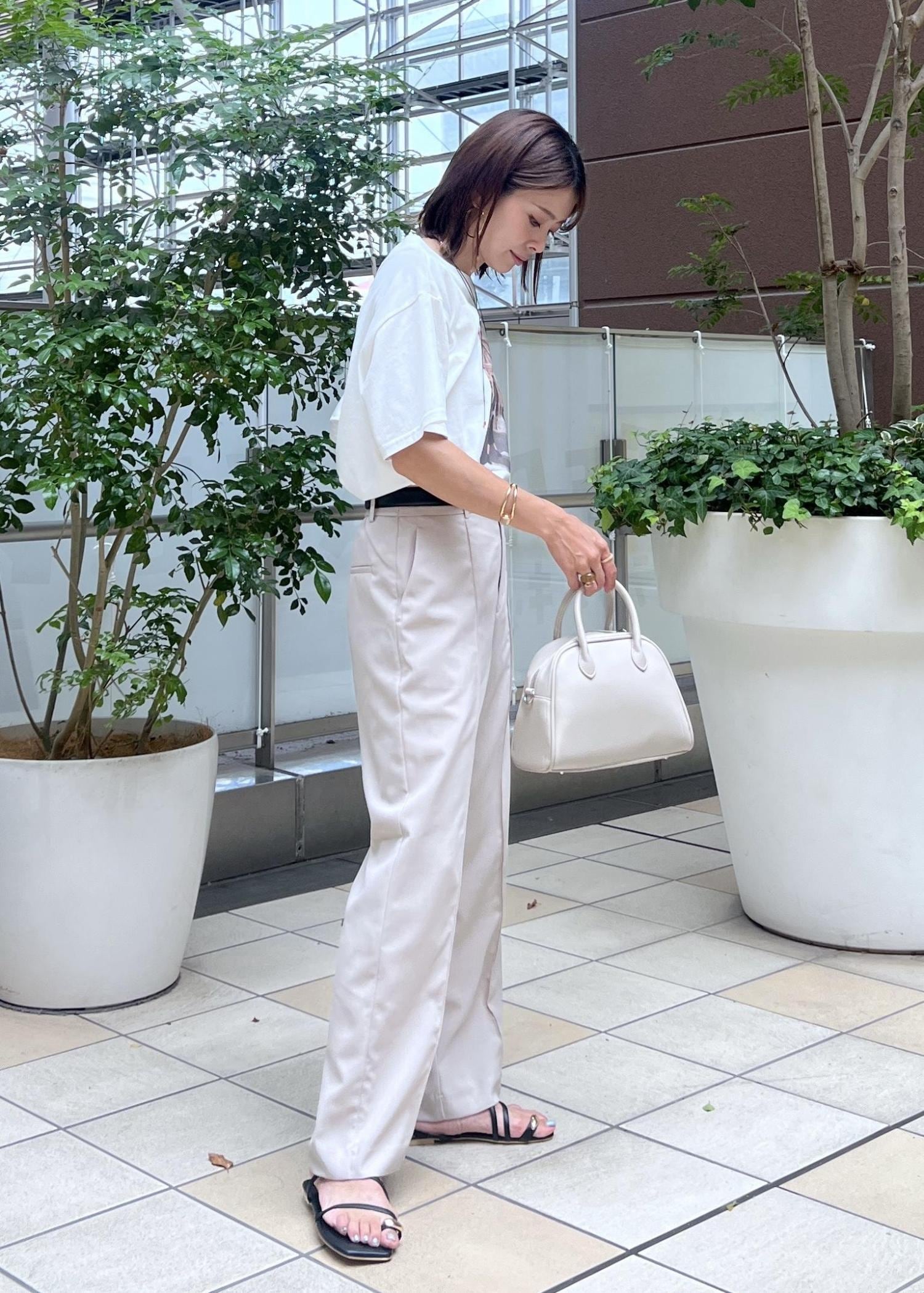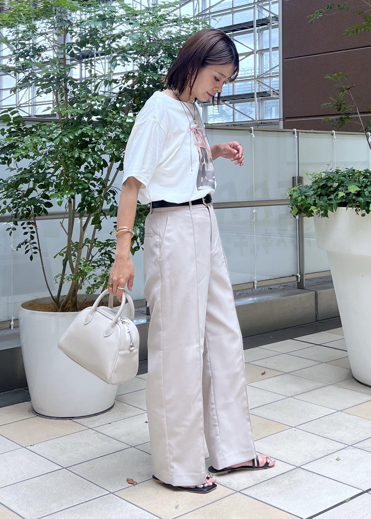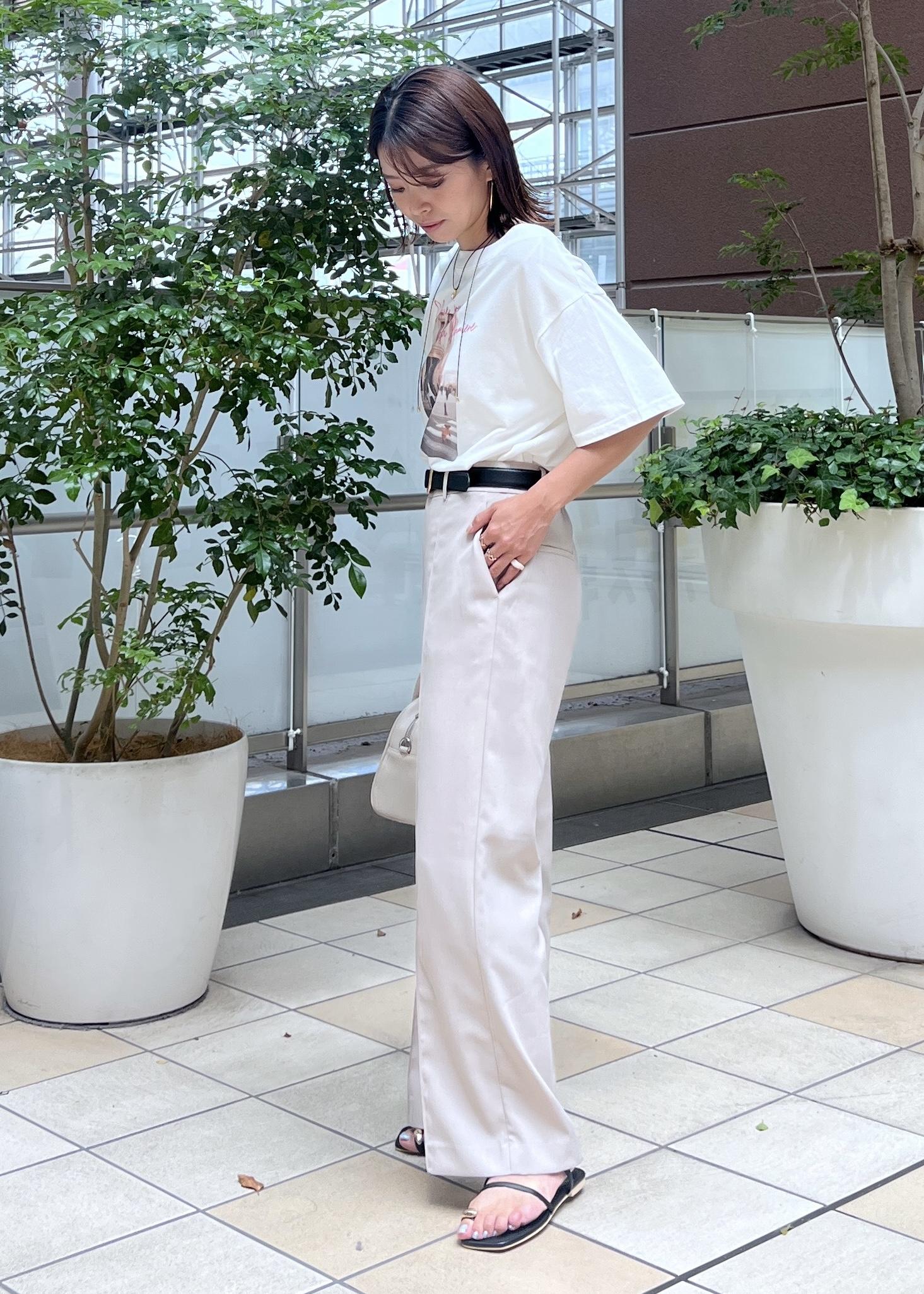 オフショルダーのスッキリ感のあるTシャツは、ワントーンでまとめて大人カジュアルな着こなしに。