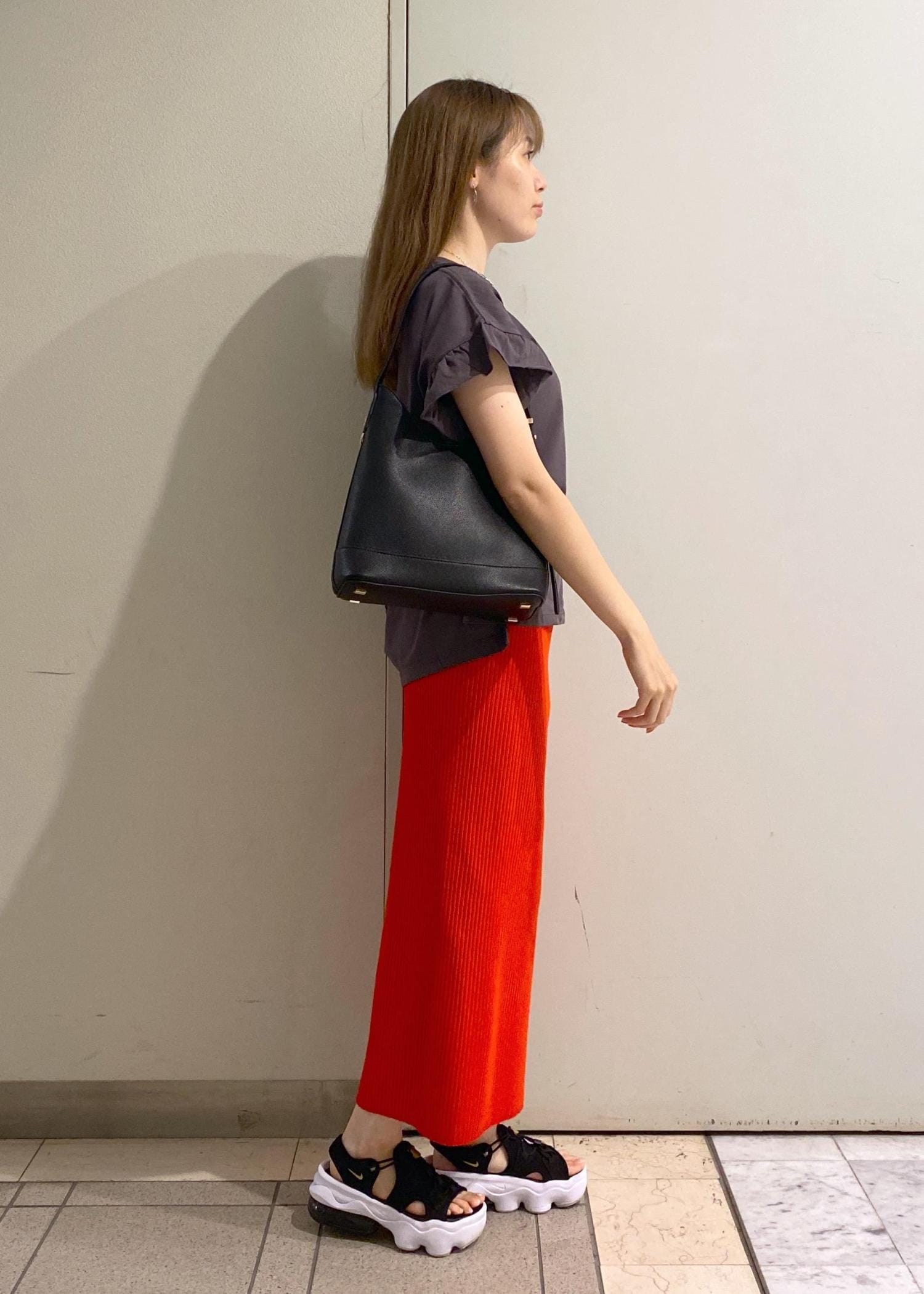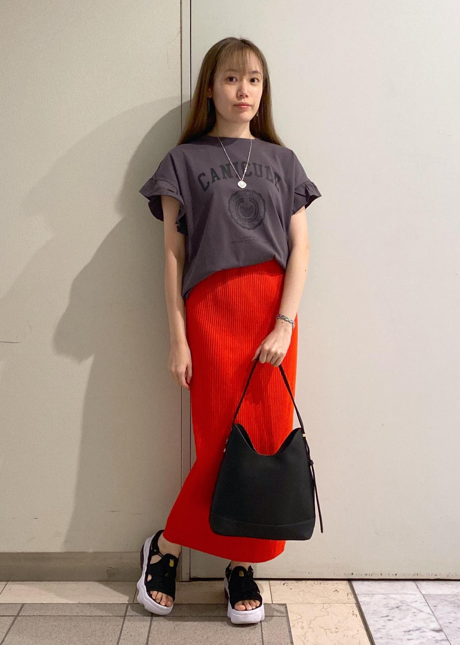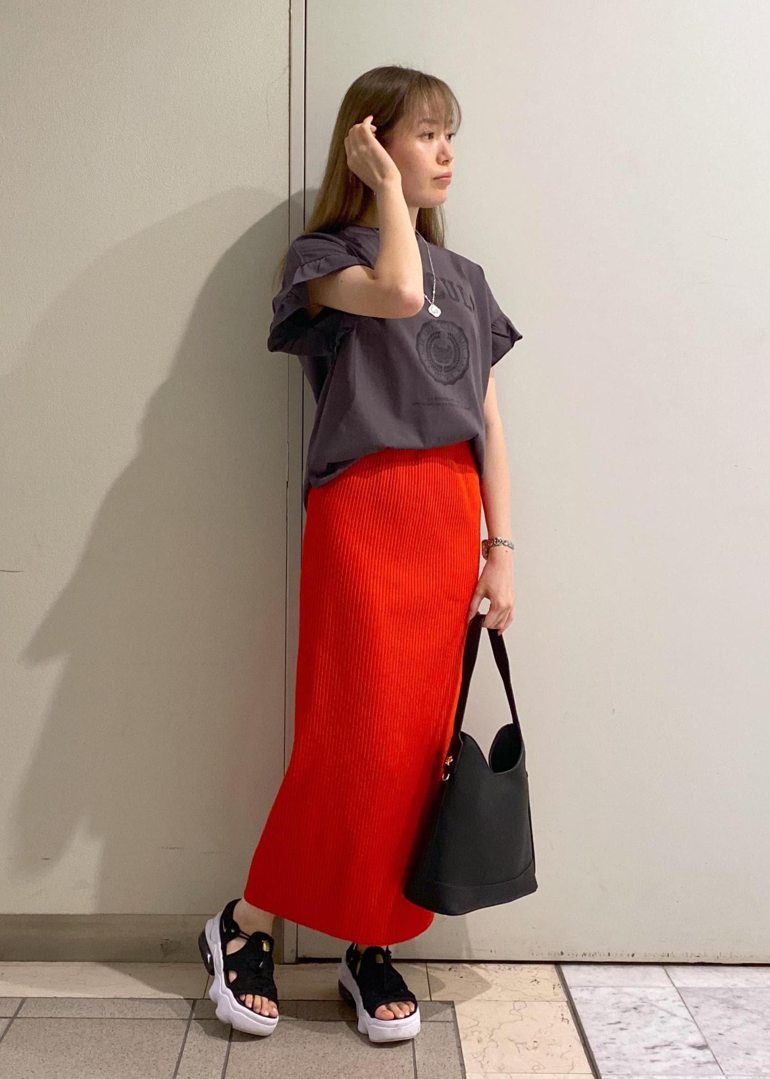 スカートのカラーが映えるように、トップスはベーシックカラーをチョイス。