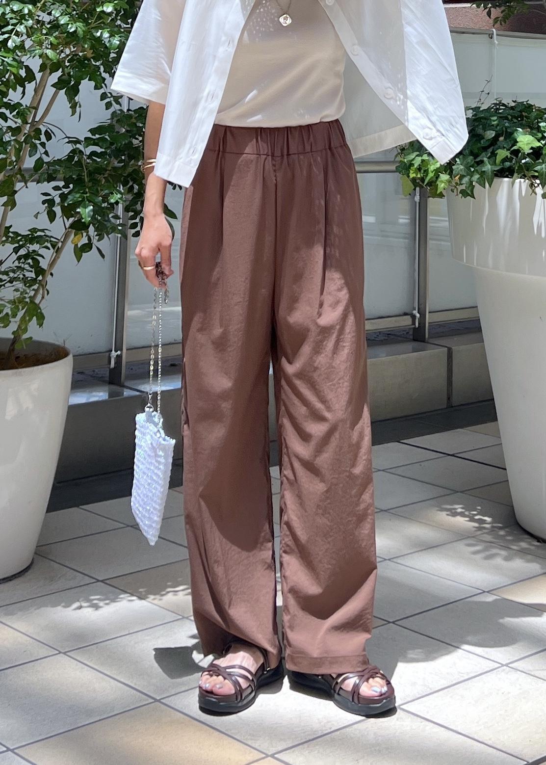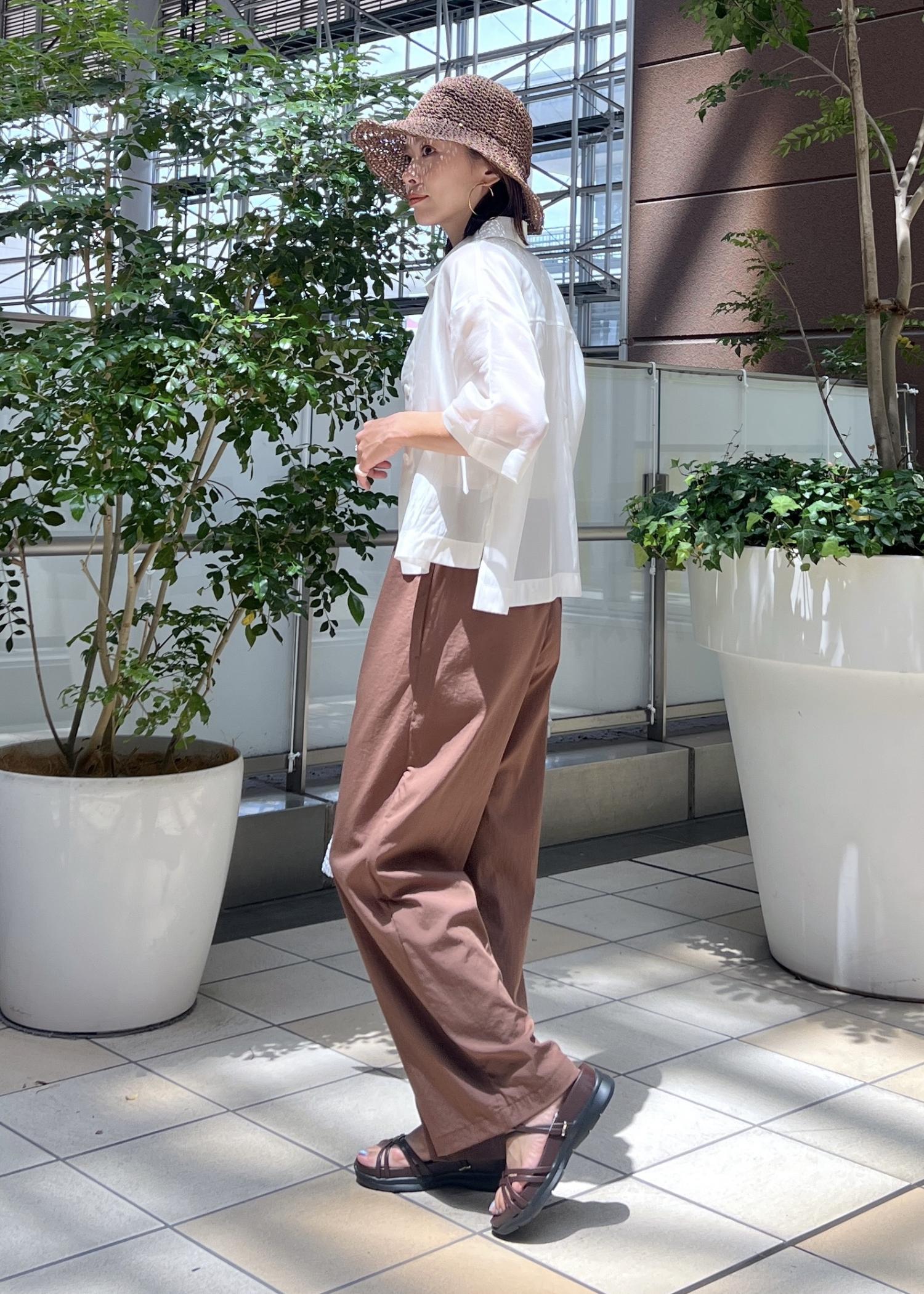 リラックス感のあるワイドパンツはブラウンを主役にして、夏お出かけスタイルに。