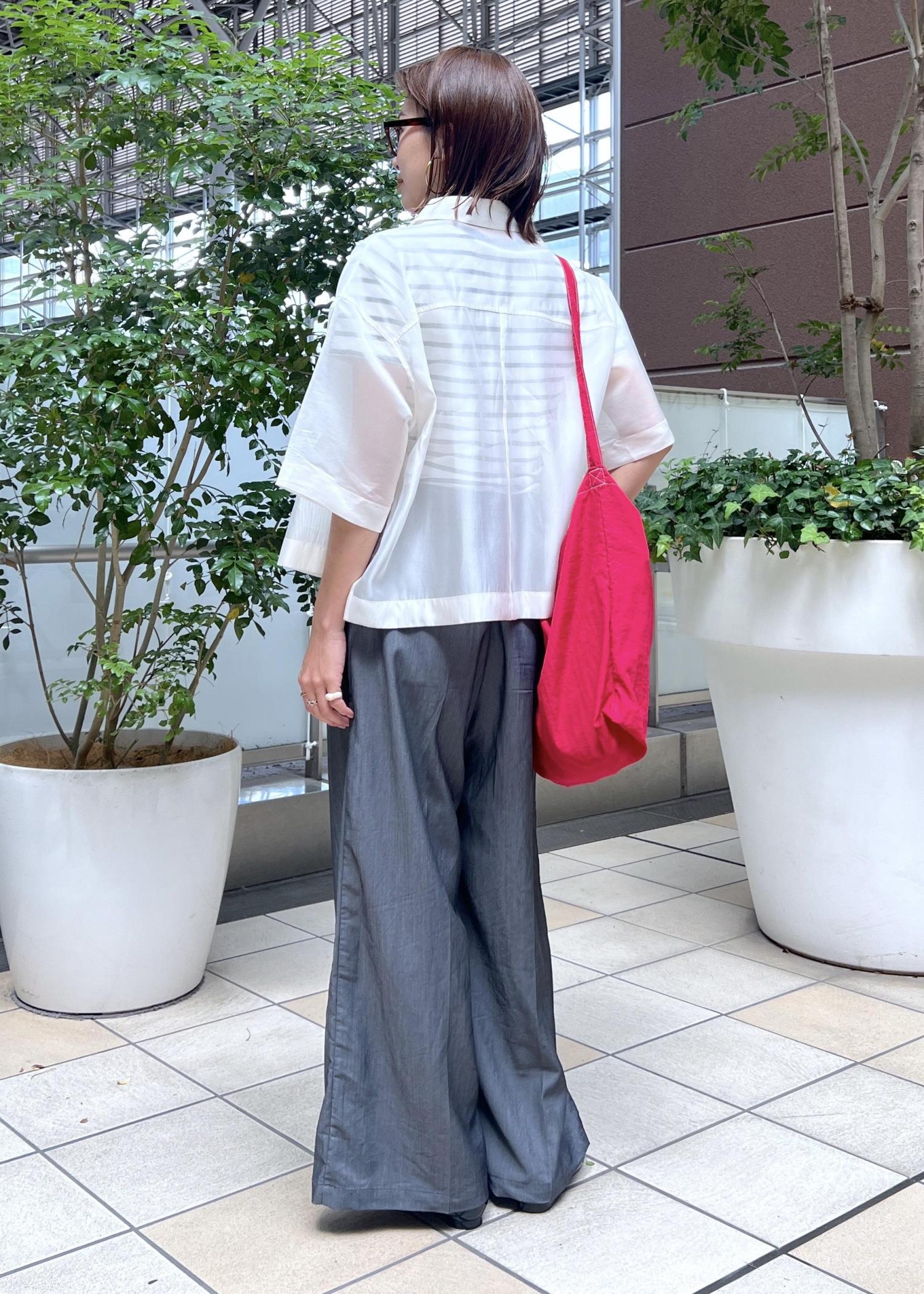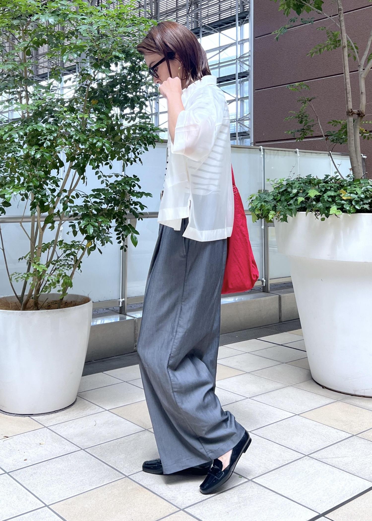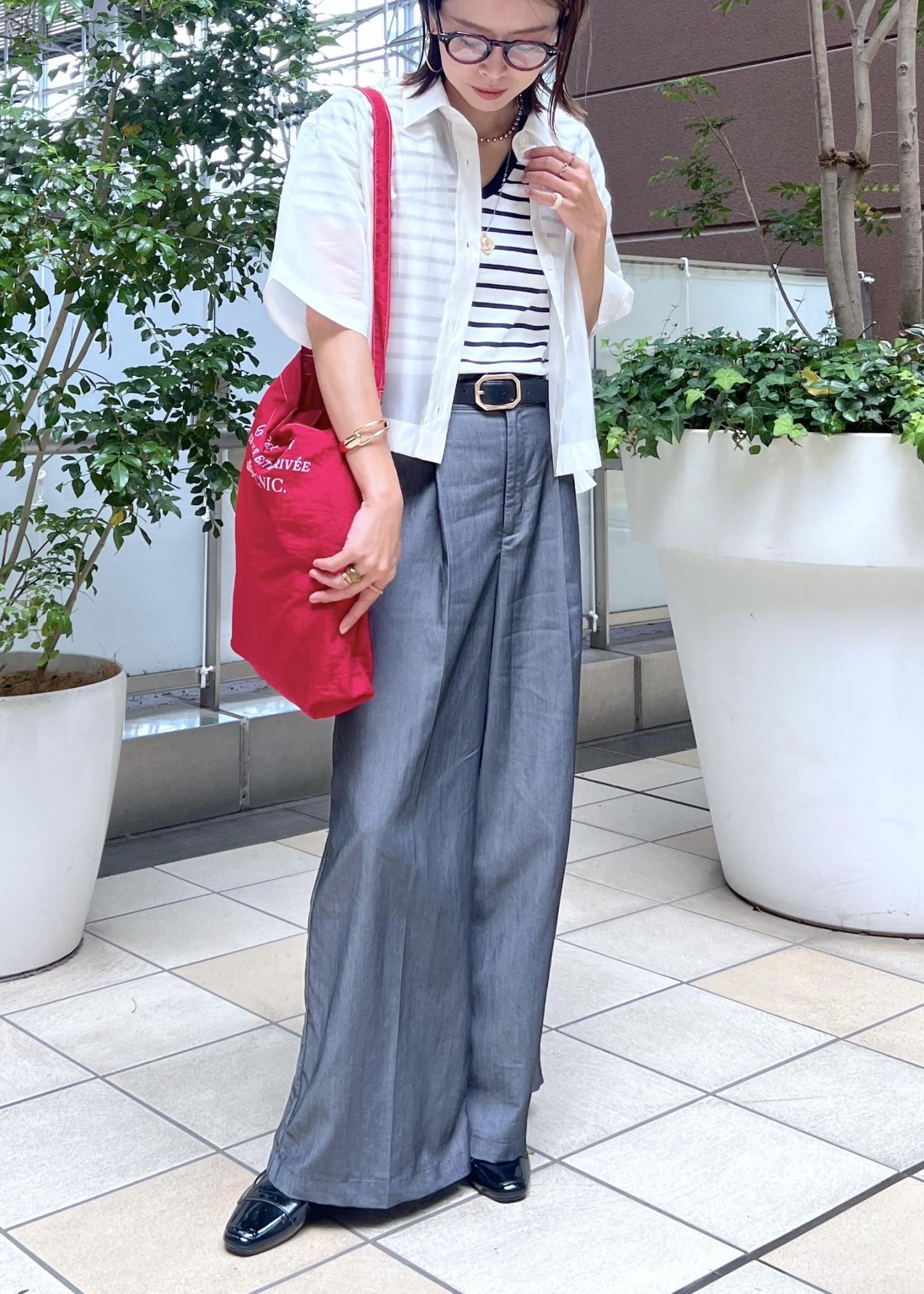 赤のバッグを差し色にラフになりすぎない大人カジュアルな着こなしにしました。