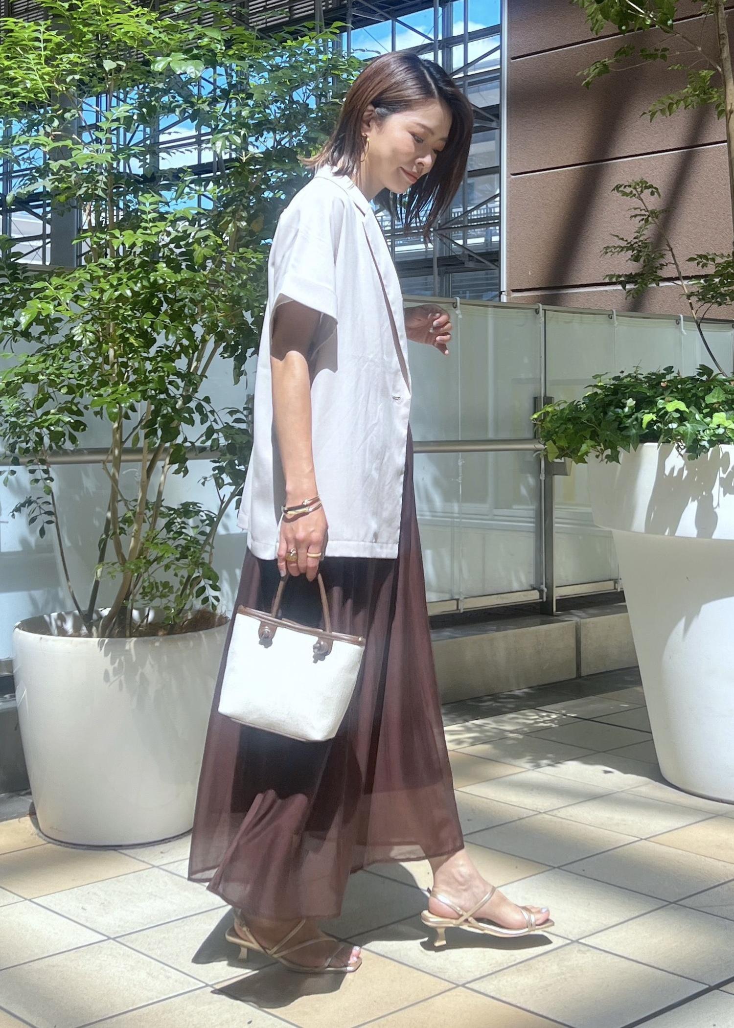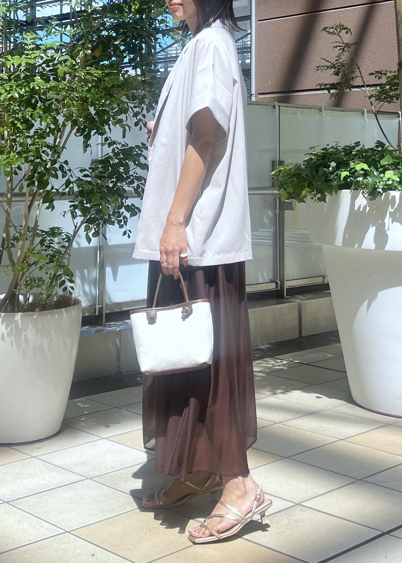 ベージュ×ブラウンのカラーの組み合わせは、今から秋まで着られるカラー使いで長く着回しできておすすめです。