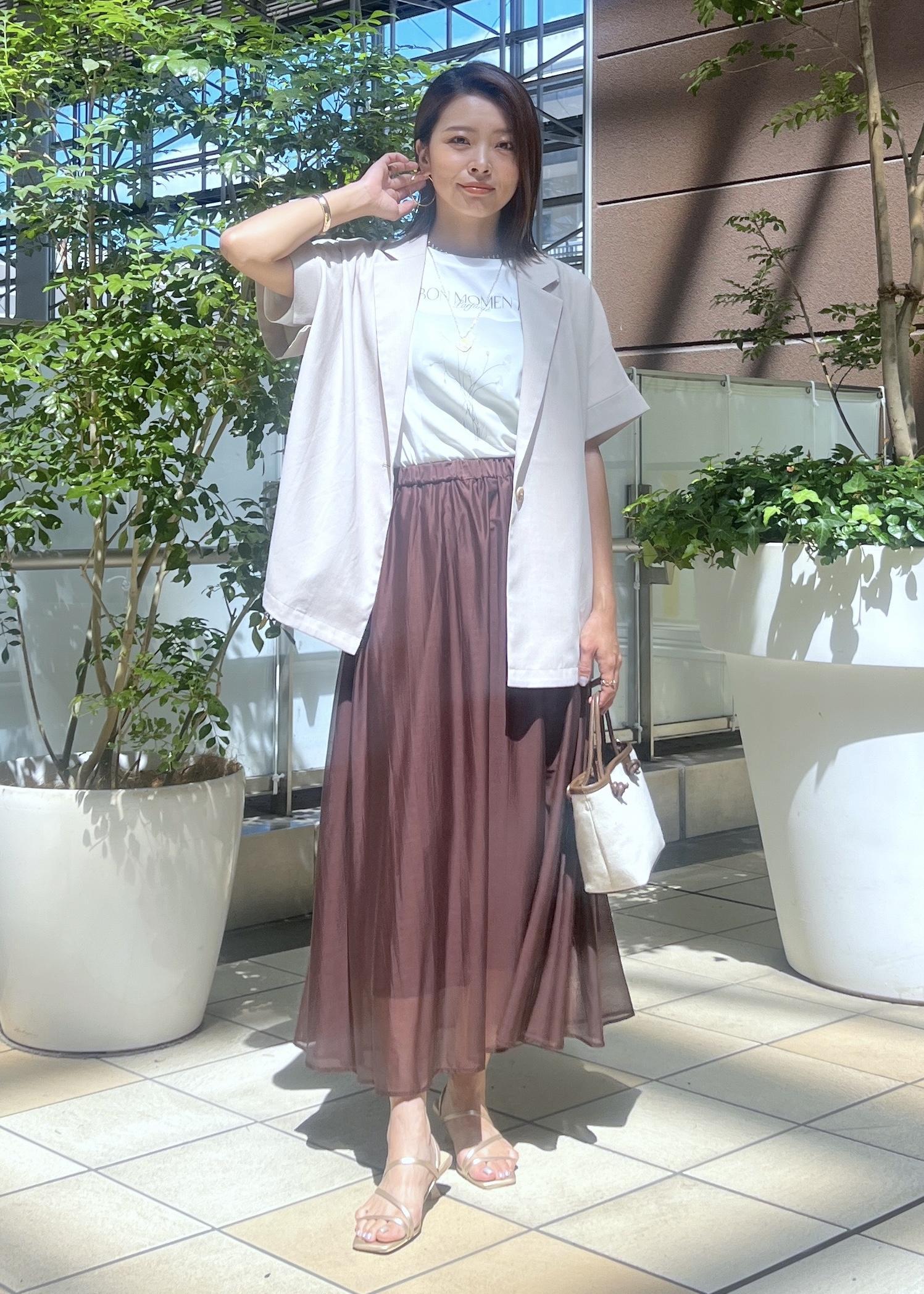プリントTシャツにフレアスカートを合わせて、大人カジュアルなスタイリングにしました。