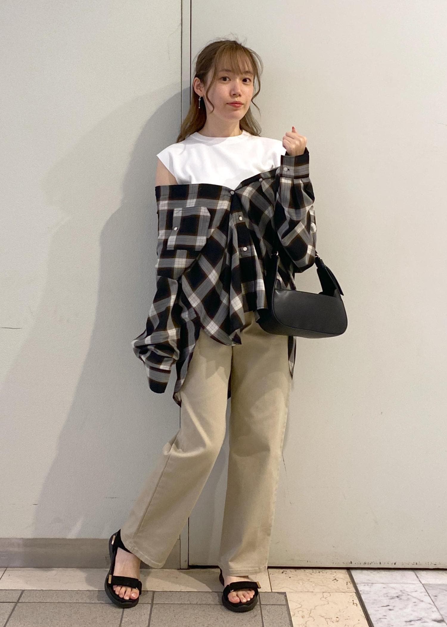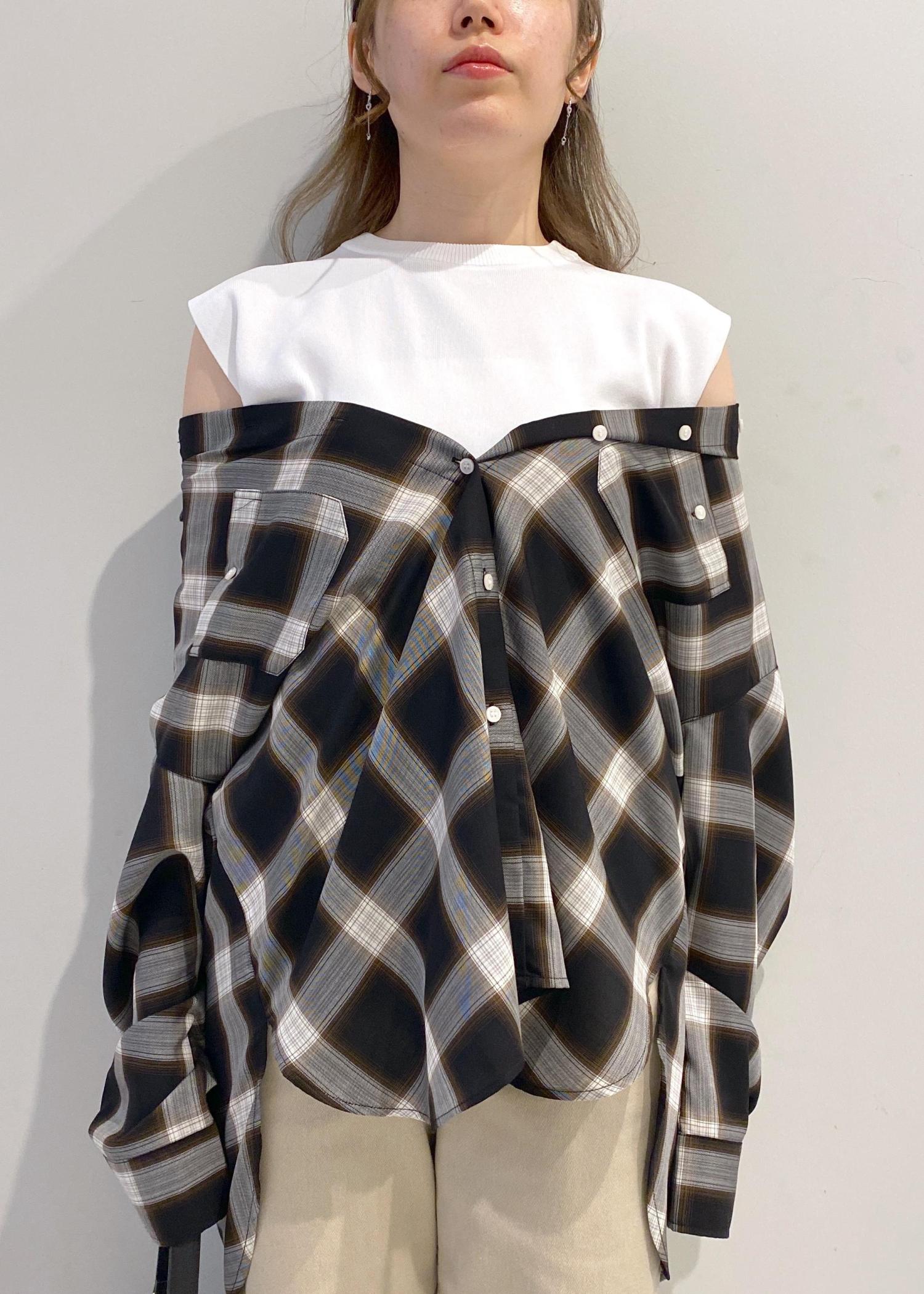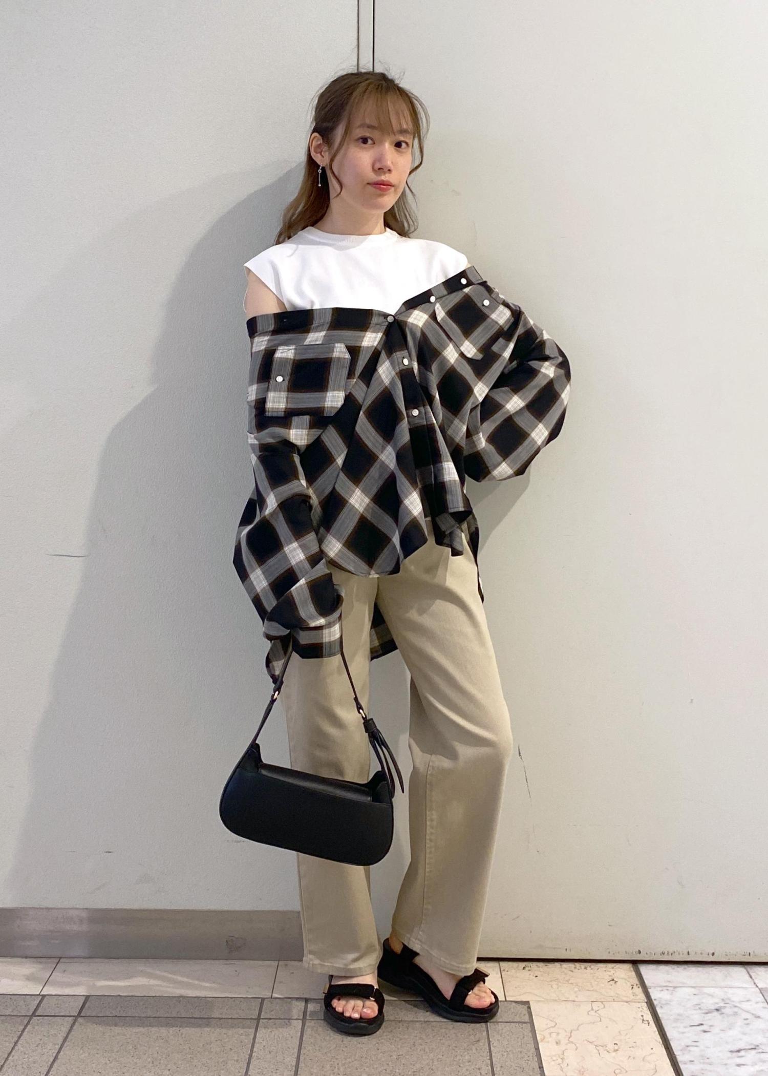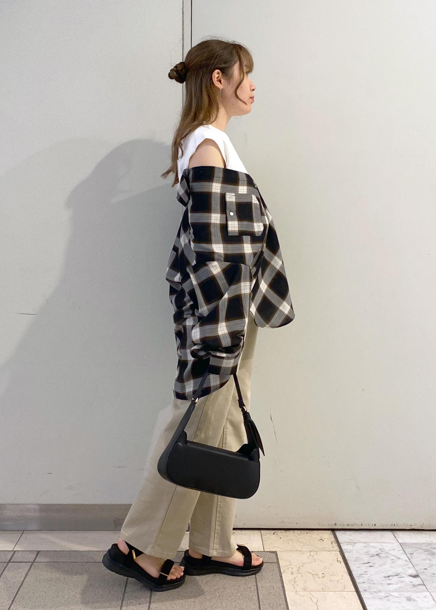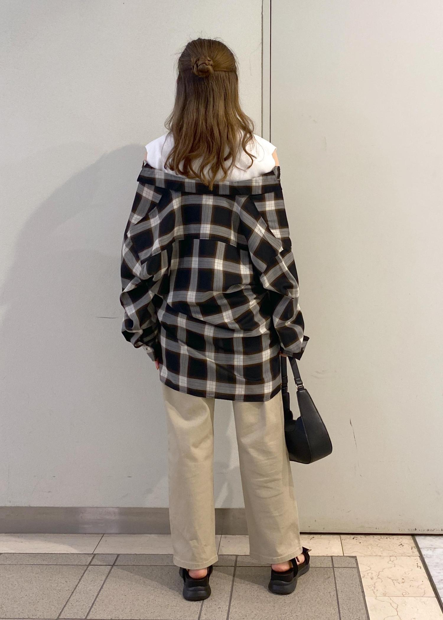 チェックシャツのルーズ感を活かして、肩出しトップス風の着こなしに。