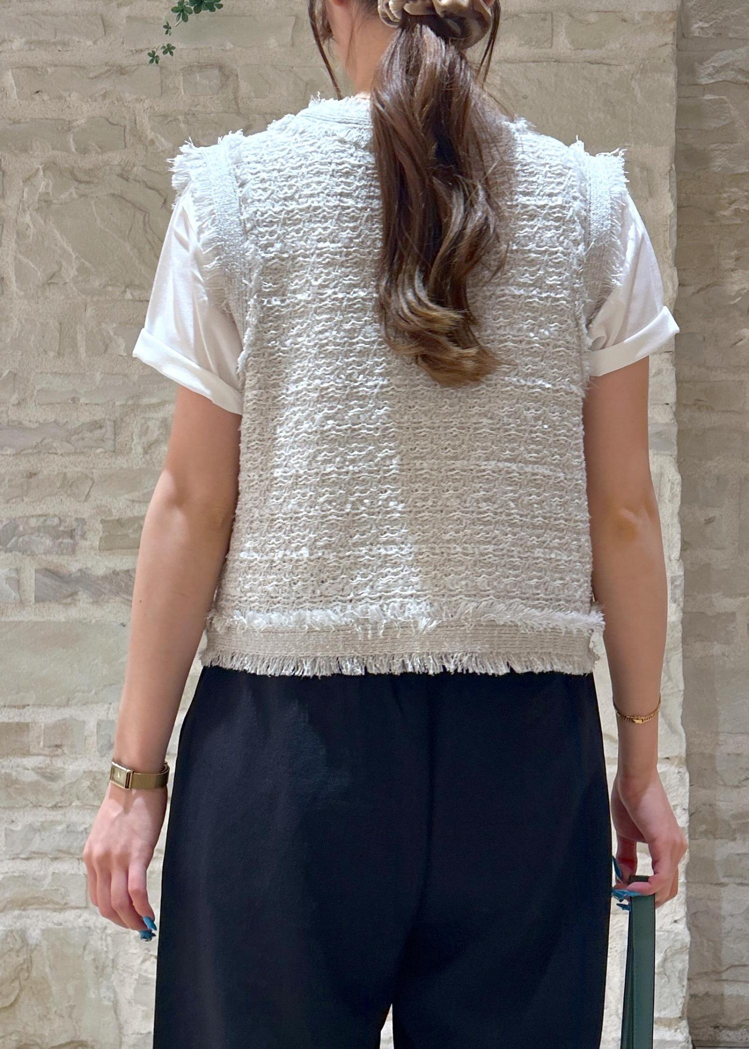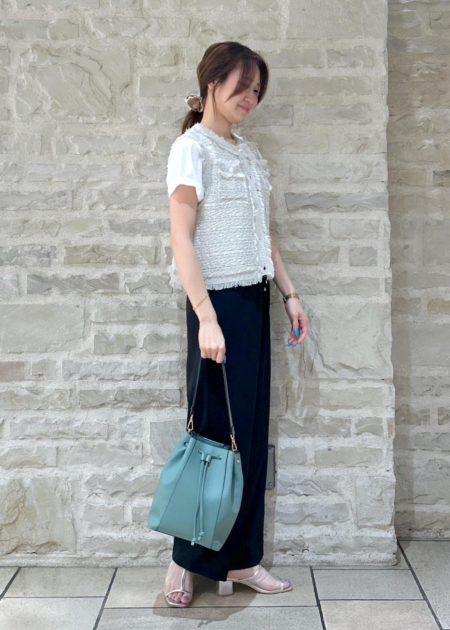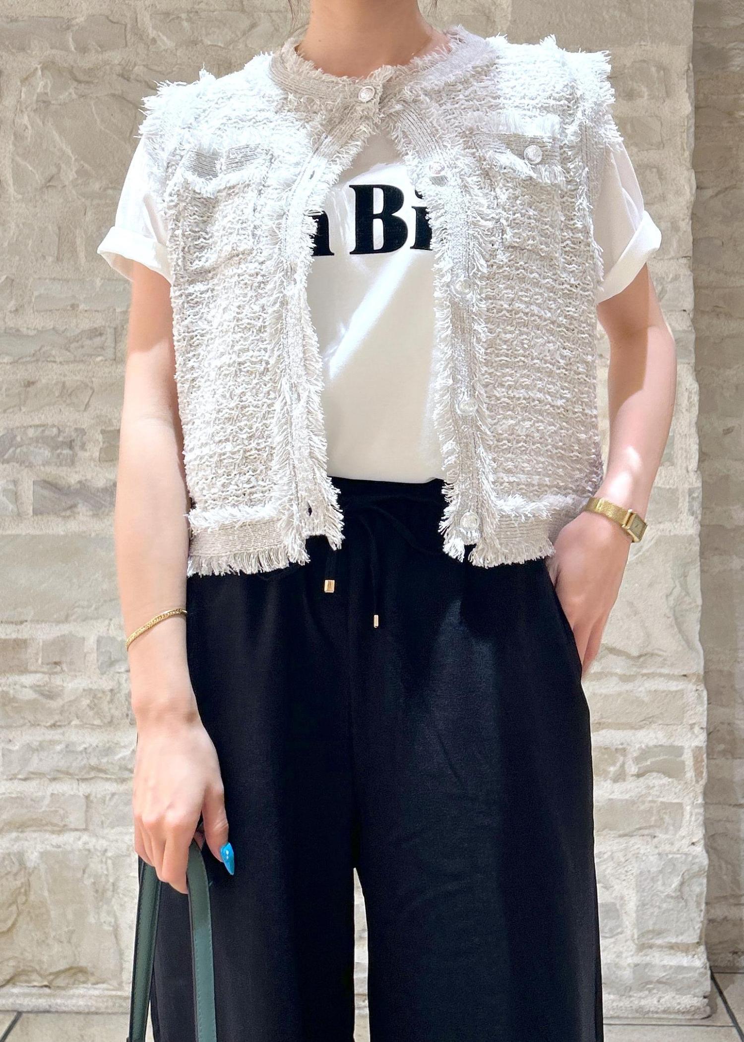 ロゴTシャツにツイードジレを合わせて大人っぽい夏のお出かけスタイルにしました。