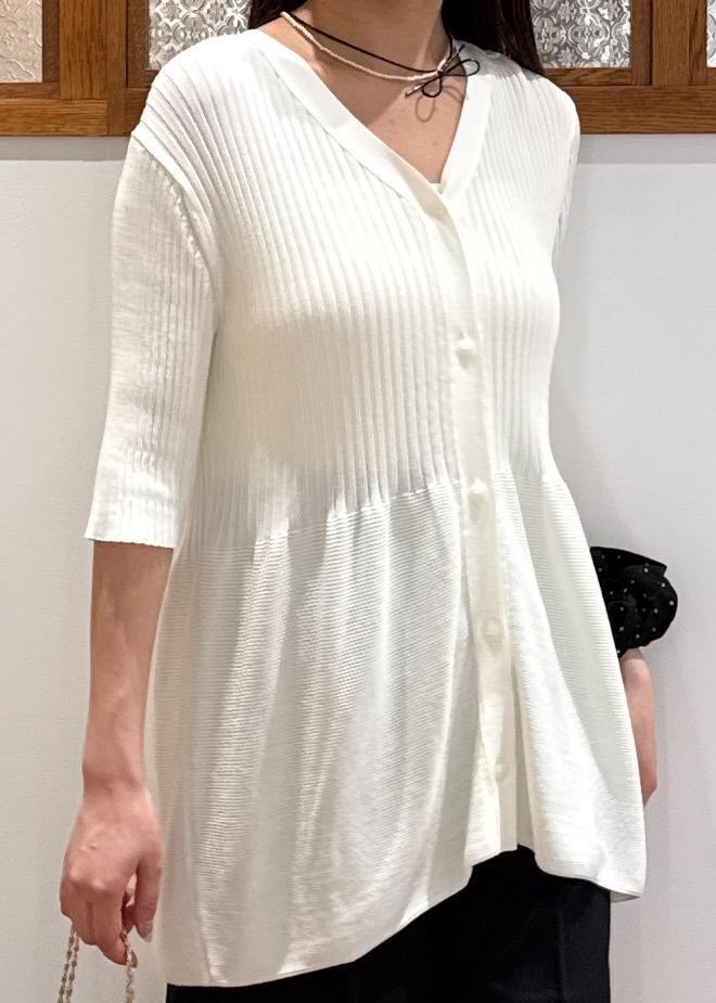 深めのVネックが大人らしく、ペプラムの甘さとのバランスが良いです。