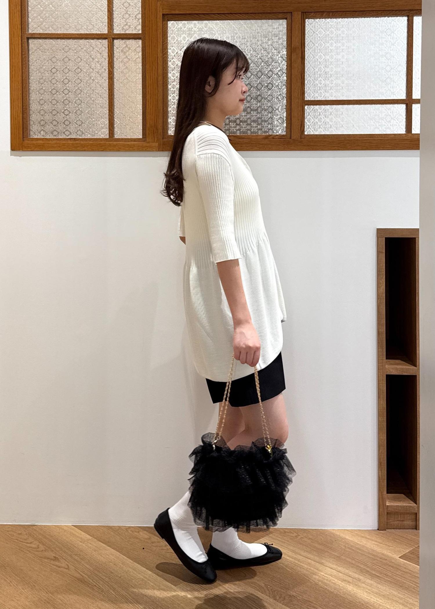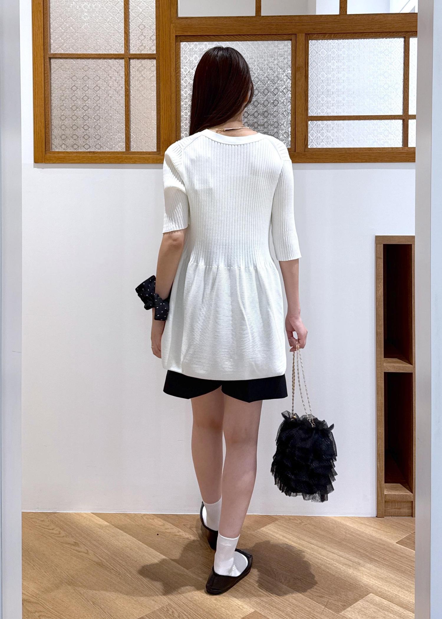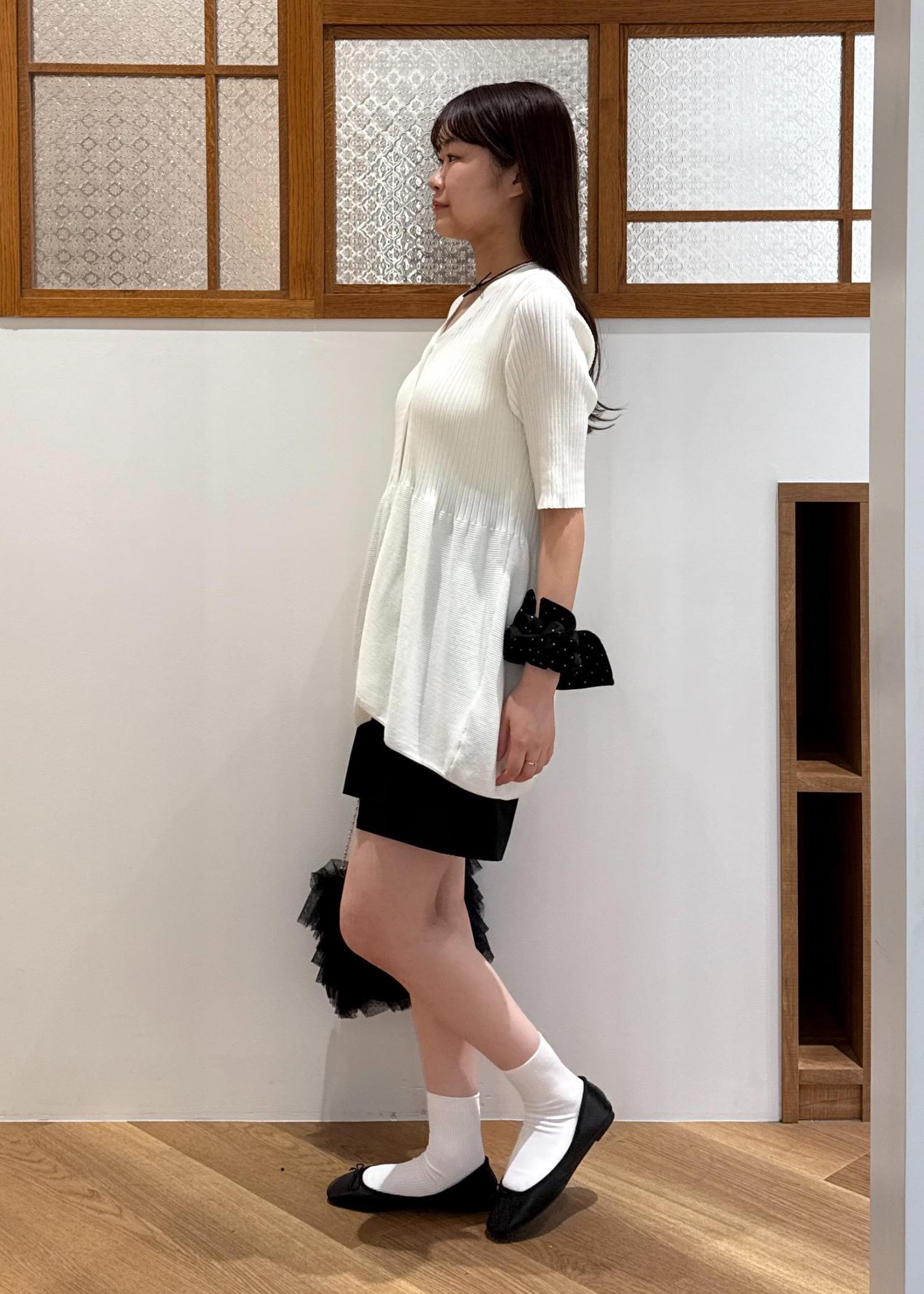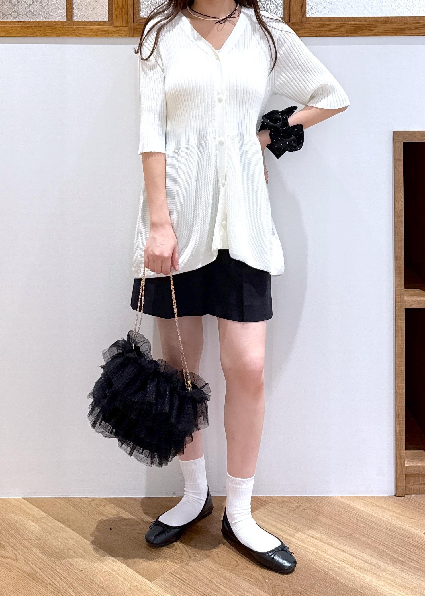 トレンド感のあるペプラムシルエットのカーディガンにショートパンツを合わせ、ヘルシーな肌見せを意識してみました。
