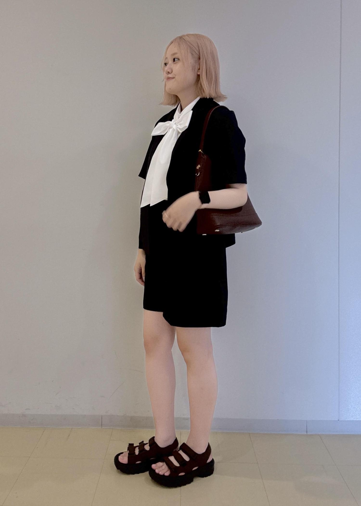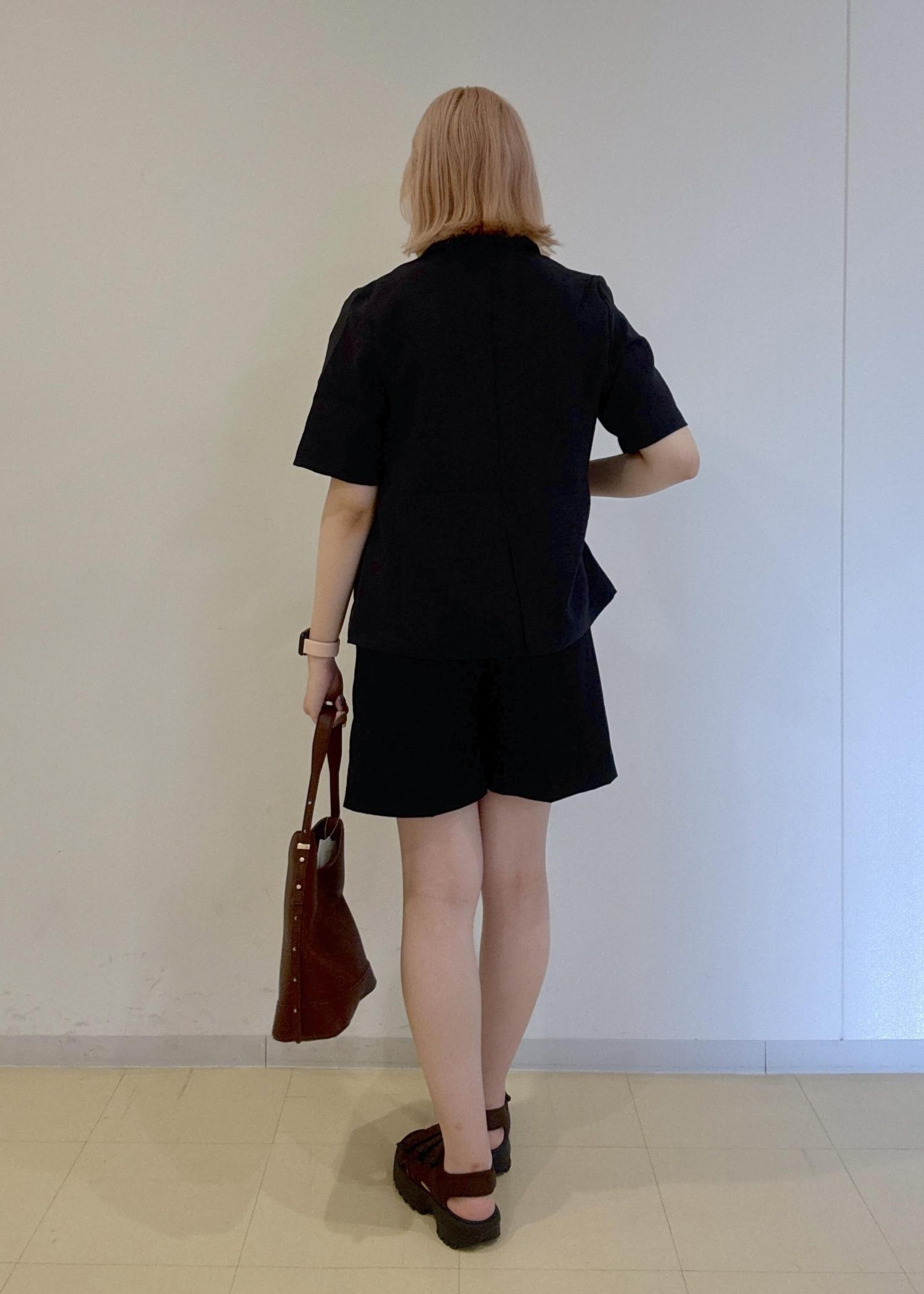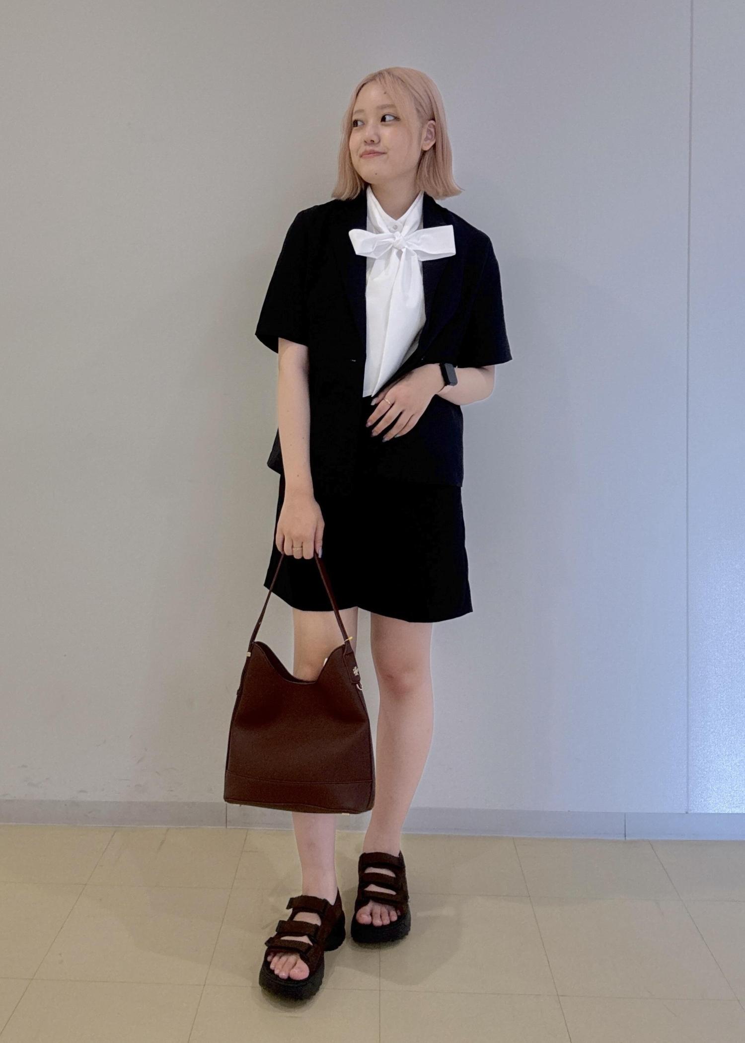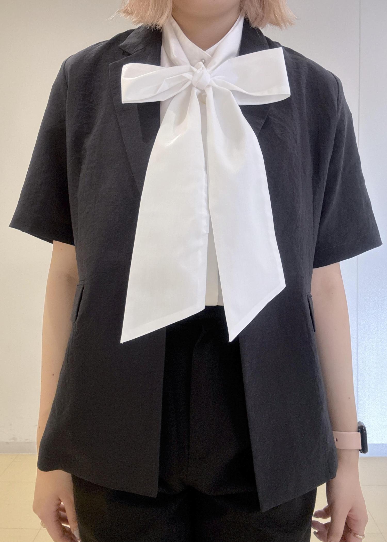 黒のジャケット、ハーフパンツでセットアップ風のコーディネート♡リボンタイのシャツを合わせて華やかさ、フェミニンさをプラス◎