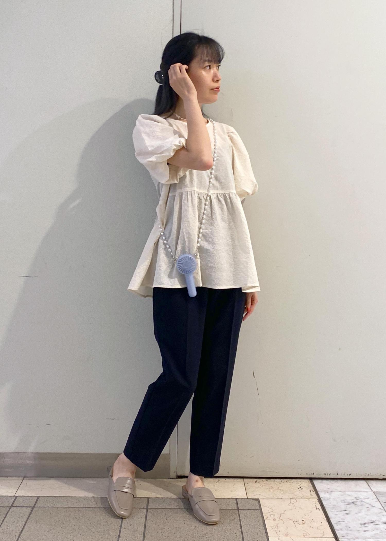 バルーンスリーブとペプラムシルエットが可愛らしいブラウスは、スラックスを合わせて甘さとカジュアルさのバランスをとりました。