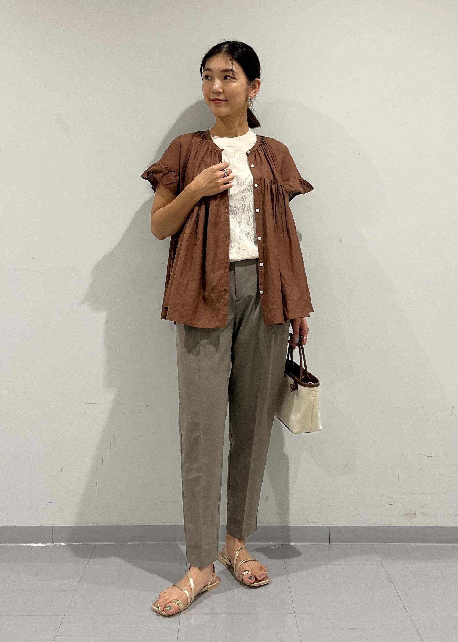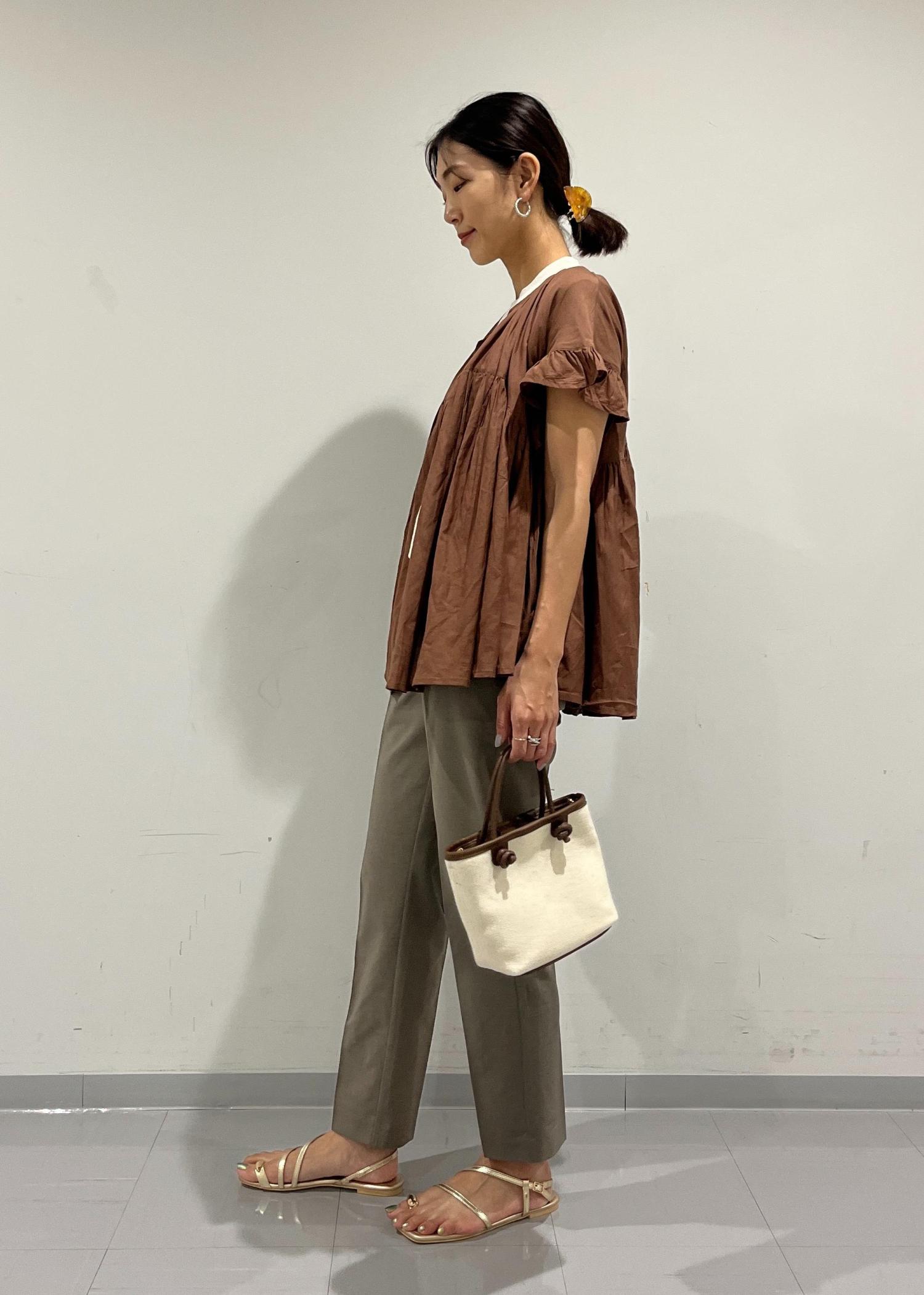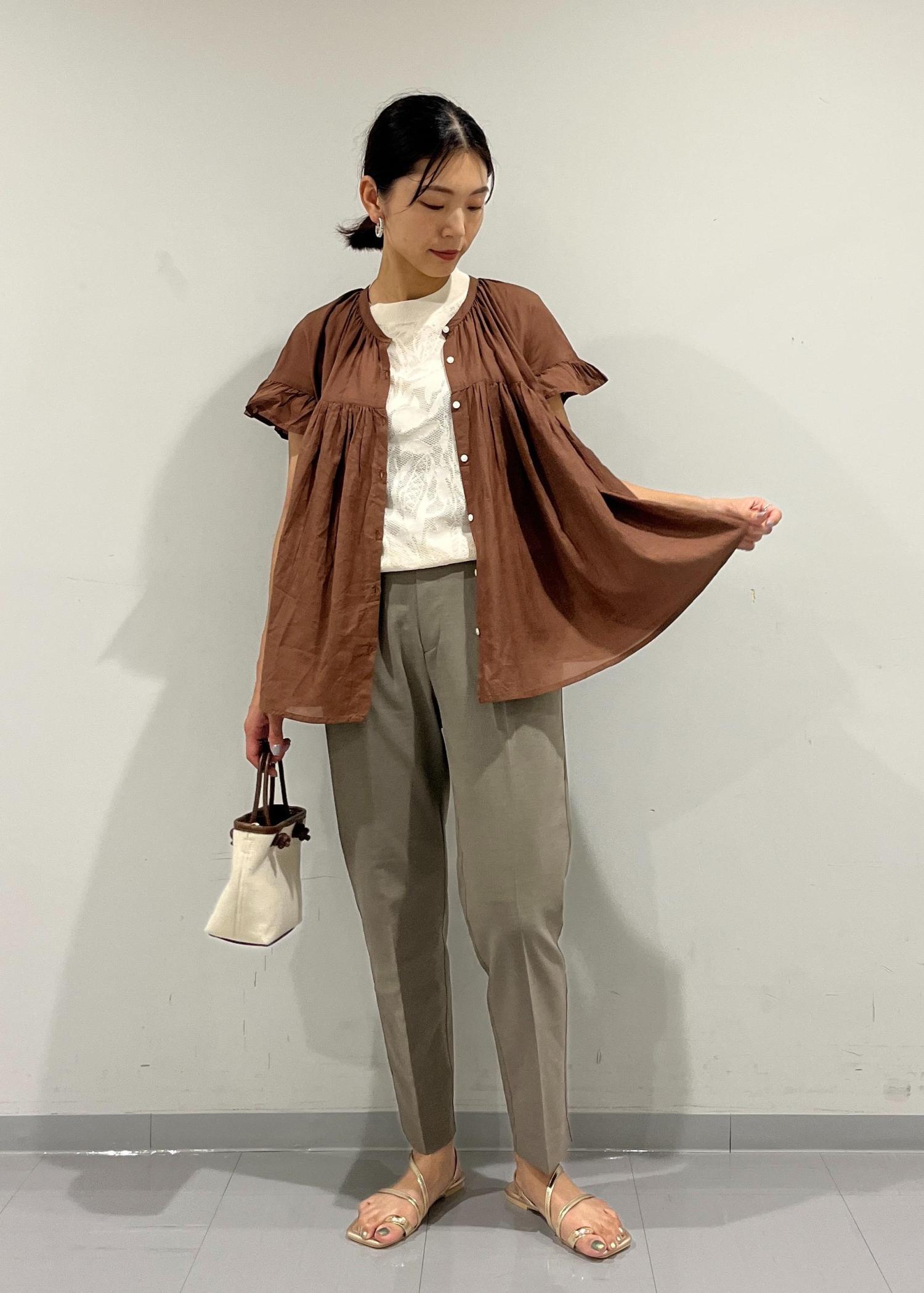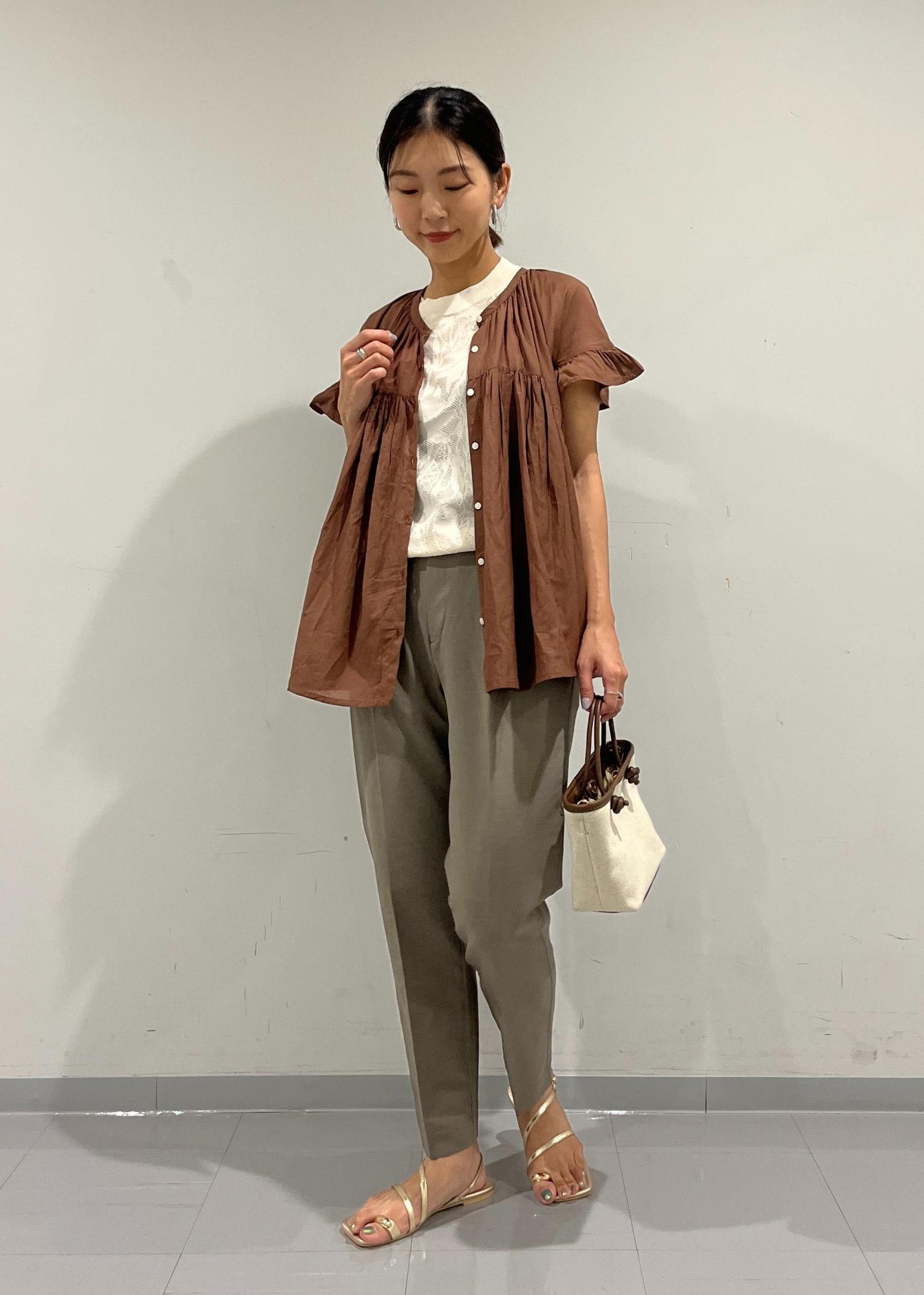ギャザーのふんわり感があるので、ボトムは縦ラインを作りやすいすっきりシルエットがおすすめです。 -