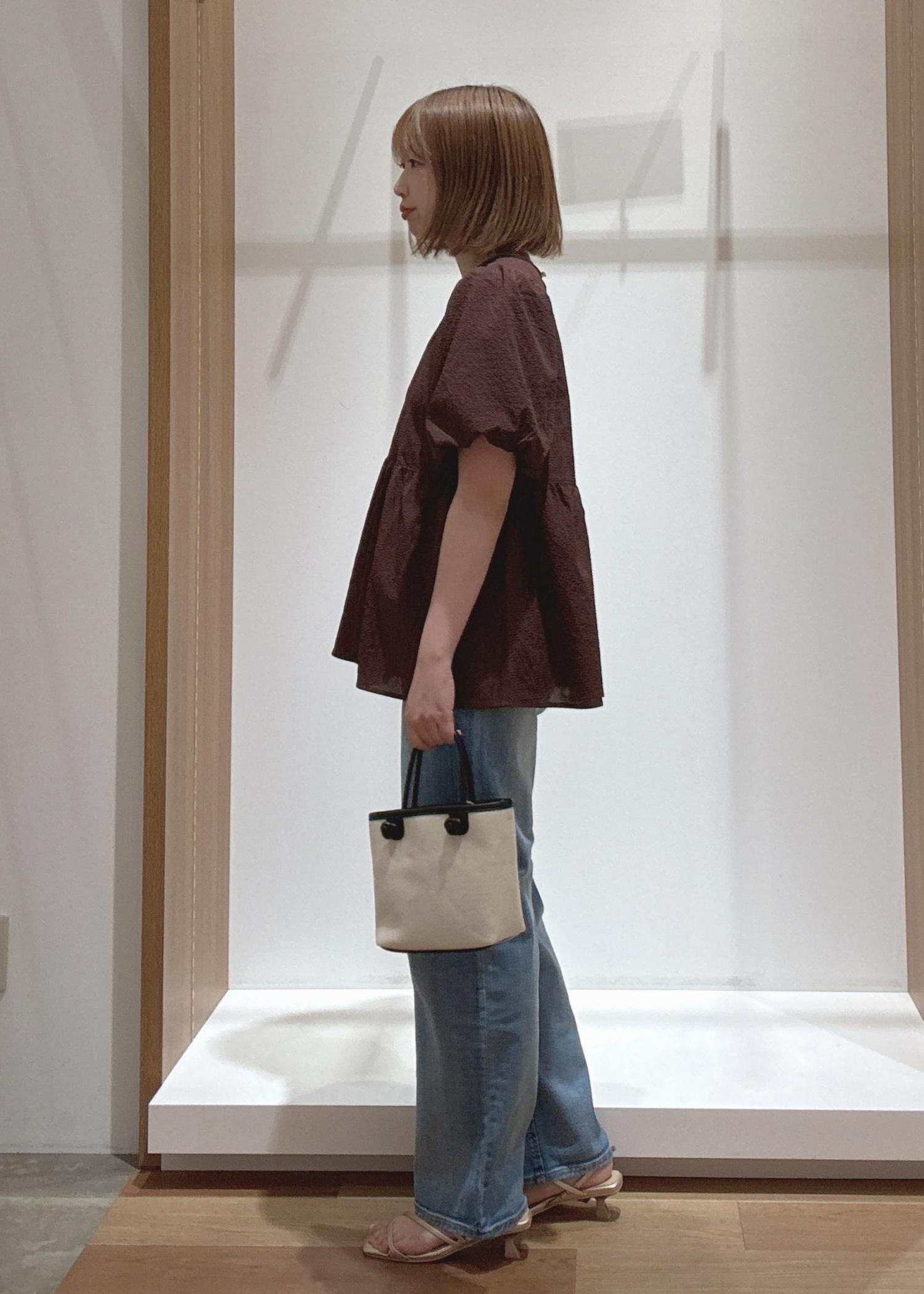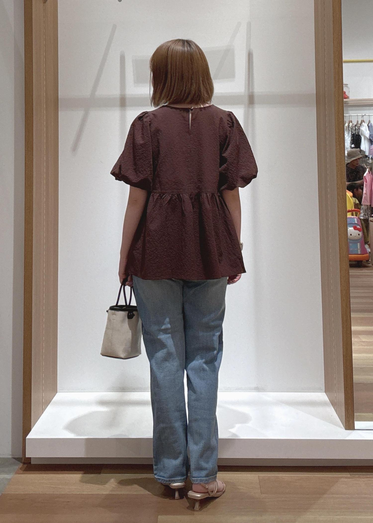 袖のバルーンシルエットとペプラムで女性らしいシルエットながら体型カバーもできる万能アイテムに、シンプルにデニムパンツを合わせてました◎