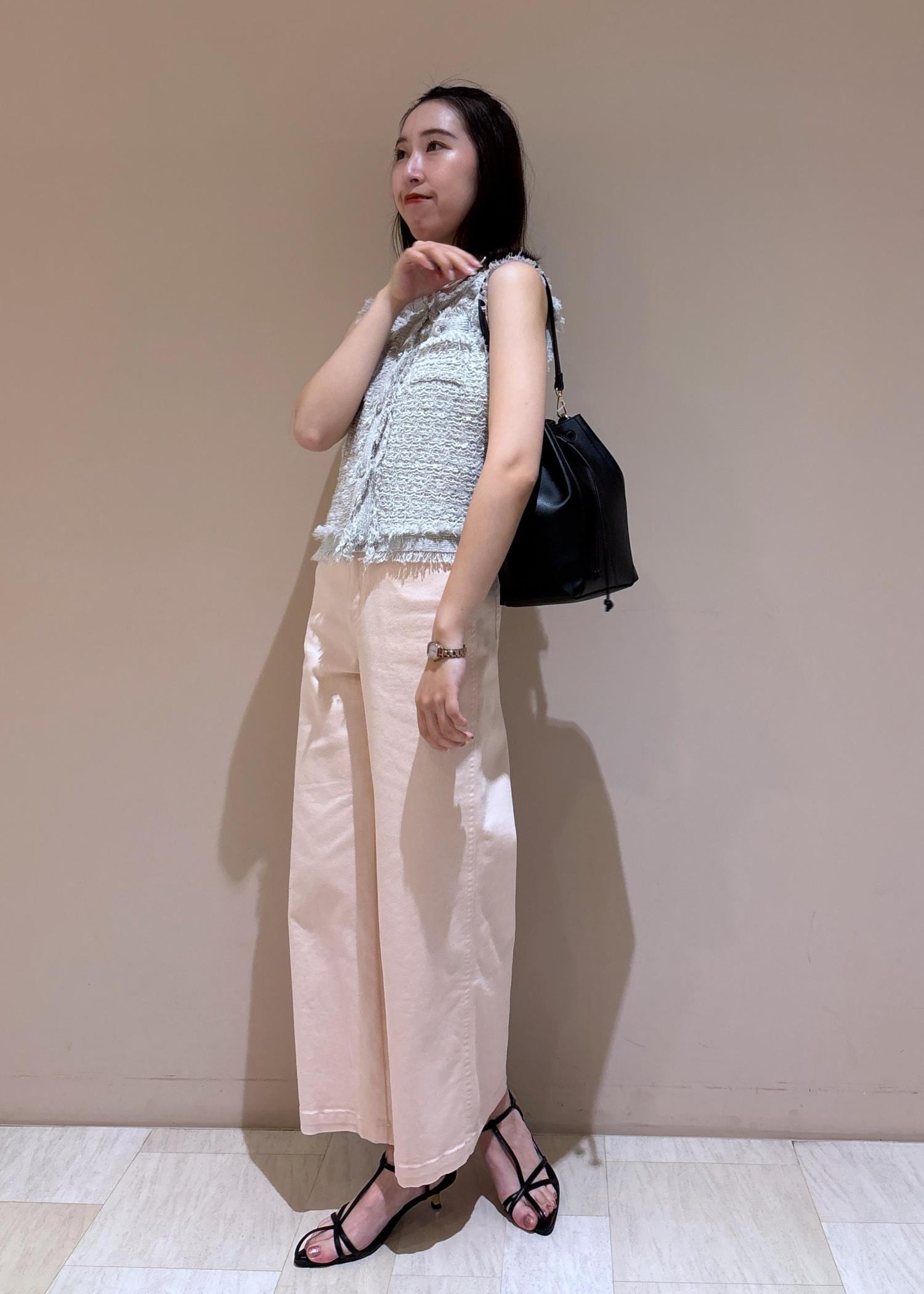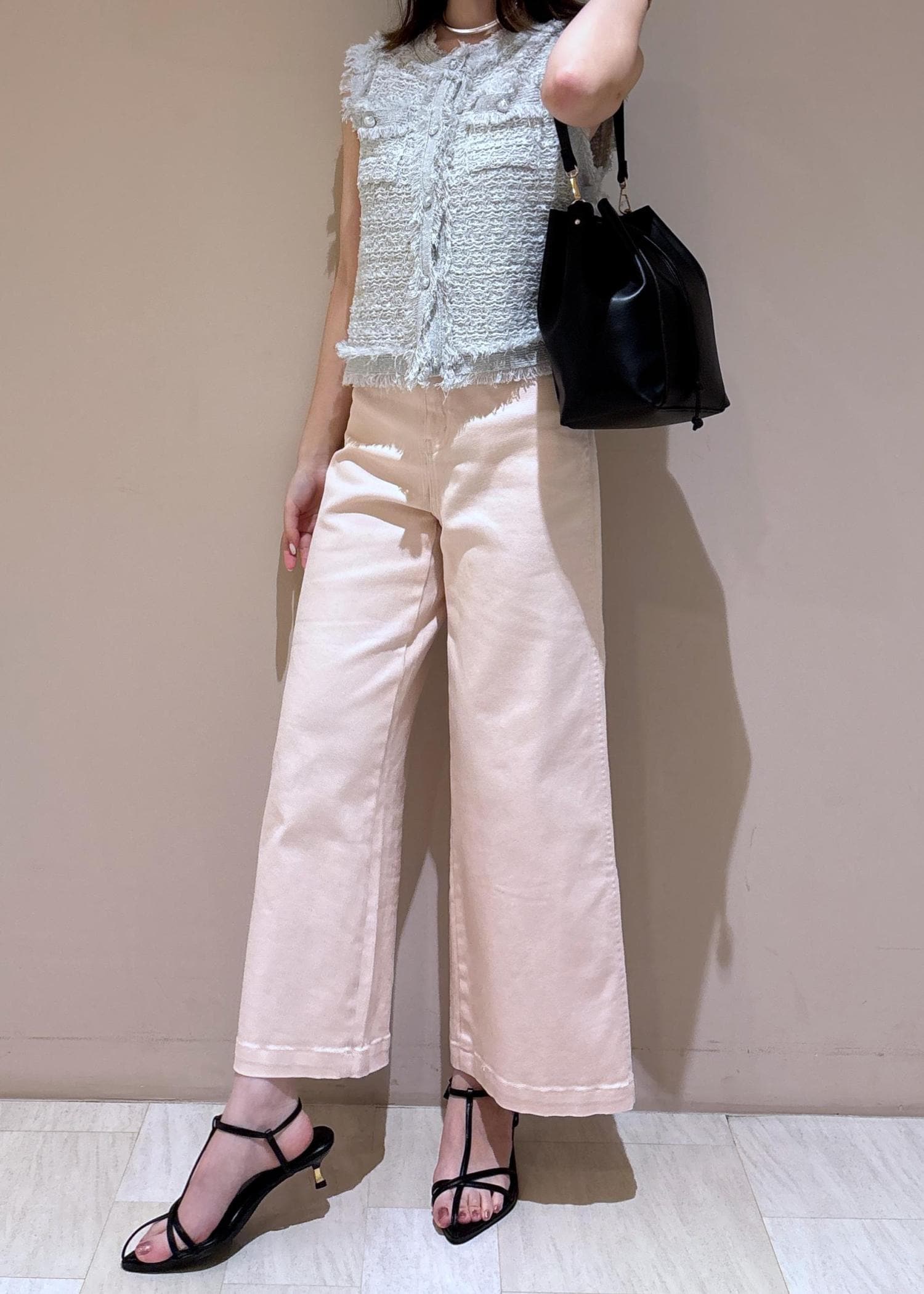 トレンドのツイードカーディガンとピンクデニムパンツを使った夏コーデ。
