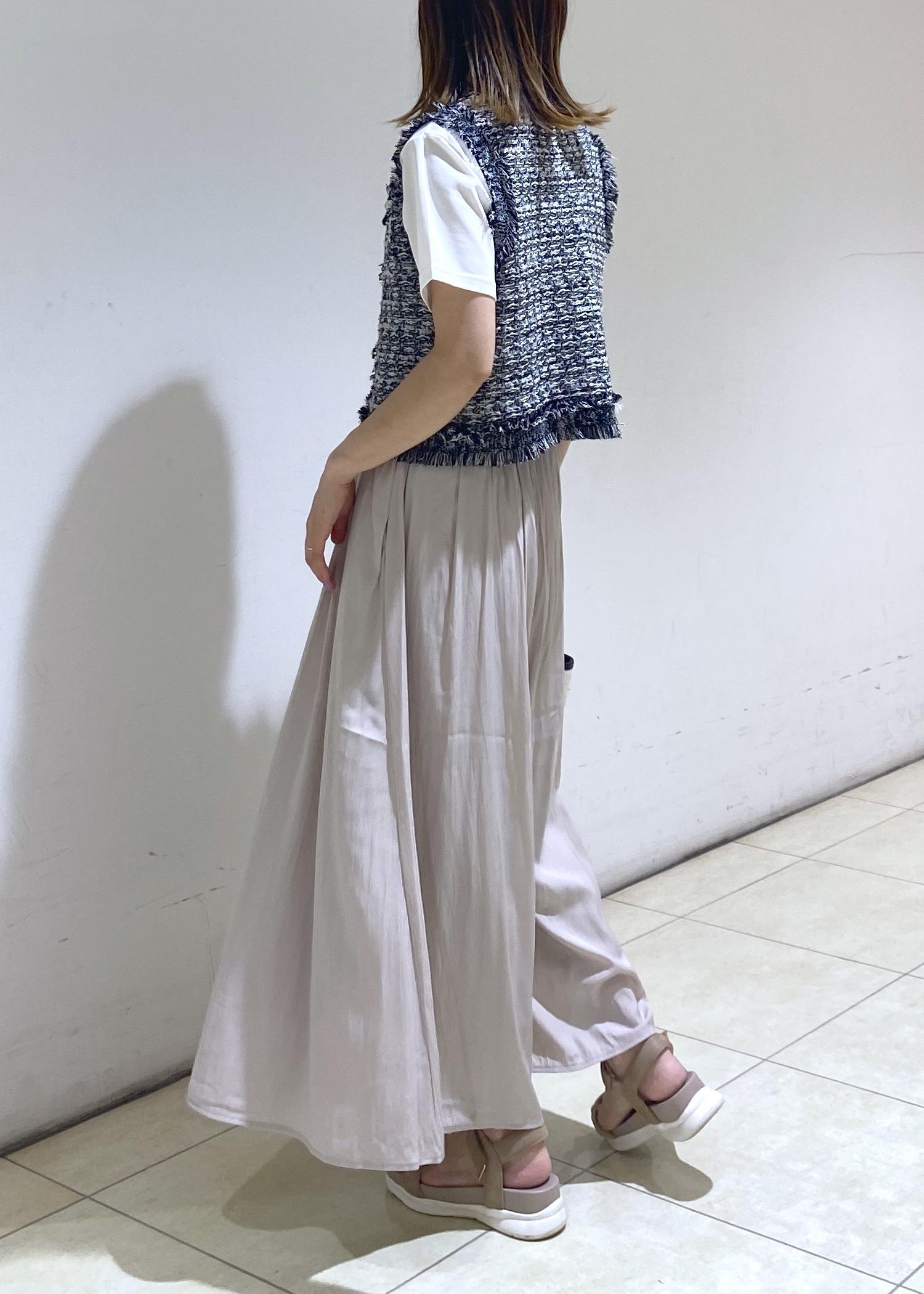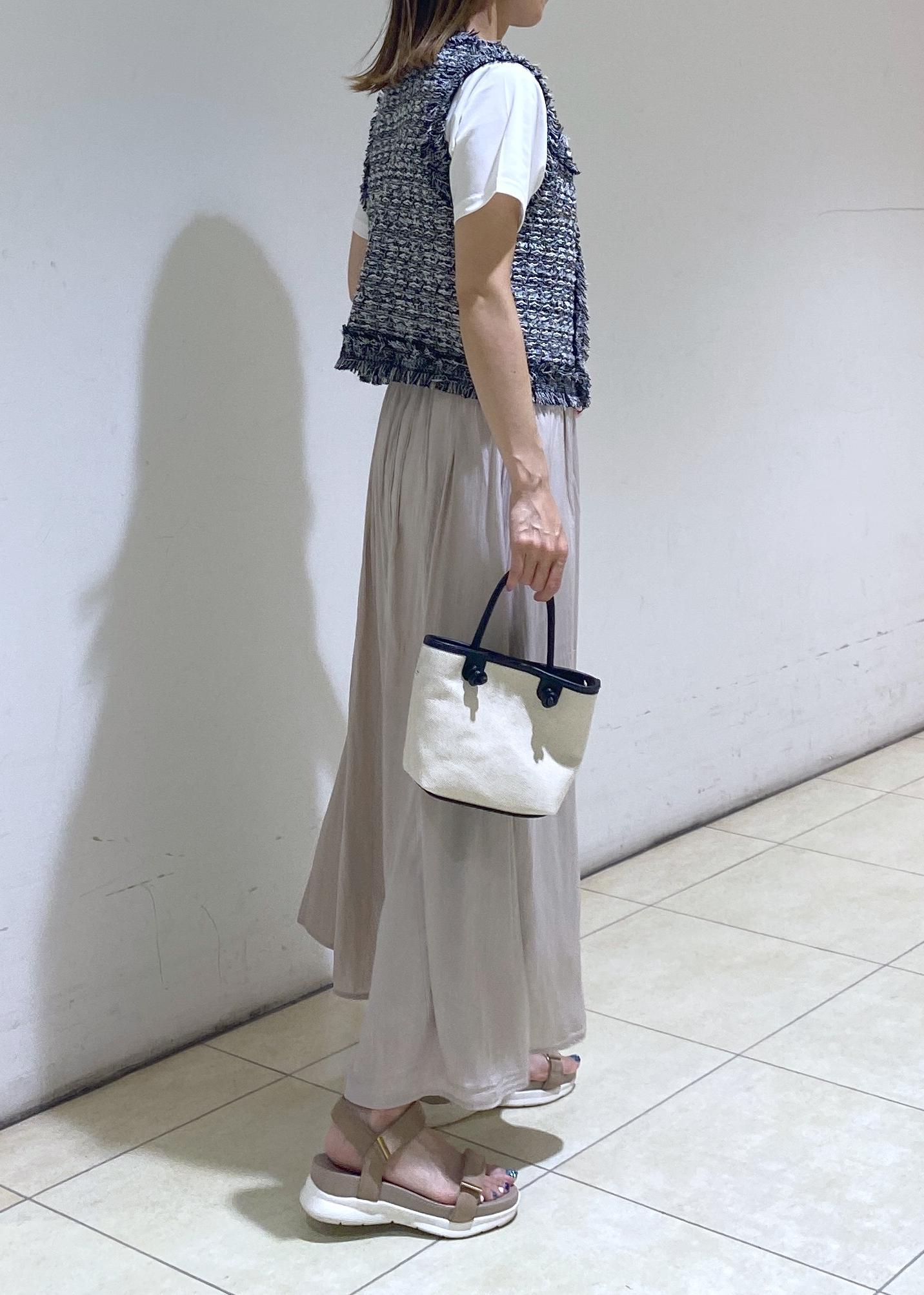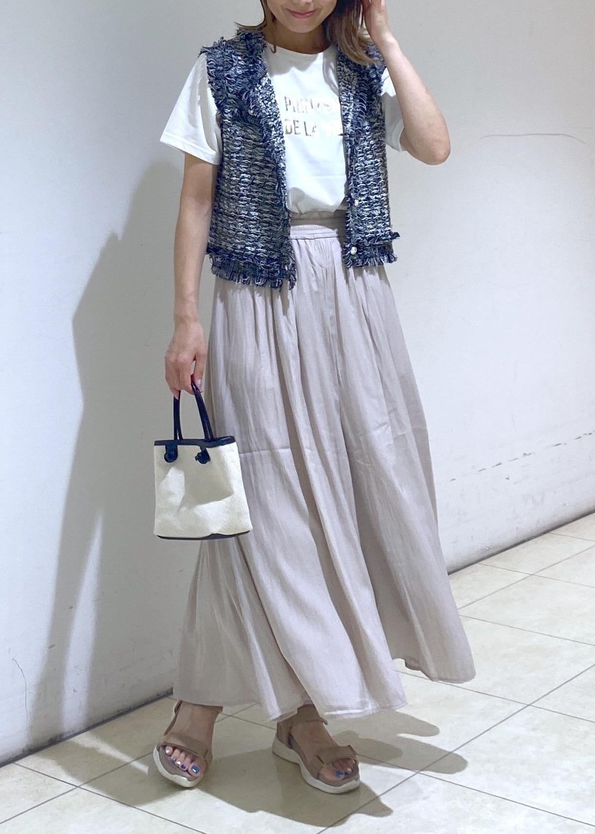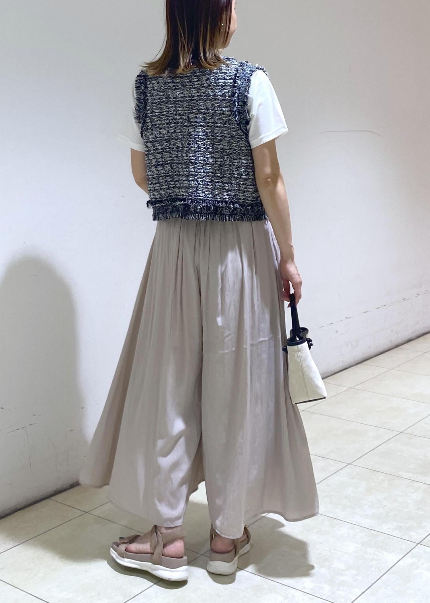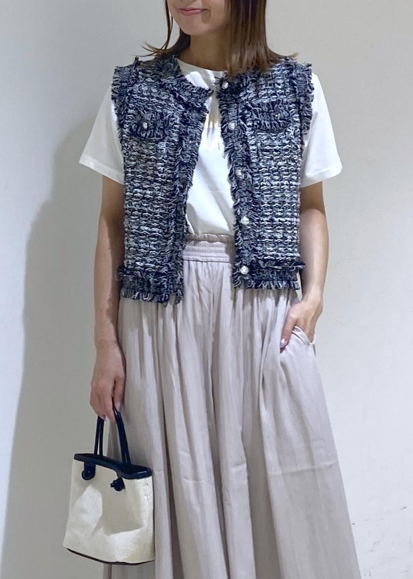 ブラックのツイードジレにTシャツを重ねたレイヤードコーデ。