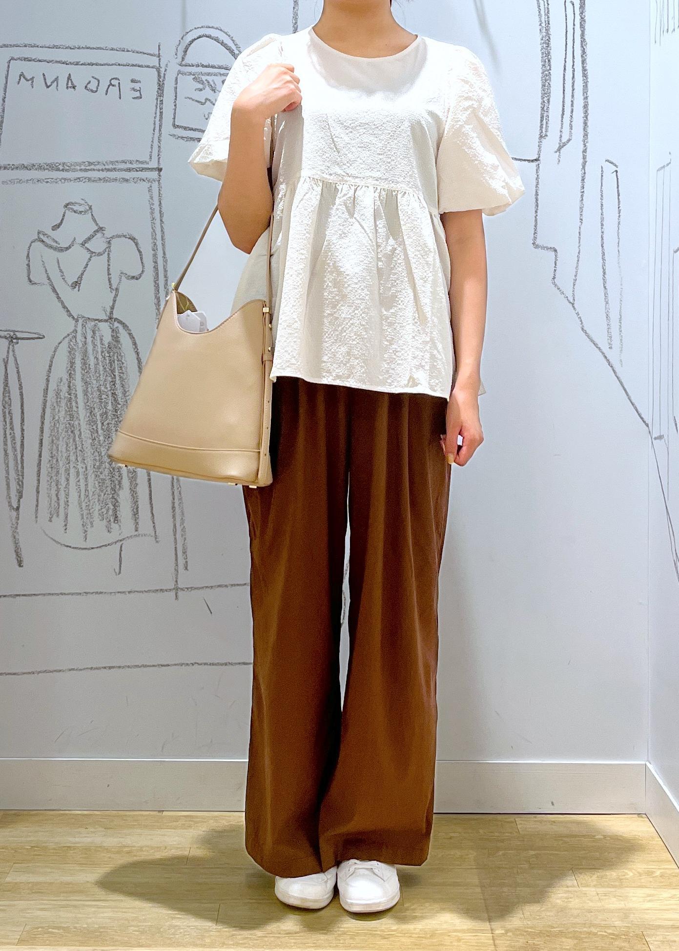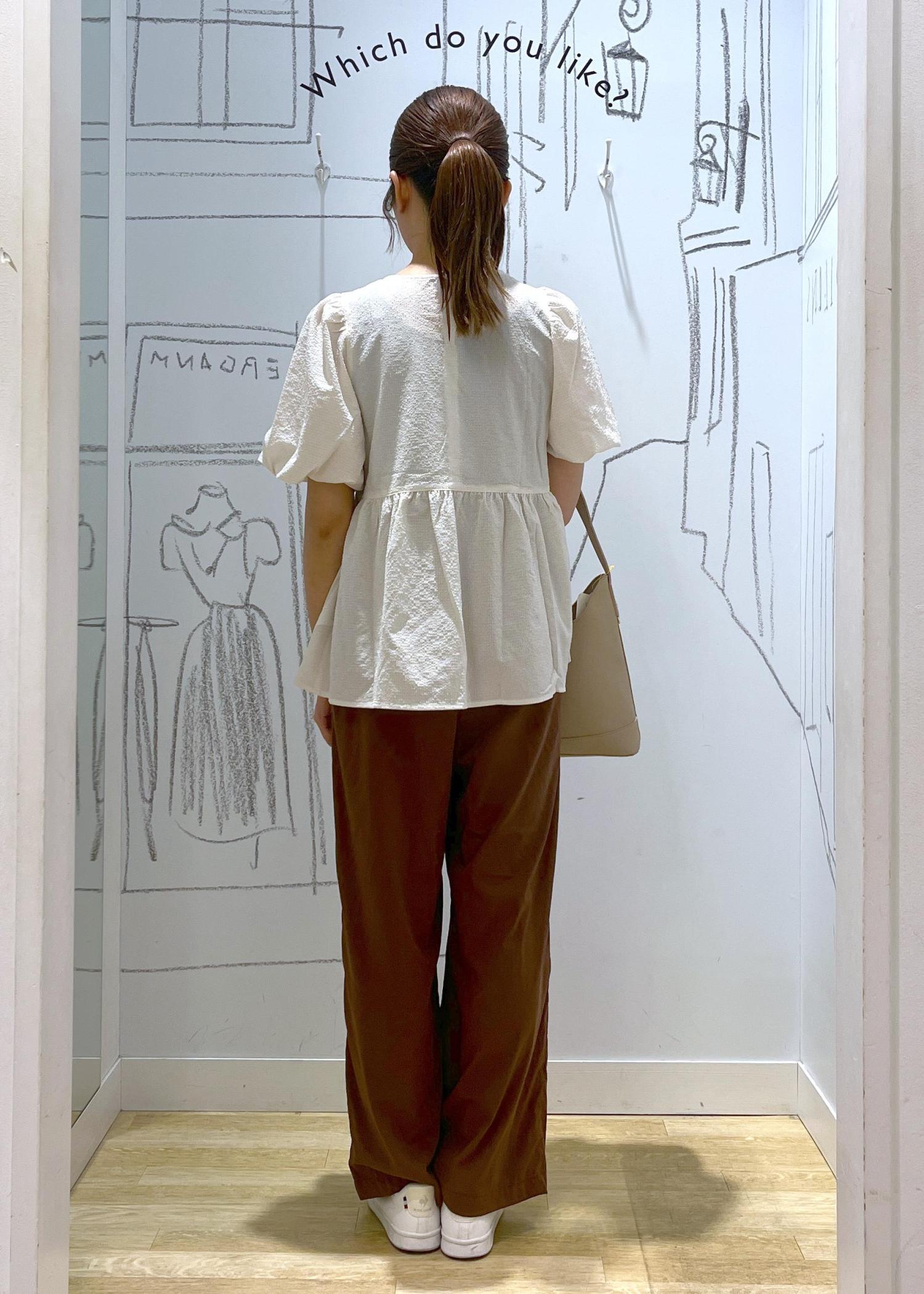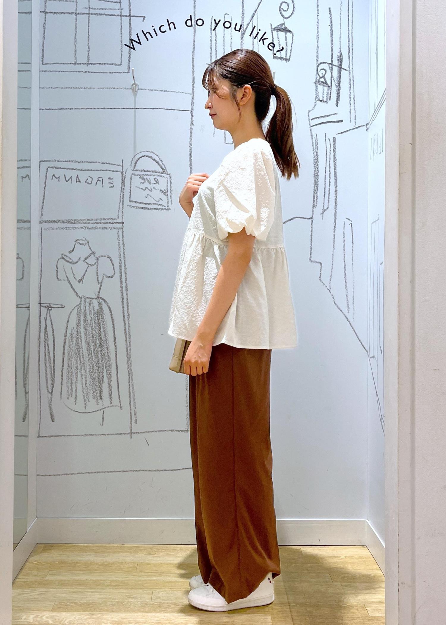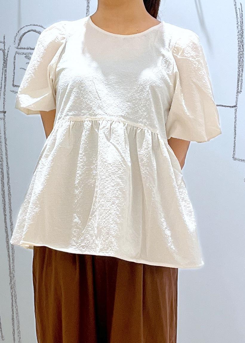 ペプラムシルエットとバルーンな袖がかわいいポイントです。生地感もサラリと夏でも着心地が良く、透け感は黒を中に着ると感じます。