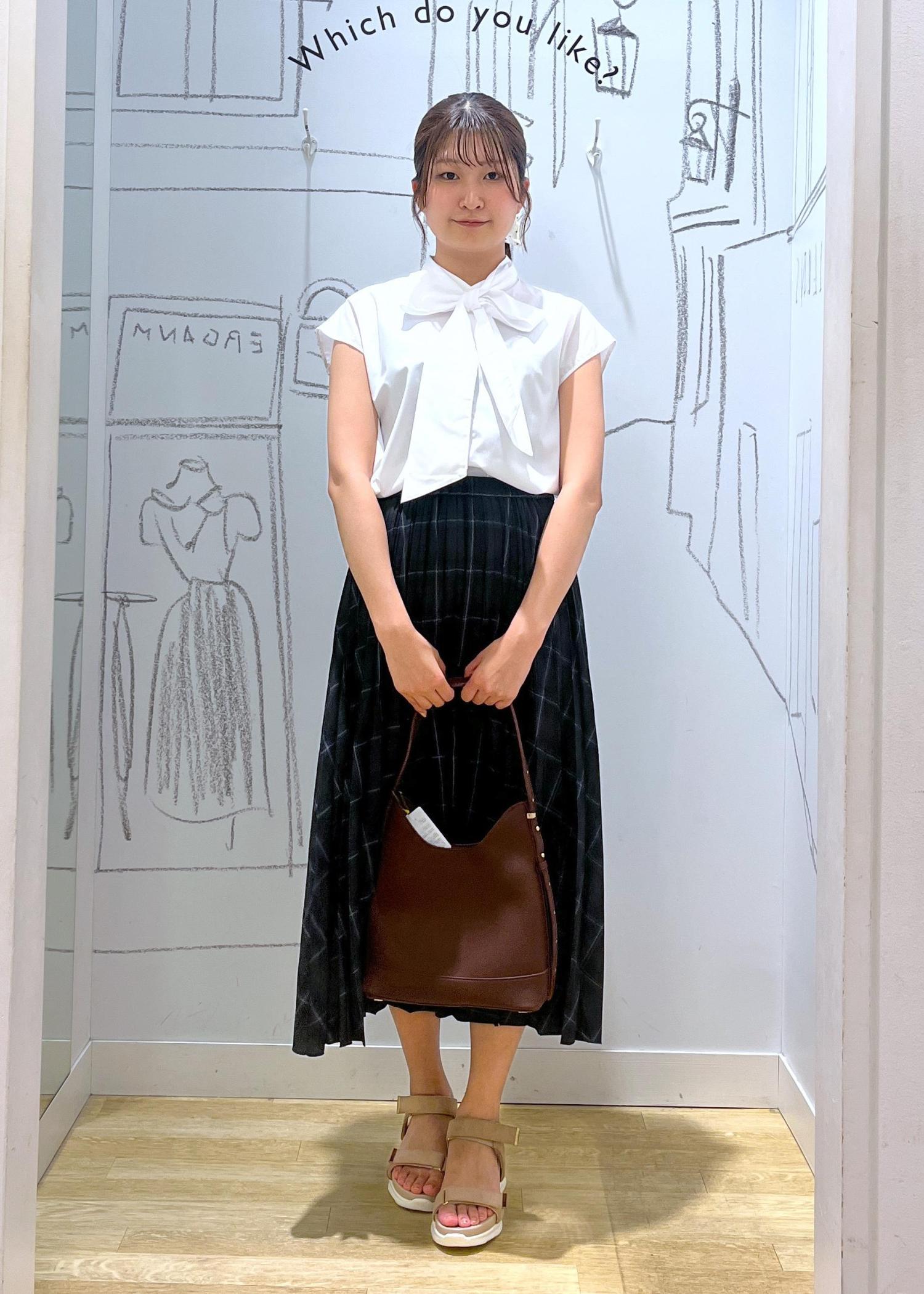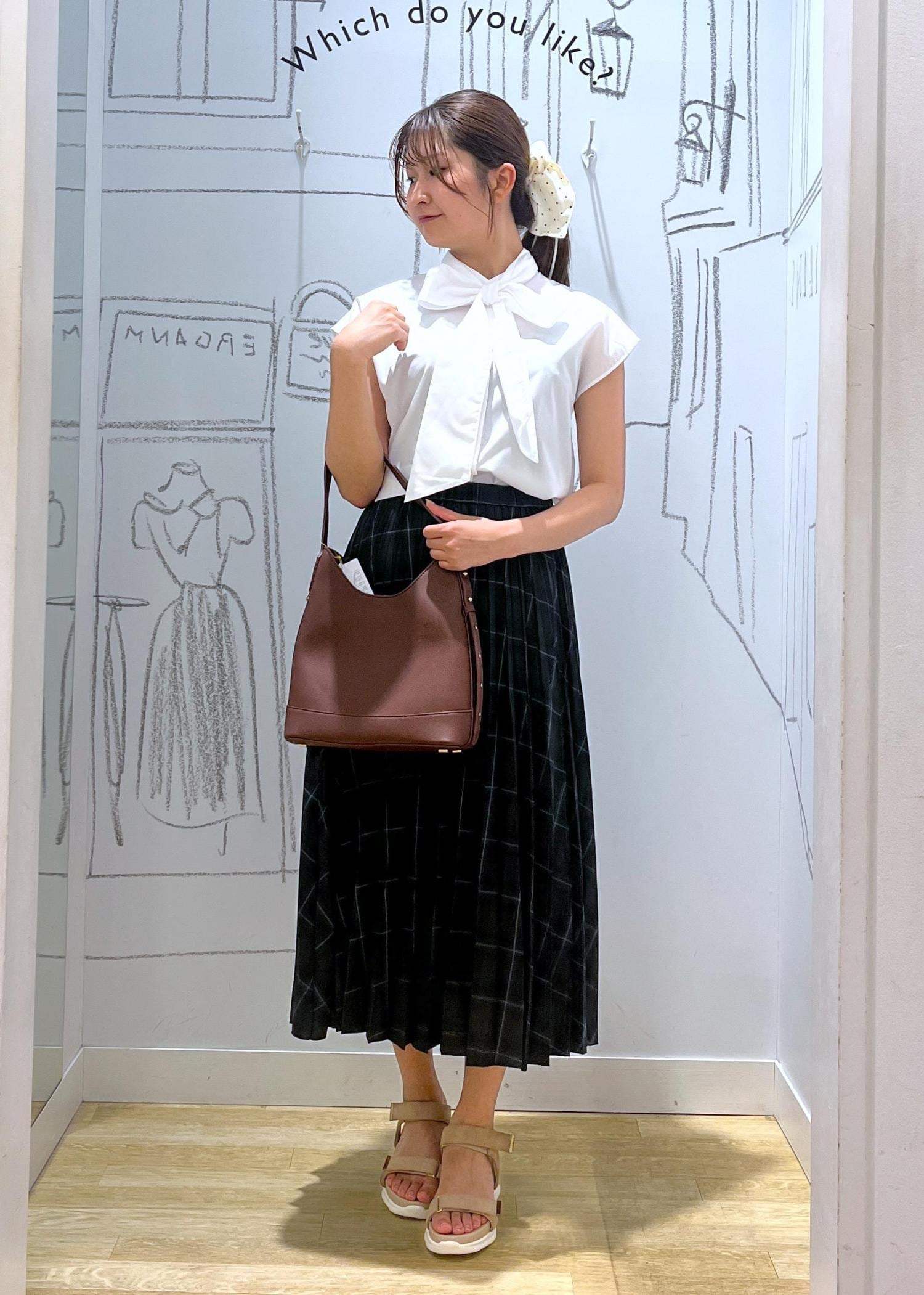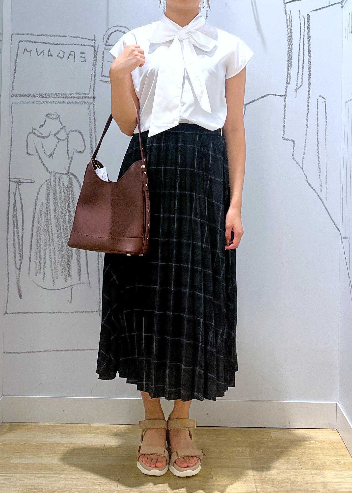 秋感を感じられるチェック柄×リボンがアクセントのボウタイブラウスを組み合わせてみました。大人っぽさもかわいさも両方とり入れ女性の上品さもアップ⤴︎⤴︎