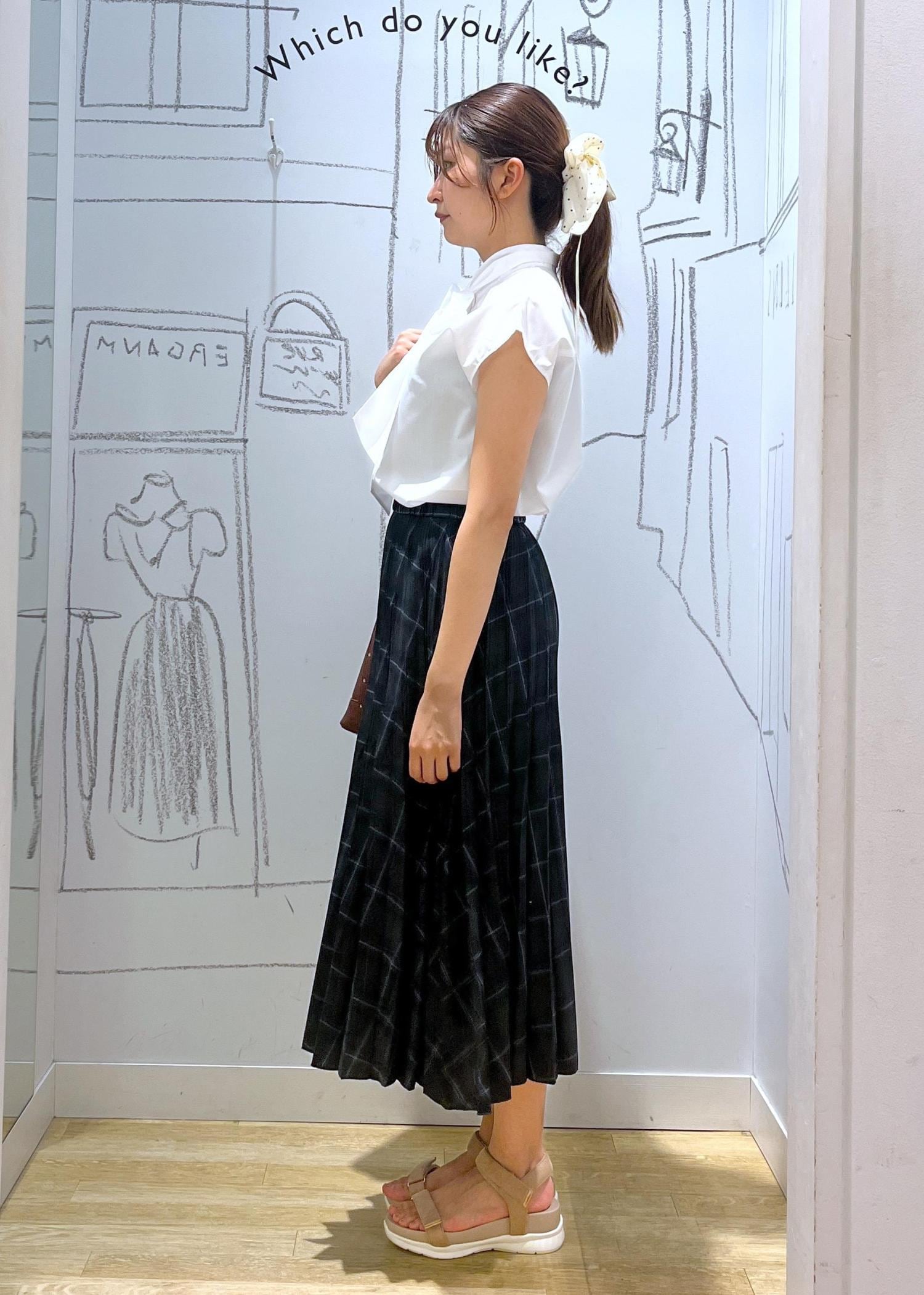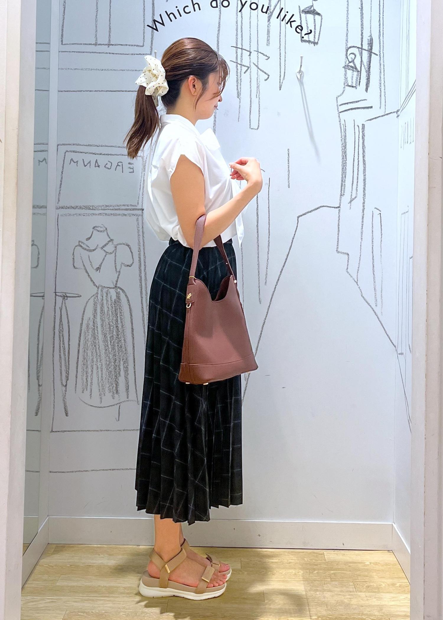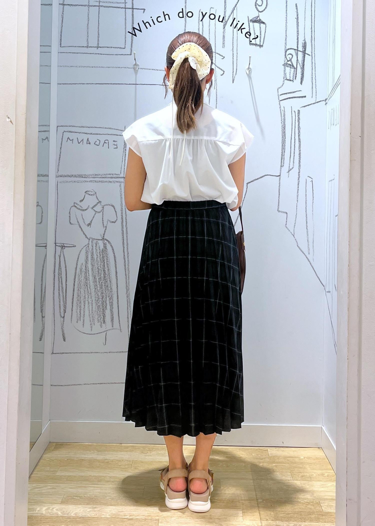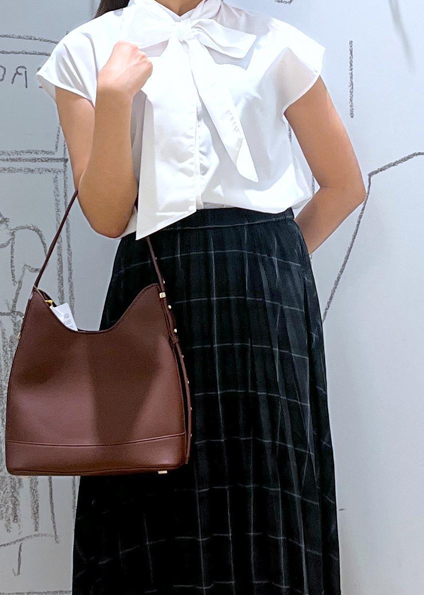 秋感を感じられるチェック柄×リボンがアクセントのボウタイブラウスを組み合わせてみました。大人っぽさもかわいさも両方とり入れ女性の上品さもアップ⤴︎⤴︎