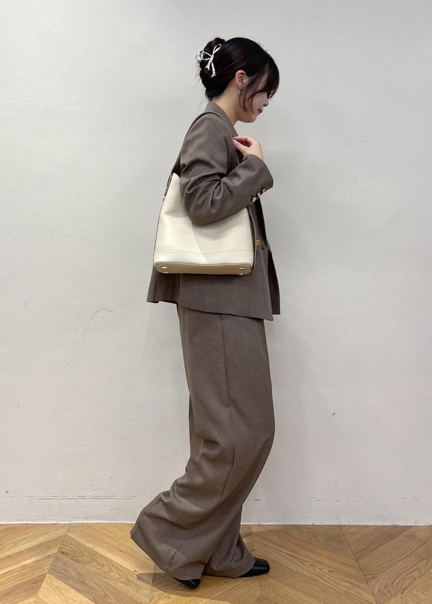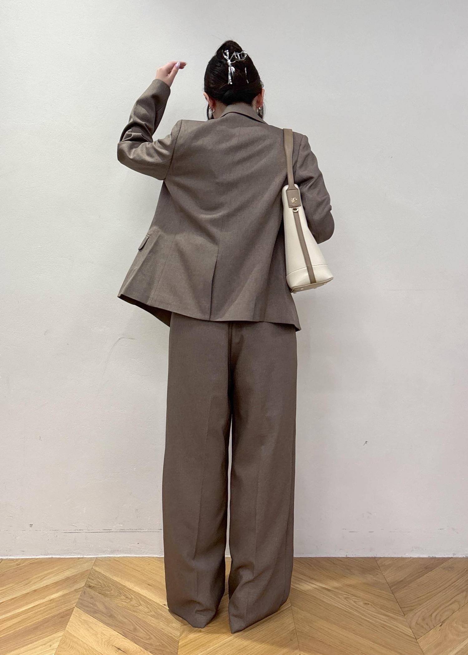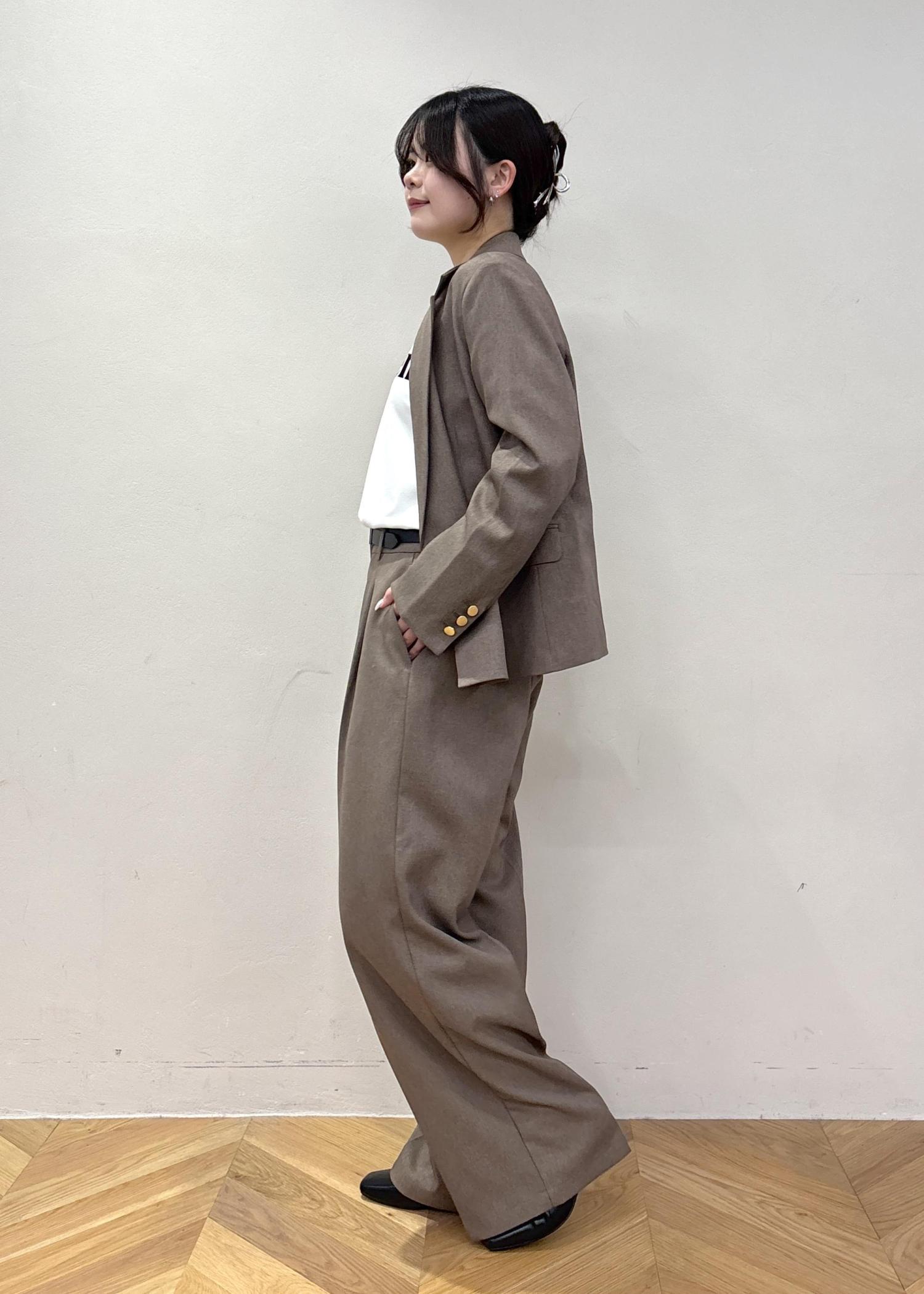 柔らかなブラウンカラーが今年らしいセットアップ。オフィスづかいにもオススメです。