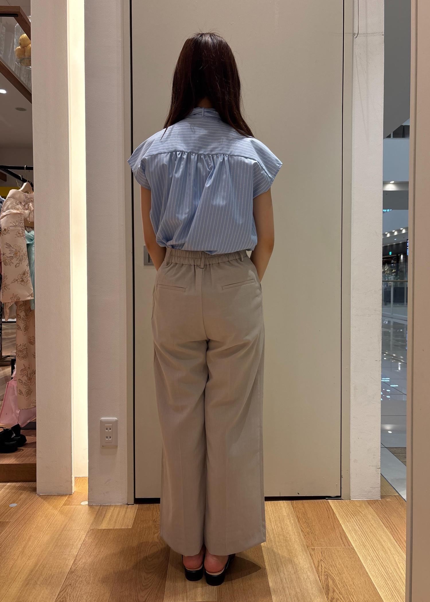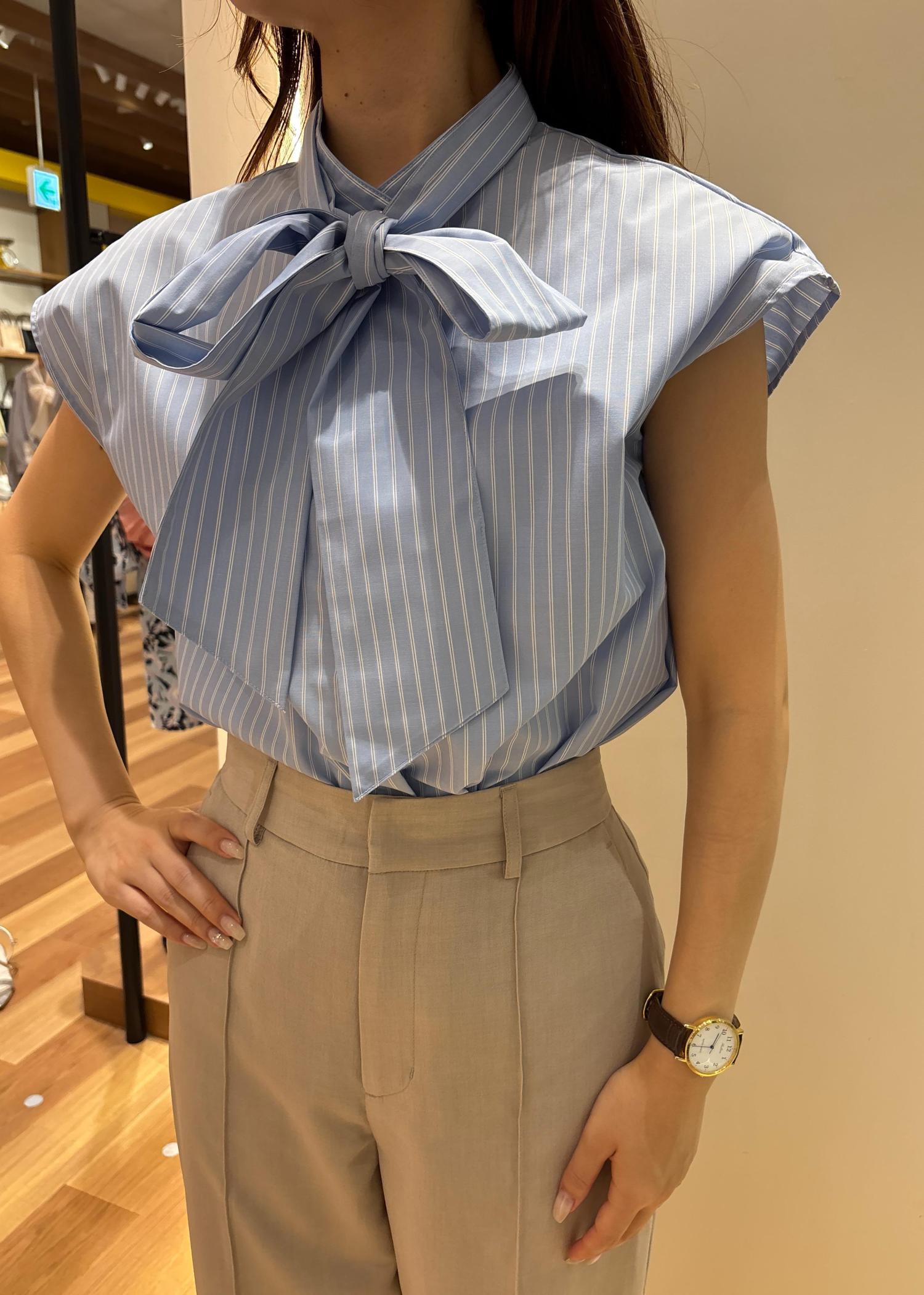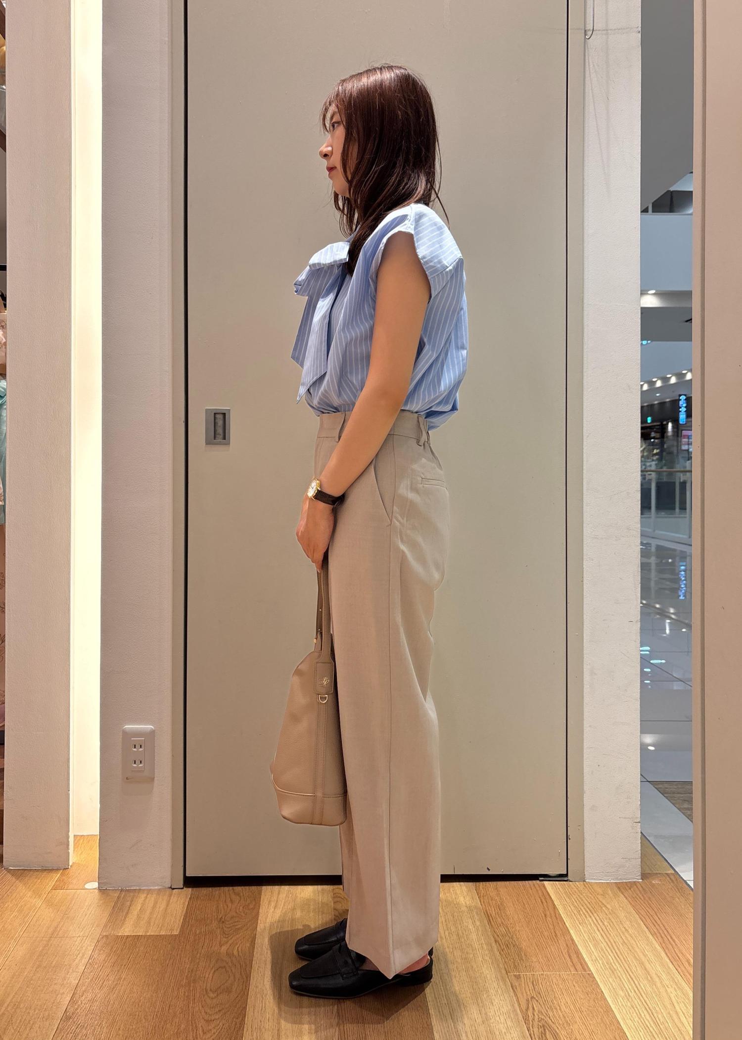 ブルーのストライプボウタイブラウスとベージュのパンツを合わせきれいめスタイルにしました。