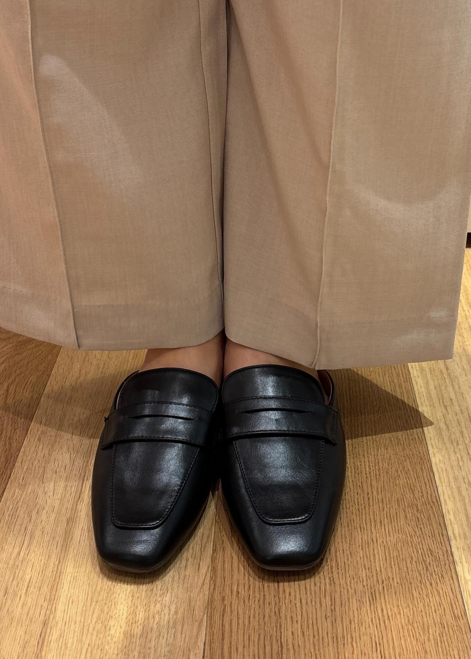 全体的に柔らかいカラーなので靴は黒のローファーミュールを合わせ締めました。