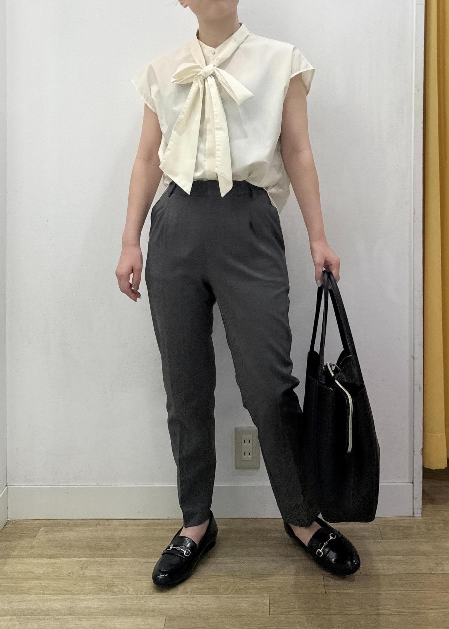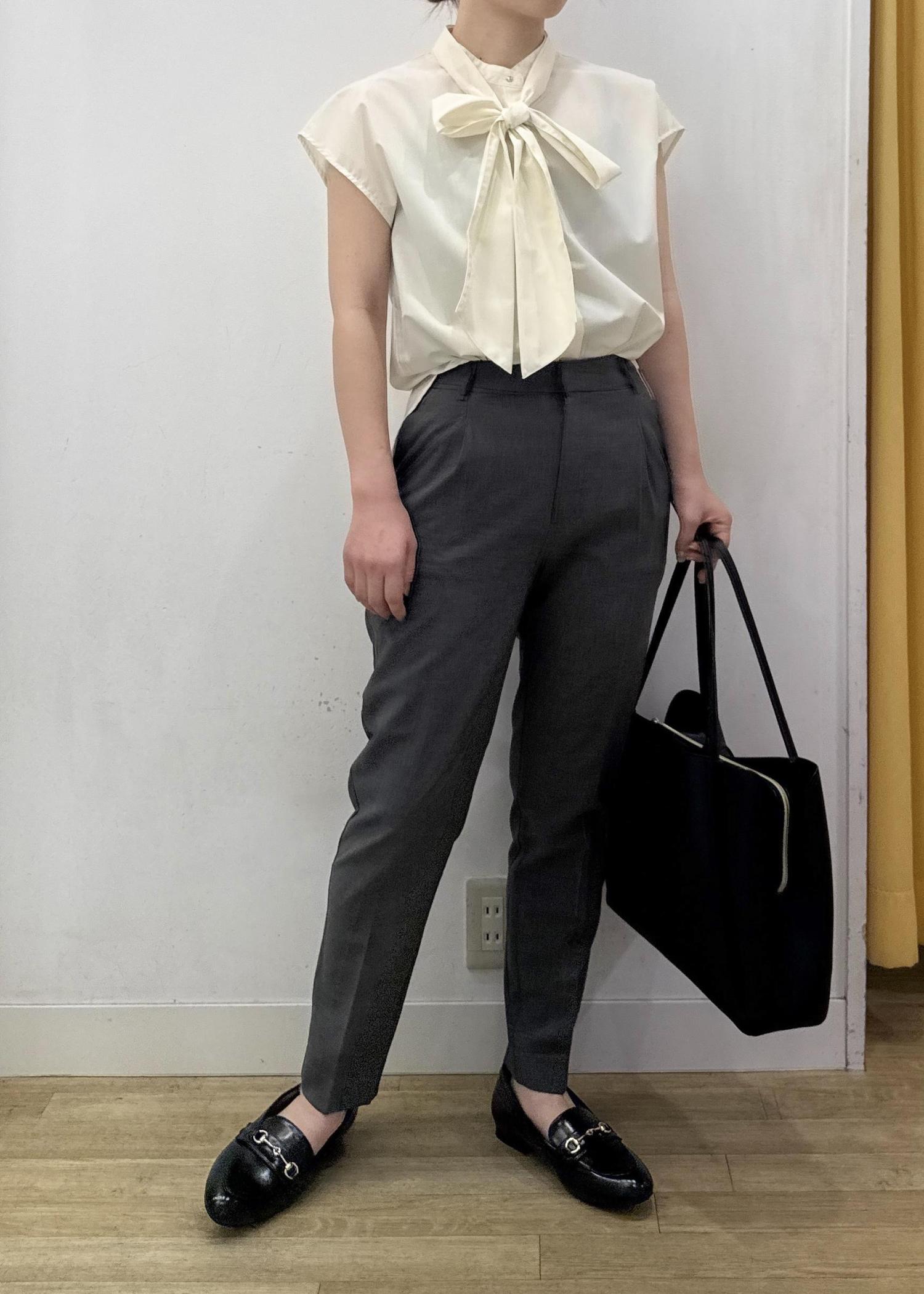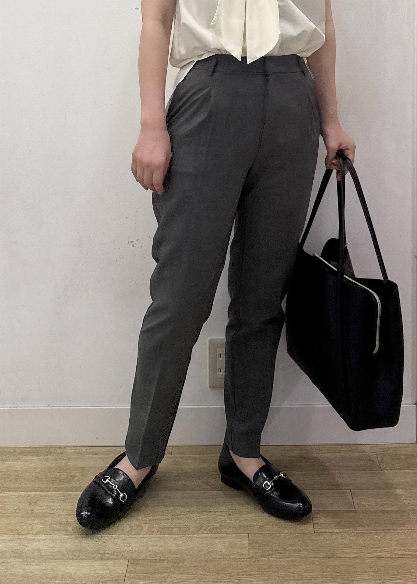 サラッと薄手の素材とスッキリとしたラインのテーパードパンツは夏のお仕事着にもオススメです。 -