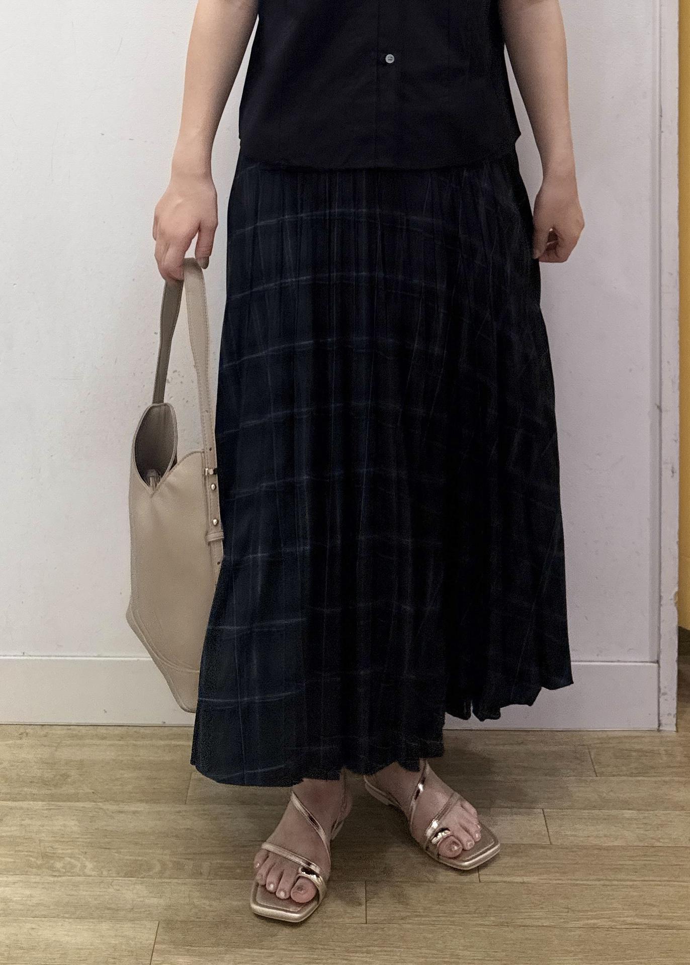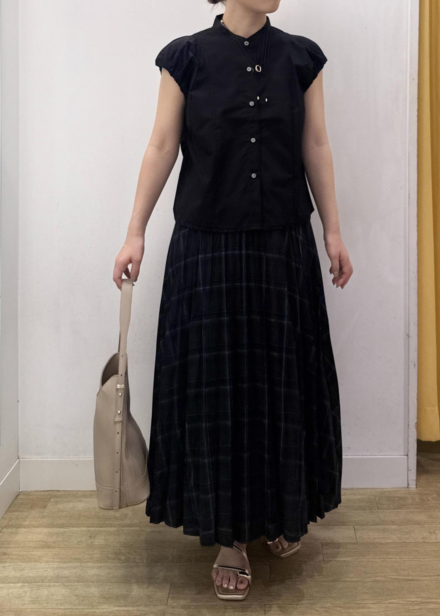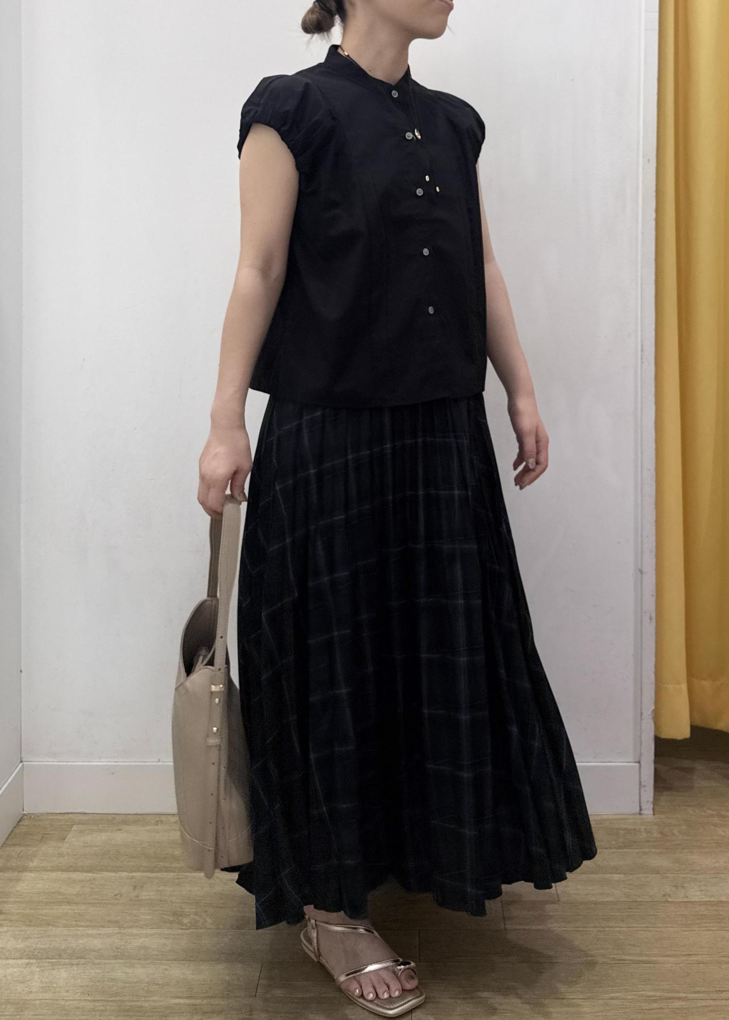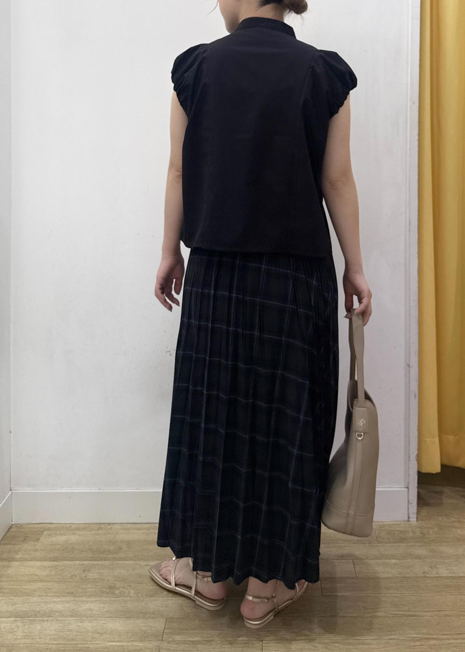 ブラックのブラウスに、深めのモスグリーンのチェック柄プリーツスカートを合わせた落ち着いたトーンのコーディネート!