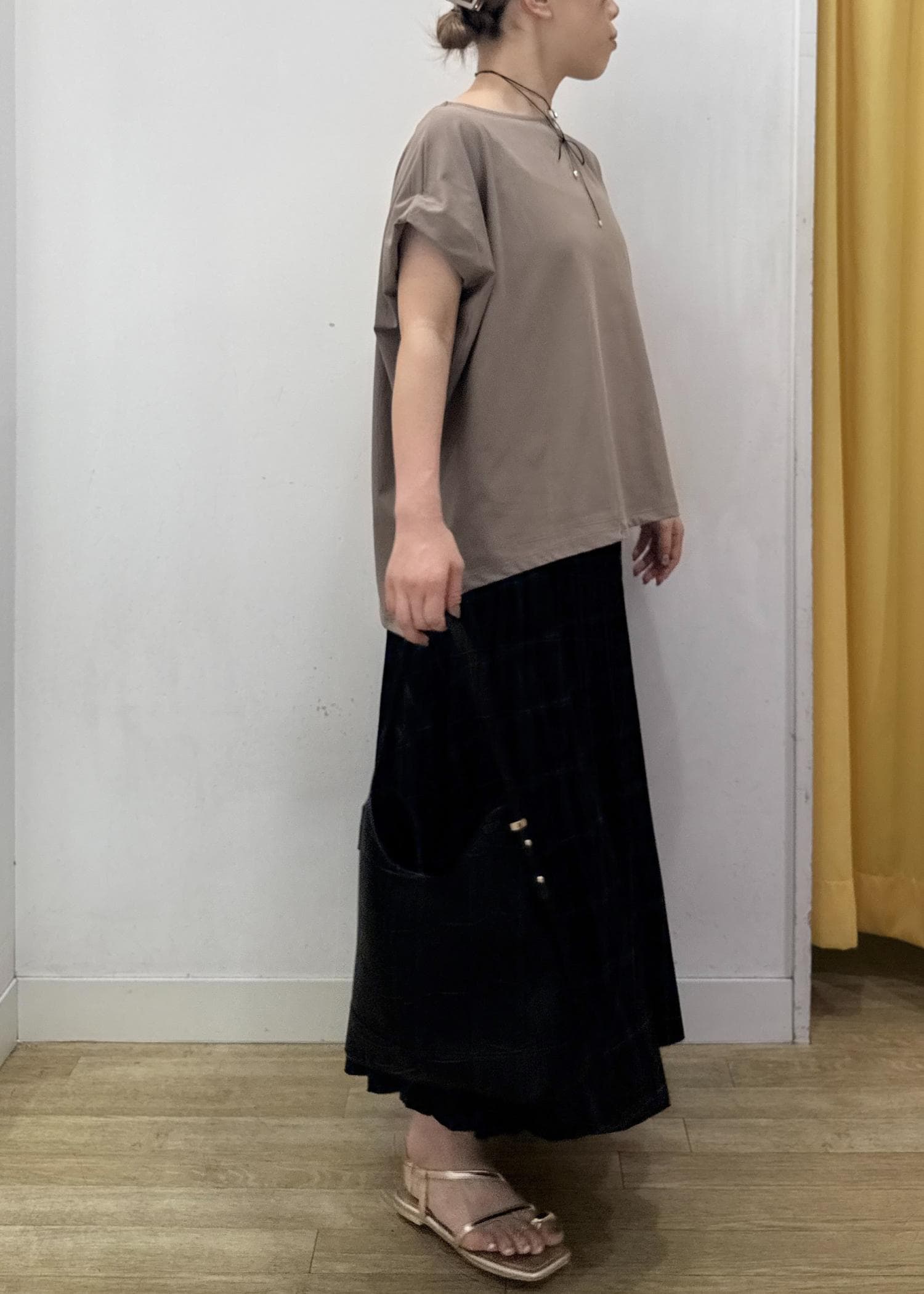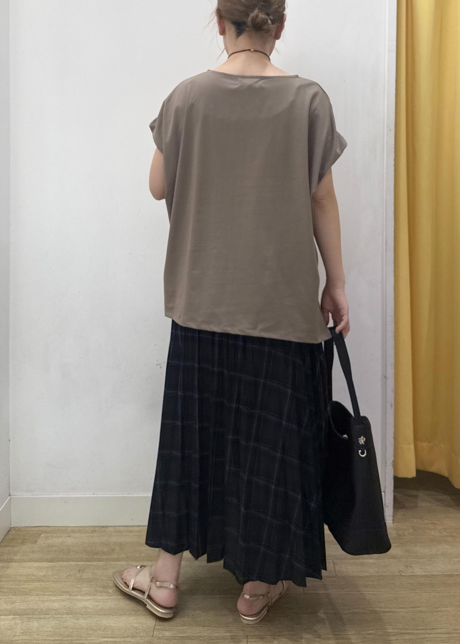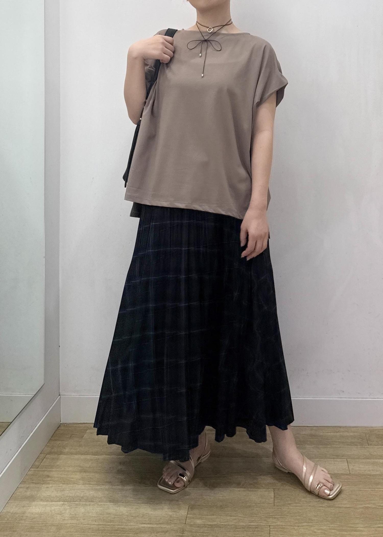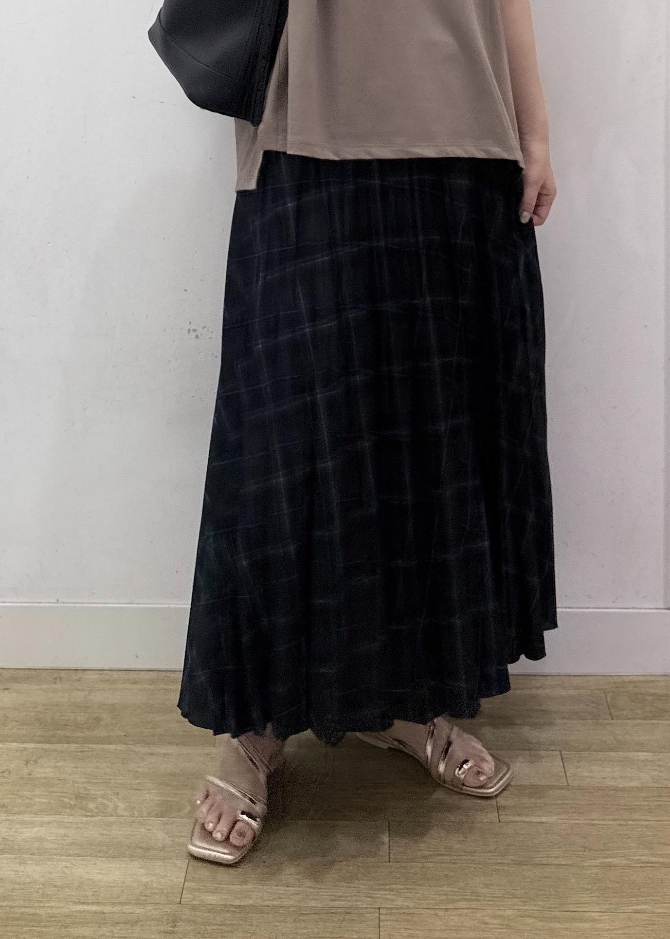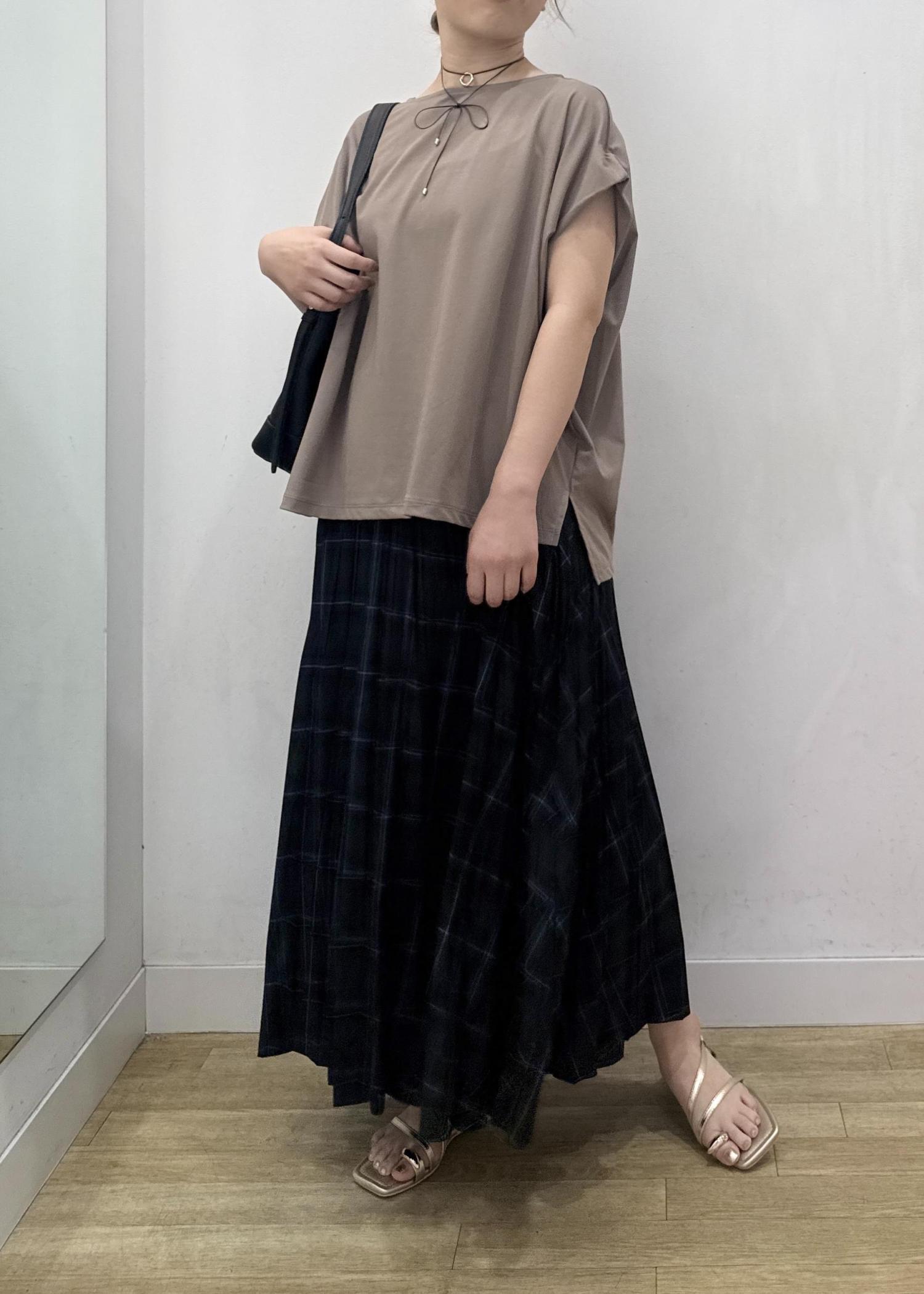 チェック柄のスカートは深めのグリーンカラーで、フェミニンですが大人な印象に!