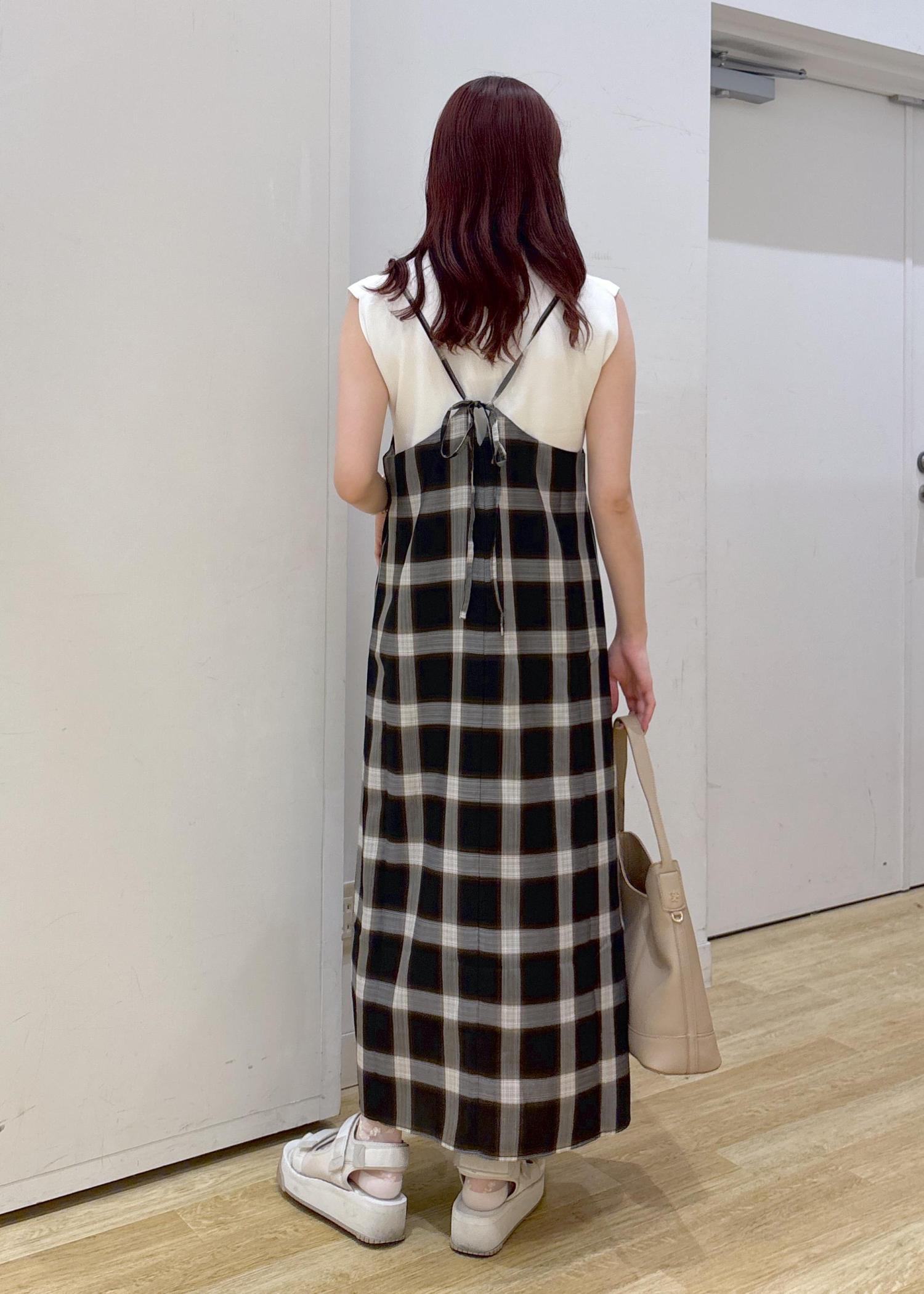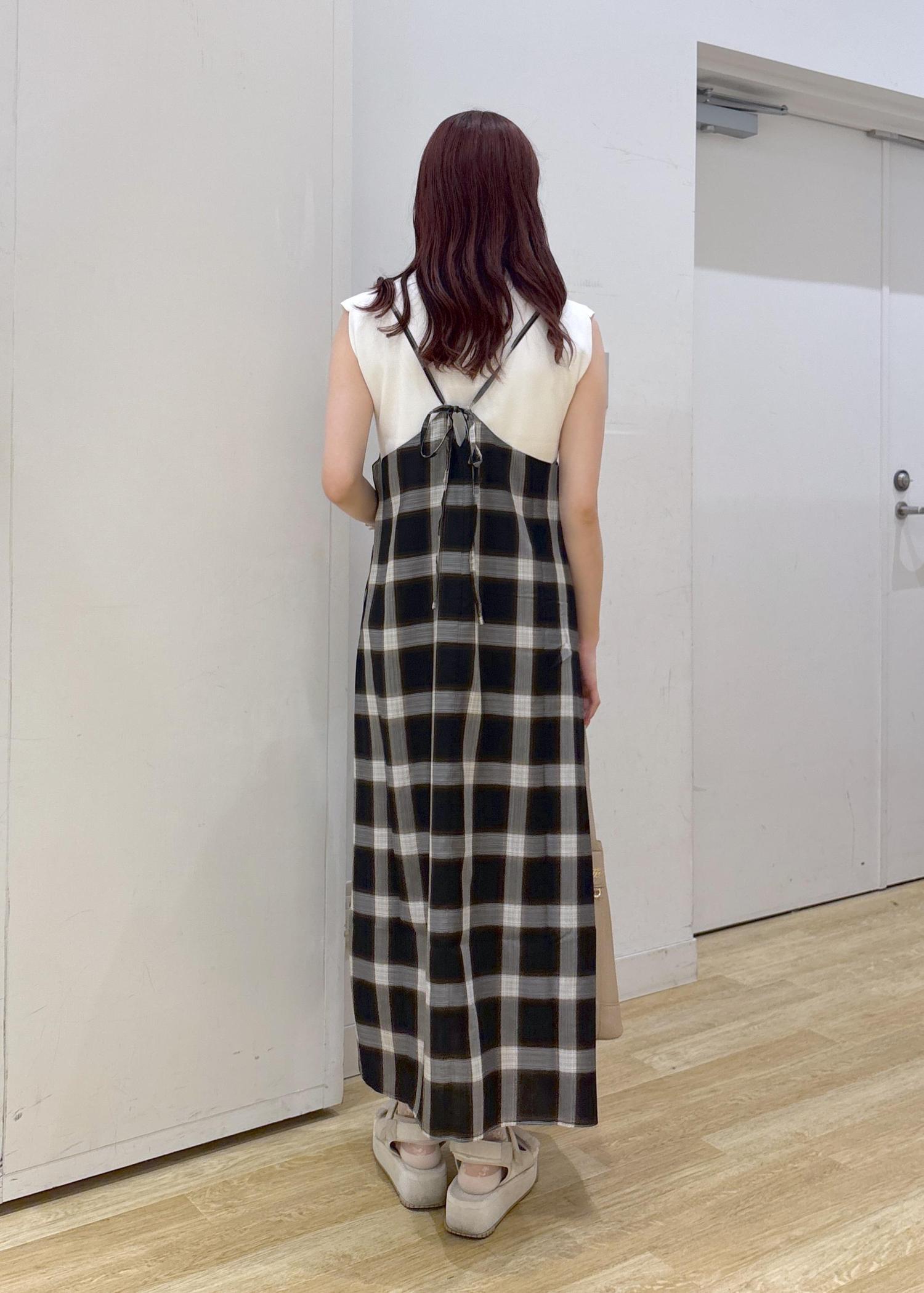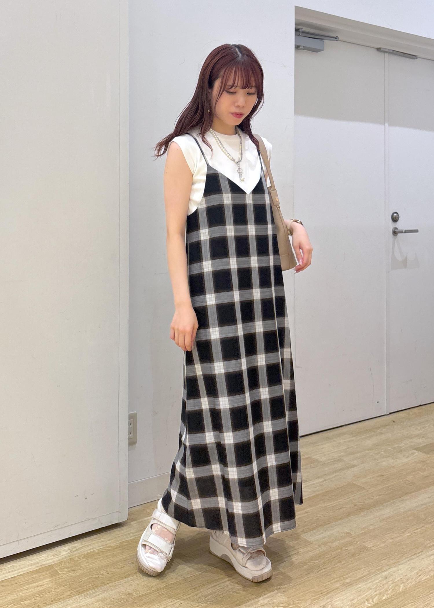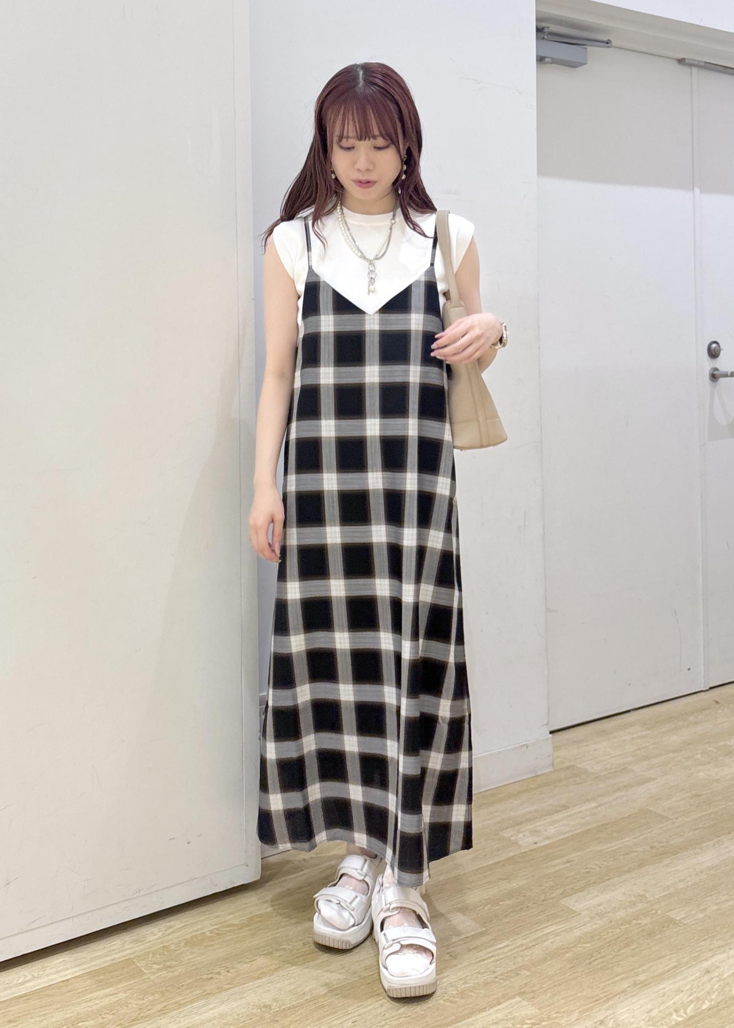 チェックのキャミワンピとホワイトのサマーニットを合わせて爽やかな夏コーデに仕上げました◎