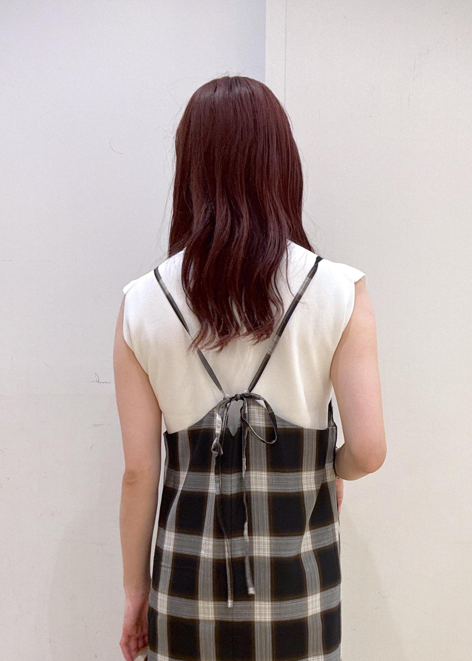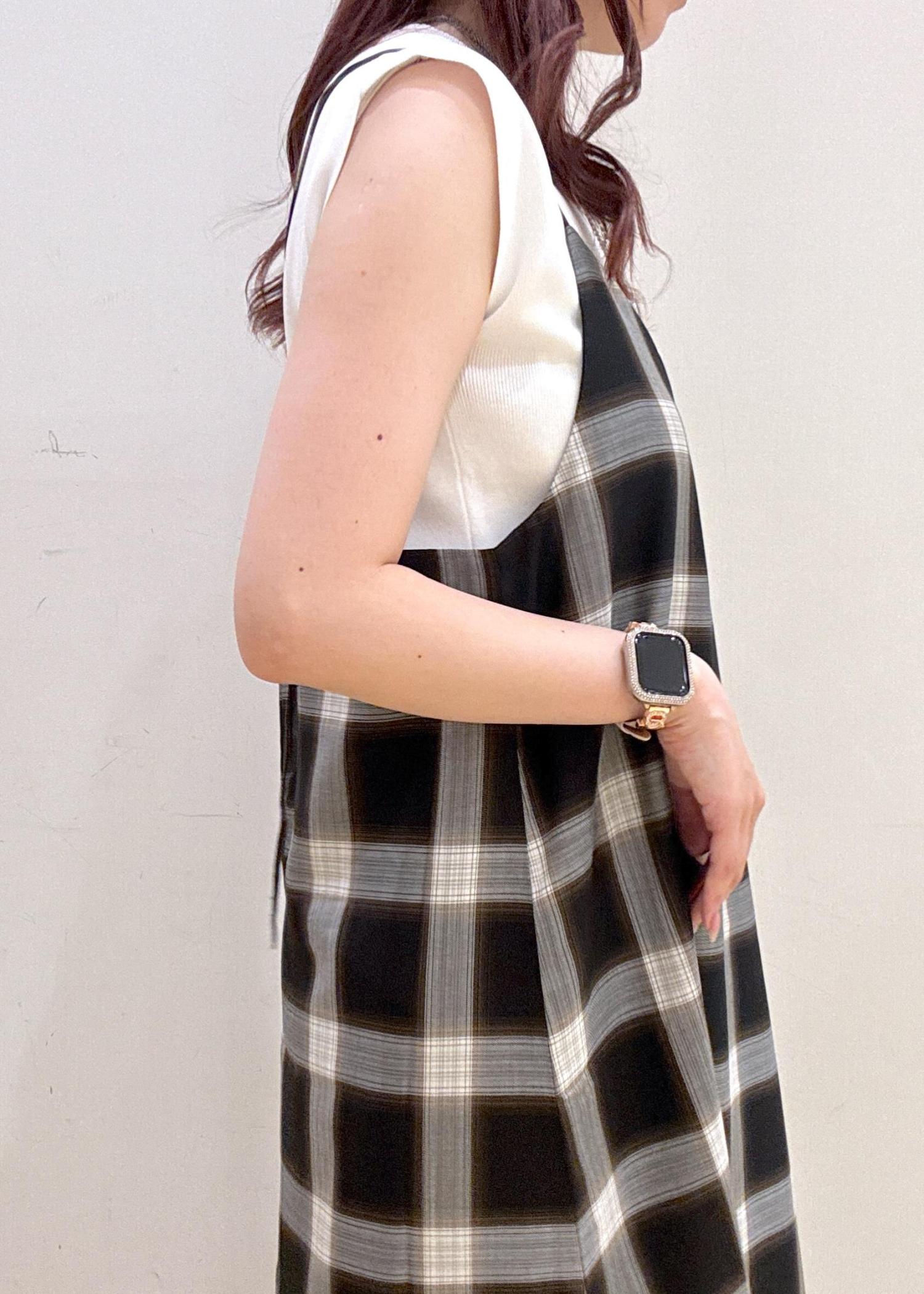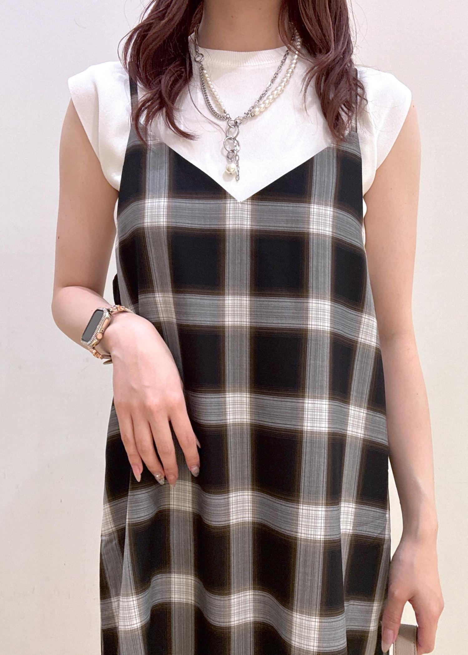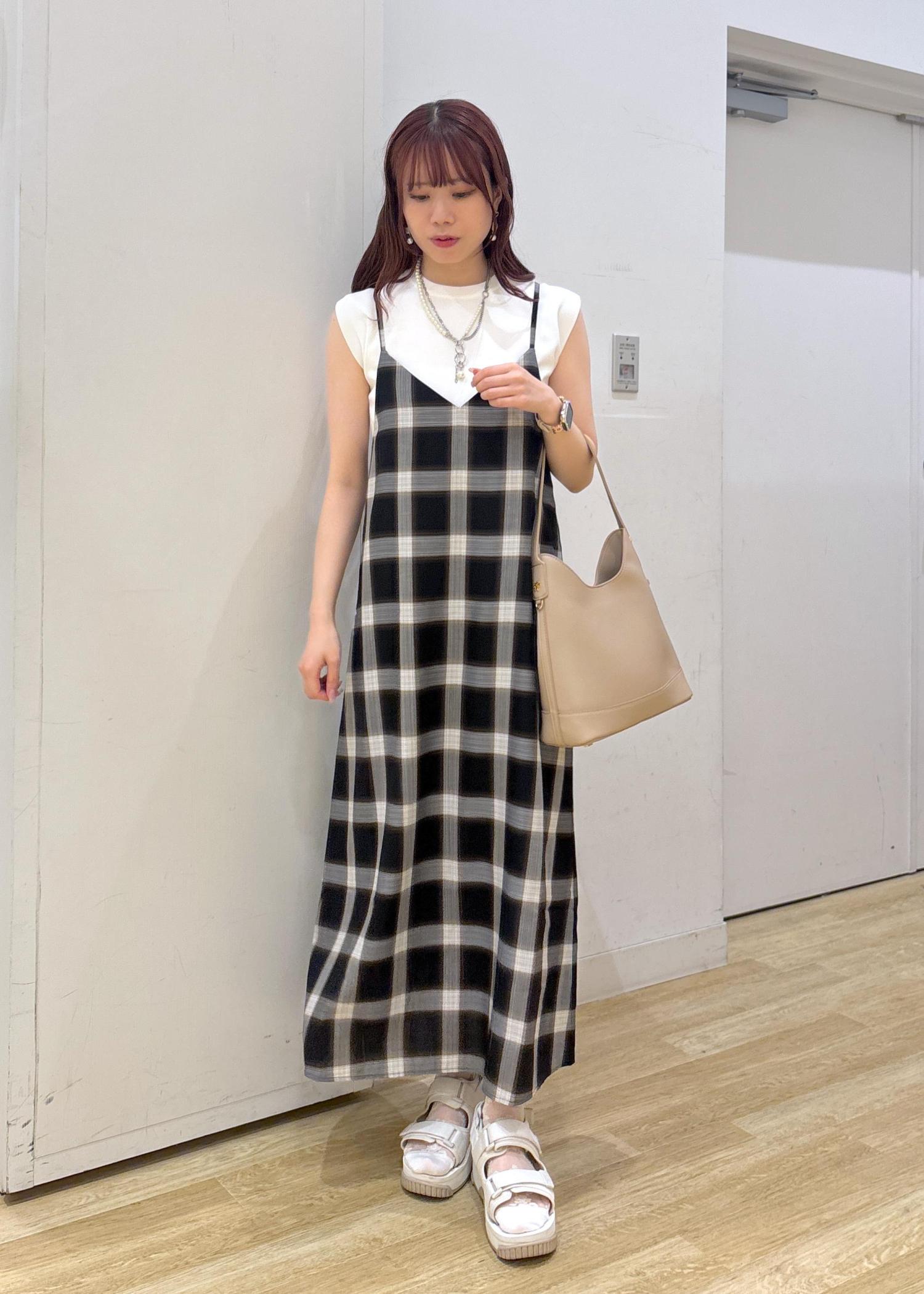 チェックのキャミワンピとホワイトのサマーニットを合わせて爽やかな夏コーデに仕上げました◎