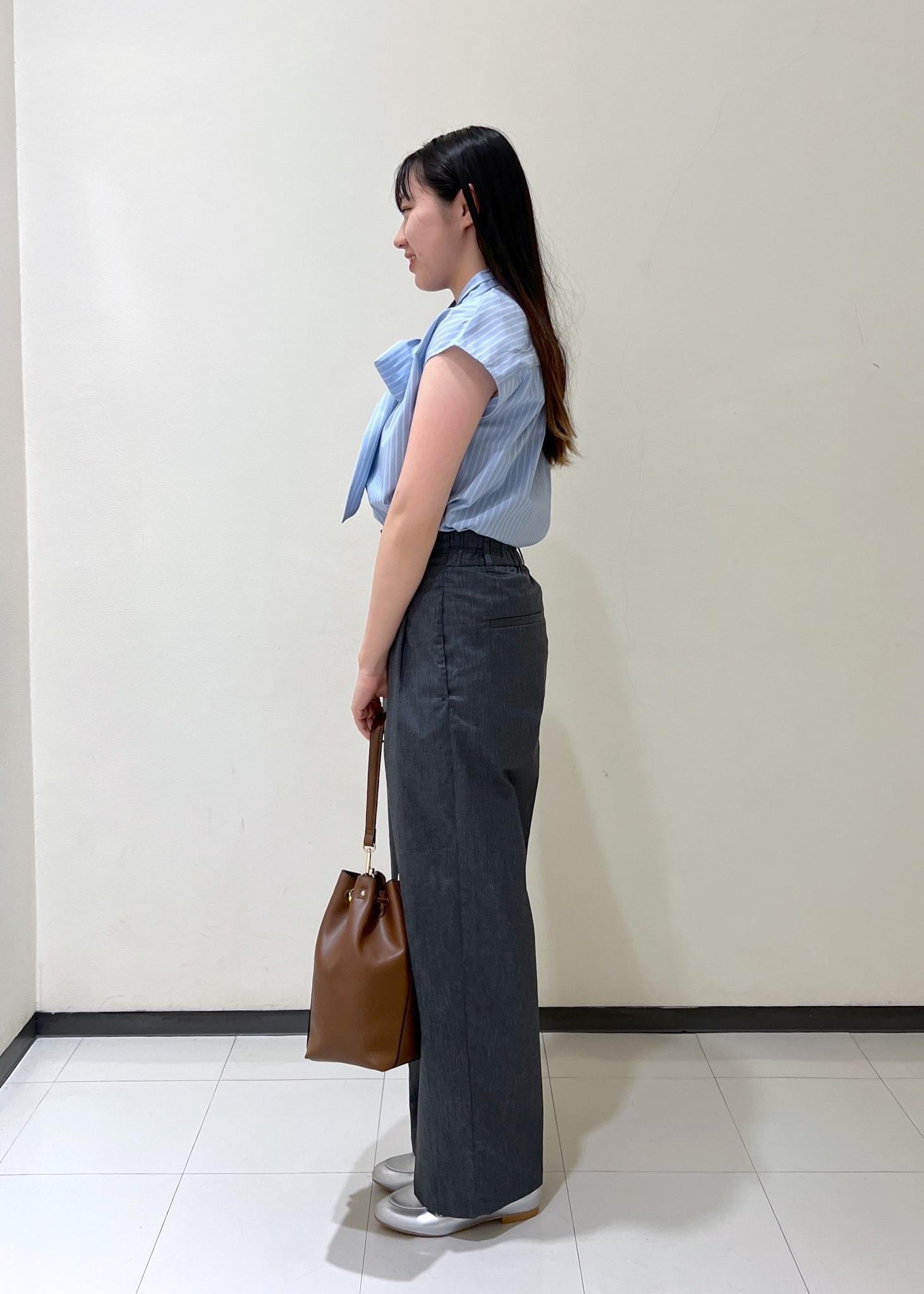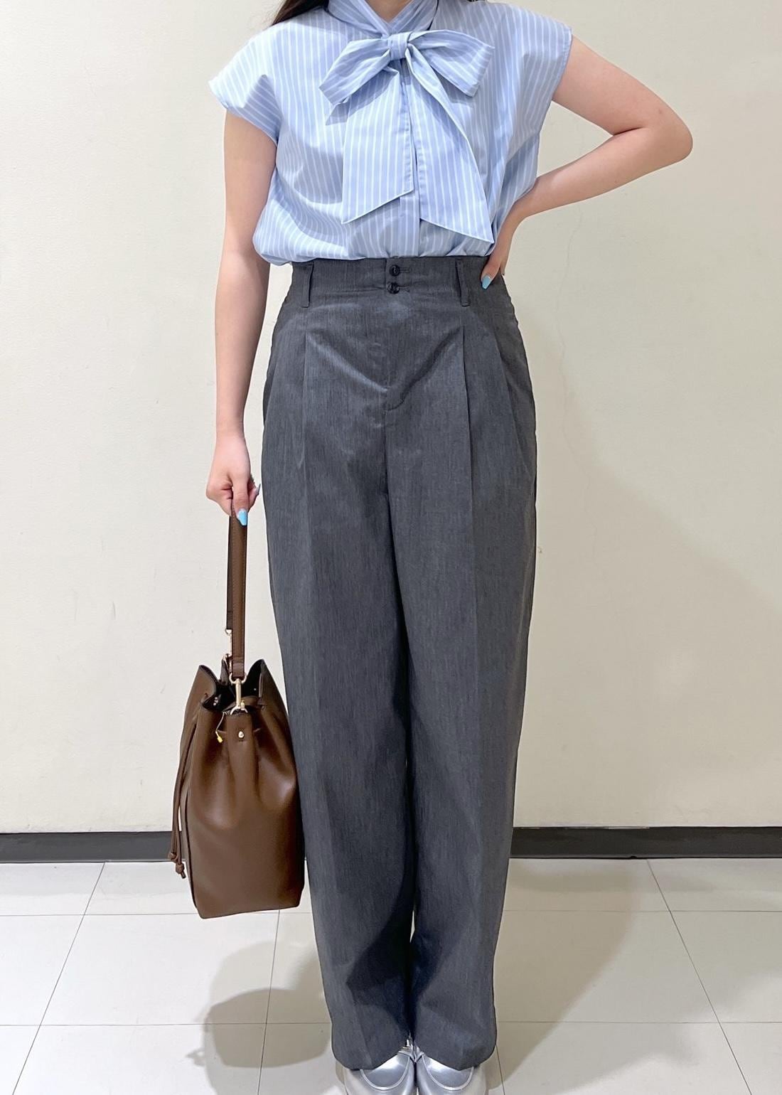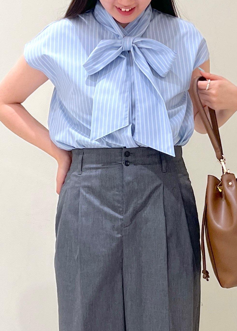 リボンスタイルで可愛らしい雰囲気なのでパンツと合わせることで甘すぎないコーディネートにしました。
