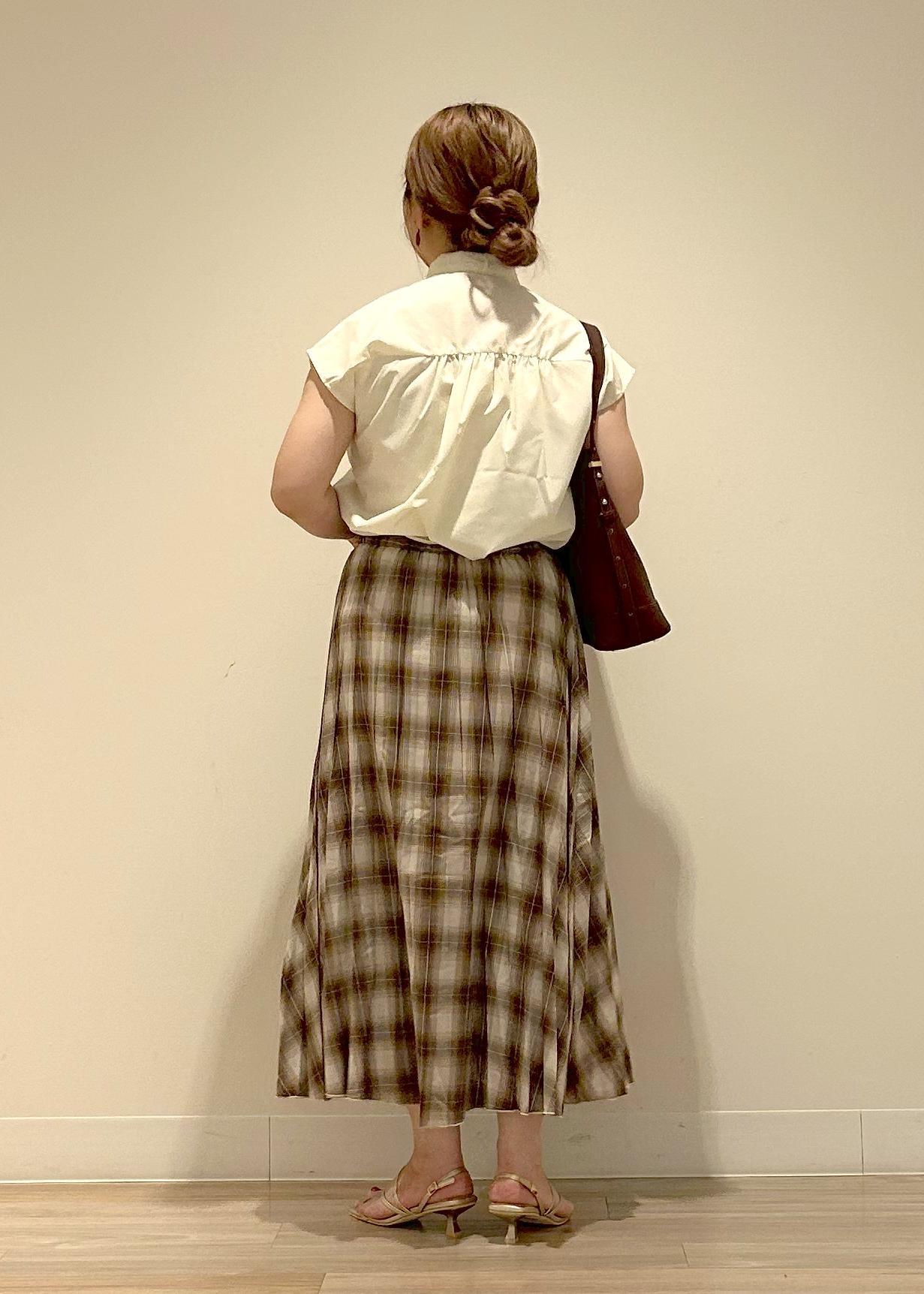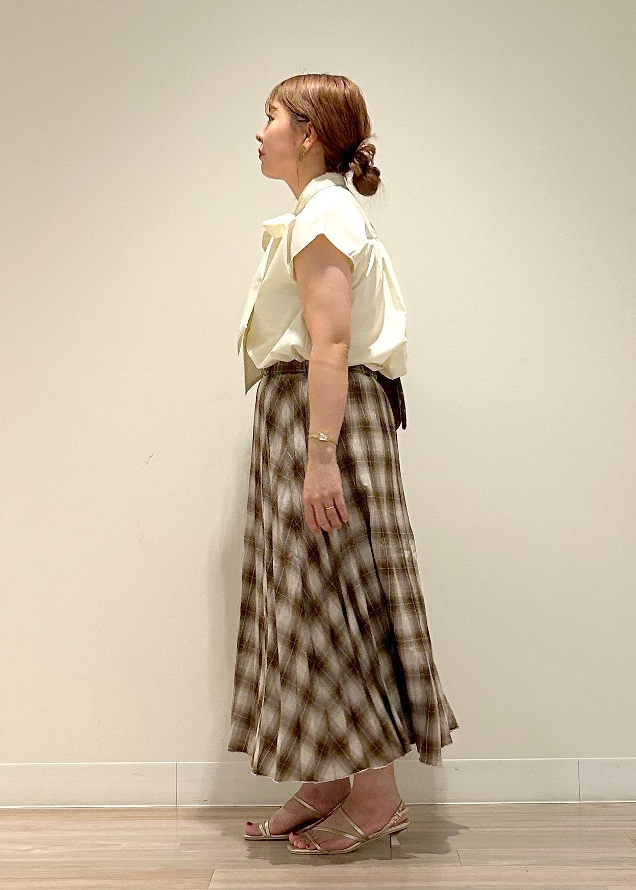 秋らしいチェックスカートに、イエローのブラウスで合わせニュアンスカラーのコーディネートにしました。